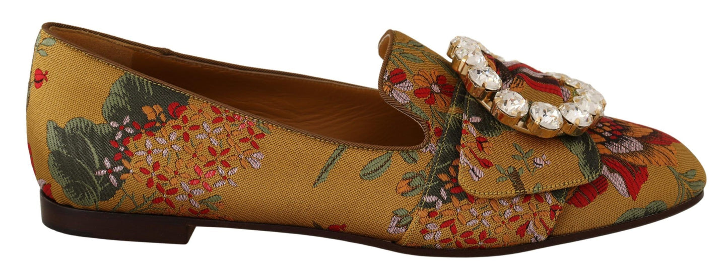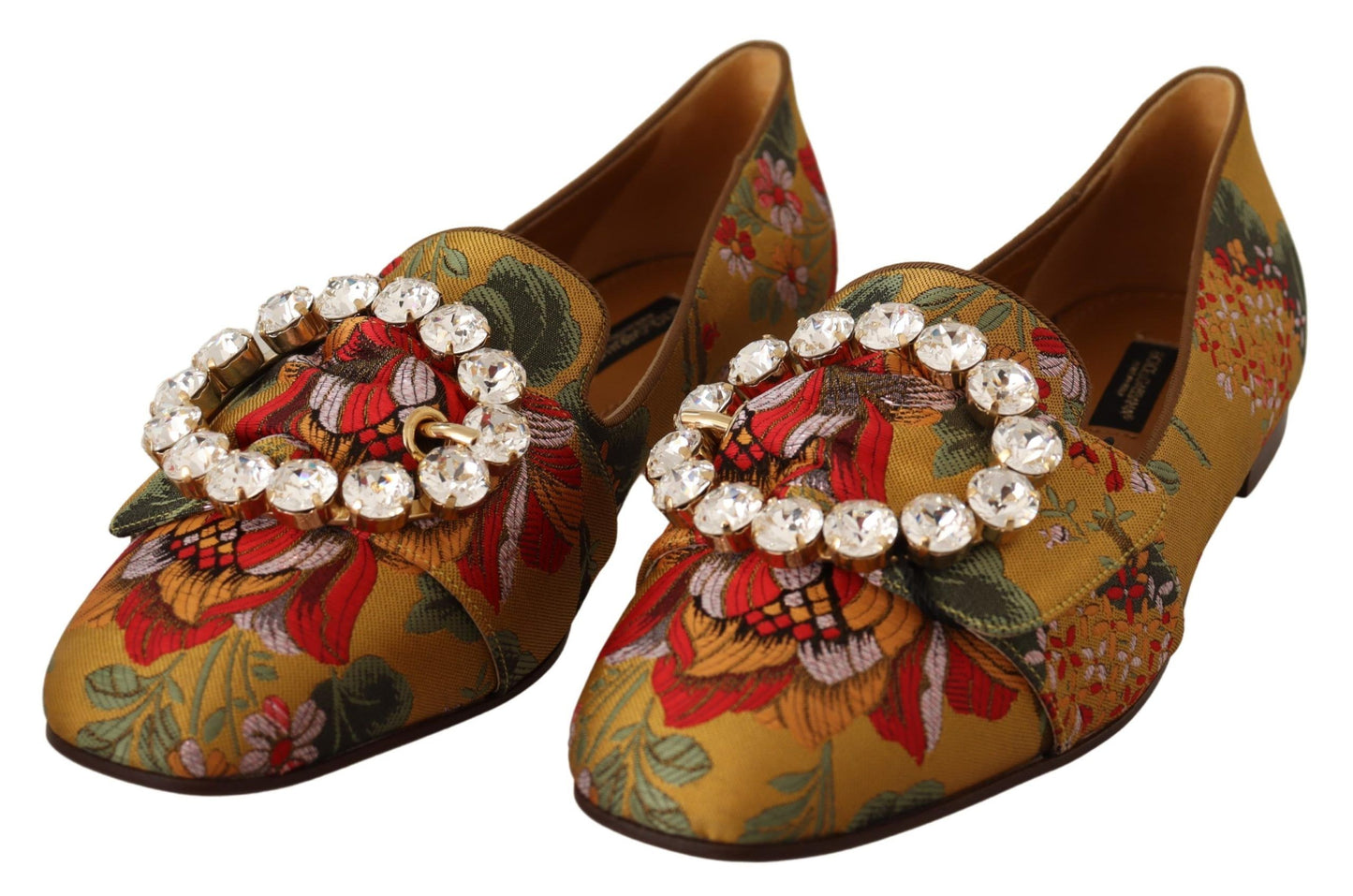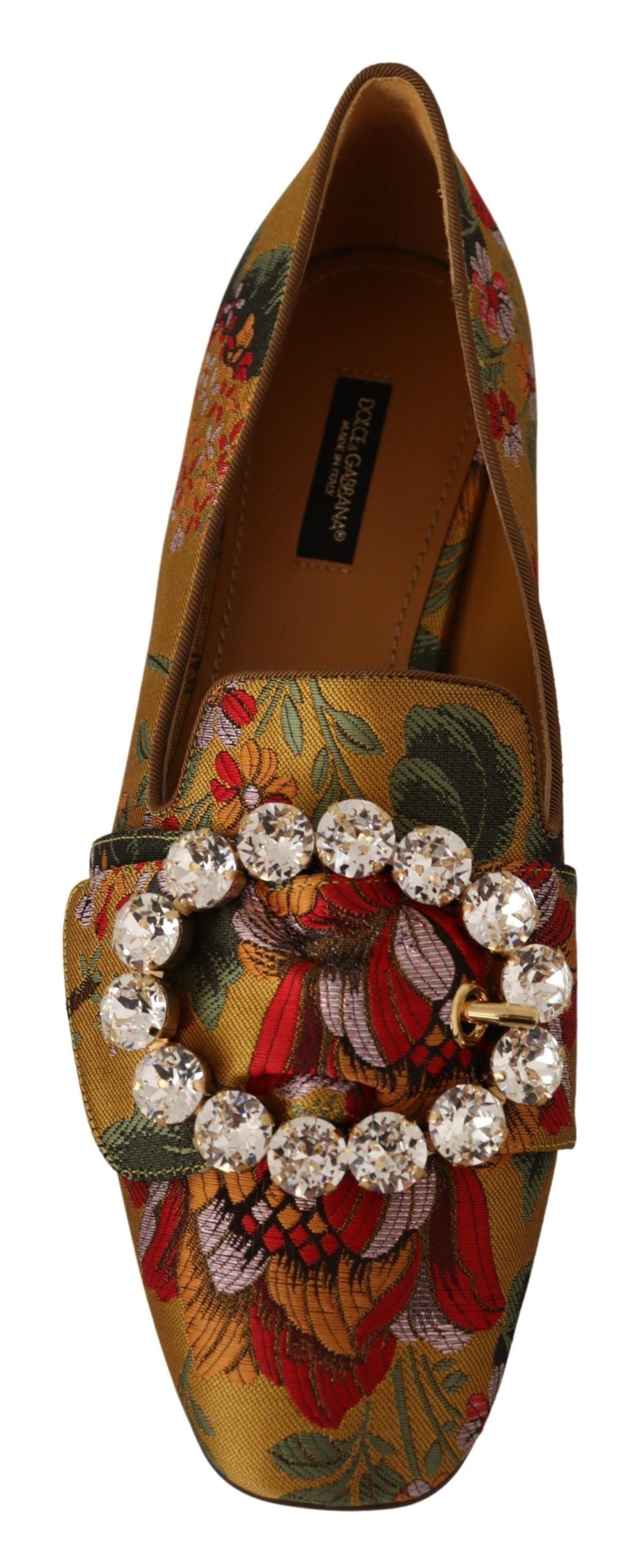 Step into luxury with these exquisite Dolce & Gabbana Floral Jacquard Ballet Flats, perfect for adding a touch of glamour to any outfit. These brand new, tags-on flats feature a lustrous gold hue, meticulously crafted from a high-quality blend of polyester, silk, and viscose. The highlight of these elegant loafers is the dazzling Crystals Brooch, adding a timeless sparkle that catches the eye. Designed with comfort in mind, they are equipped with a supple leather sole ensuring both durability and grace. Each pair is proudly made in Italy, showcasing the brand’s commitment to outstanding craftsmanship and style.