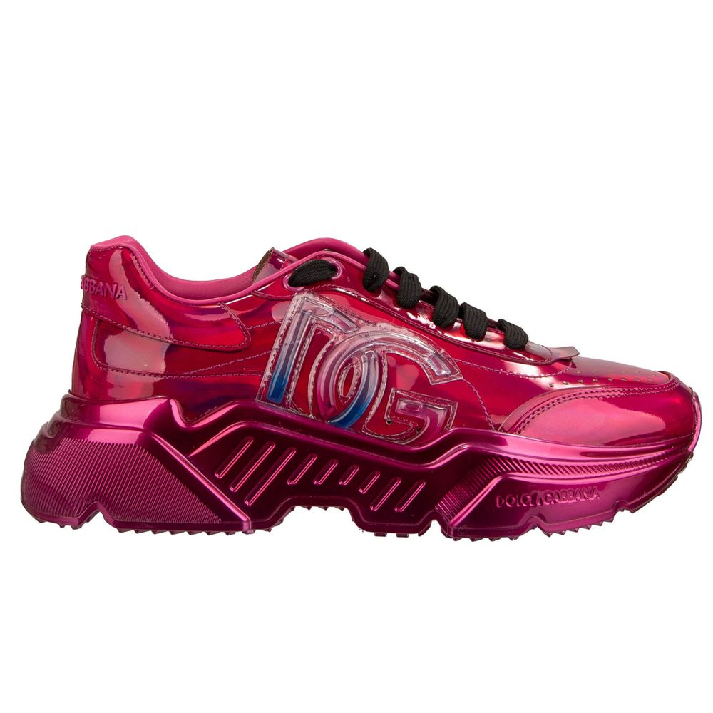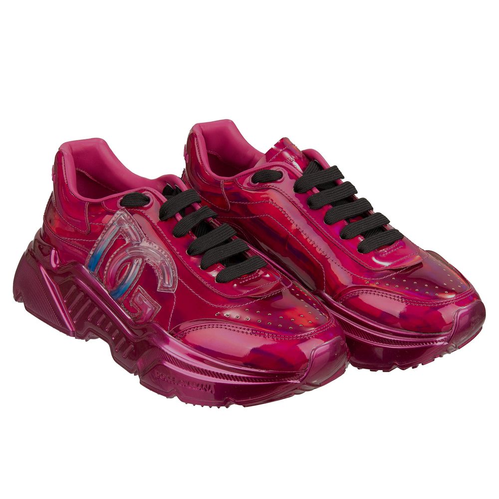Elevate your casual ensemble with a touch of luxury. These stunning fuchsia patent leather sneakers infuse vibrant charm into any outfit. Crafted with impeccable detail and featuring a bold logo on the side, they epitomize Italian craftsmanship. A robust rubber sole ensures durability and comfort for all-day wear. Step into style and make a statement.