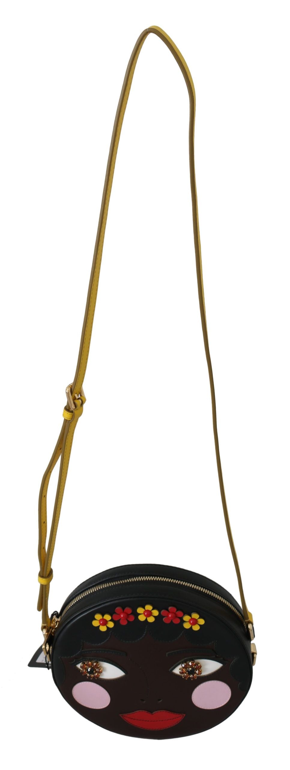 Indulge in the luxurious elegance of this stunning Dolce & Gabbana Glam Round Cross Body Bag. Crafted from the finest leather, this black and brown multicolored accessory boasts gold metal detailing that adds a sophisticated shimmer to your outfit. With an adjustable leather shoulder strap and a secure zipper closure, it offers both style and convenience. The interior reveals a polka dot lining, an inside pocket with a mirror, and the iconic logo details, showcasing the exquisite craftsmanship and attention to detail that Dolce & Gabbana is renowned for. This piece isn’t just a fashion statement; it’s a testament to high-end craftsmanship, made in Italy.