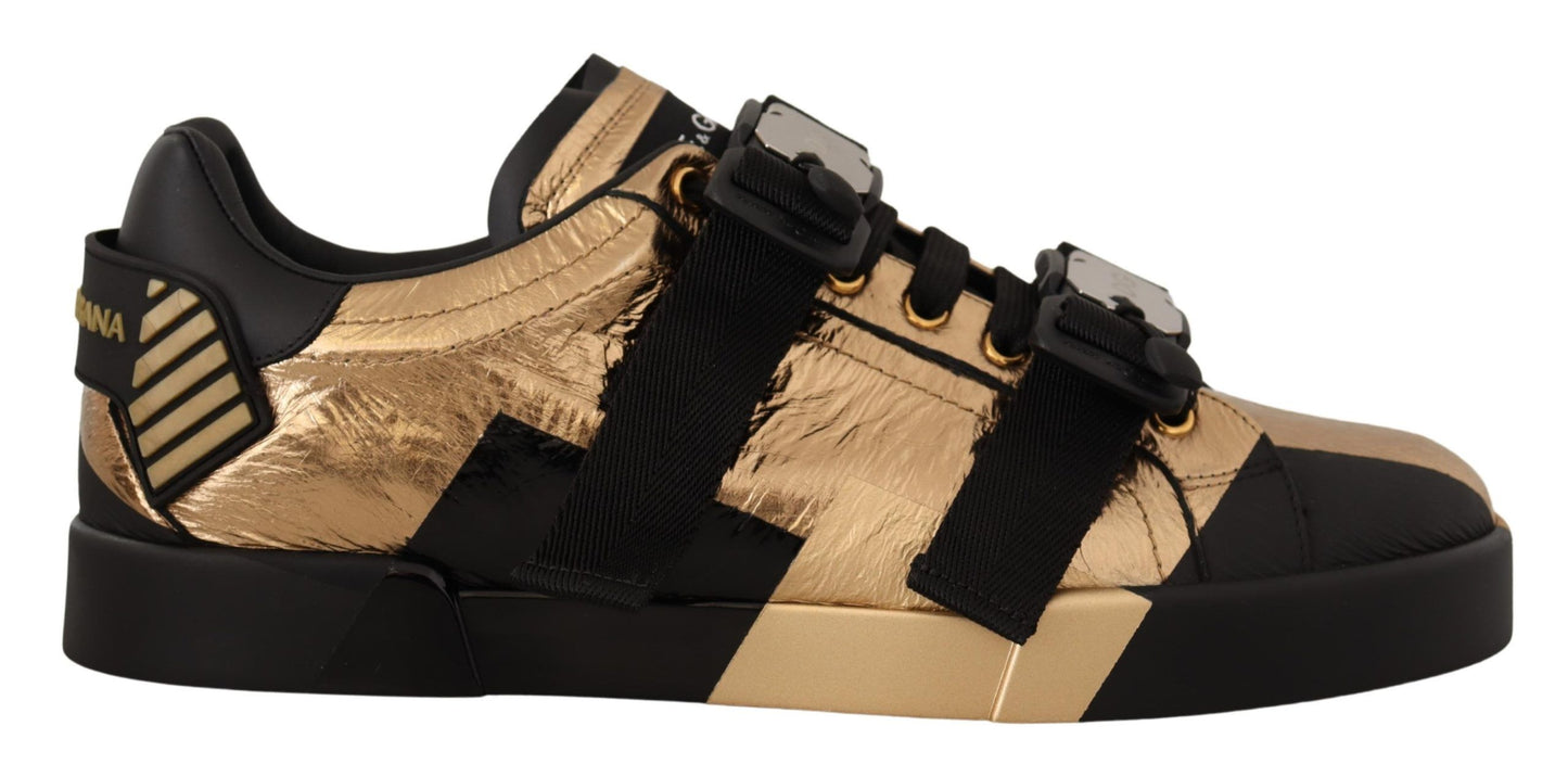 Elegant Gold Black Leather Sneakers