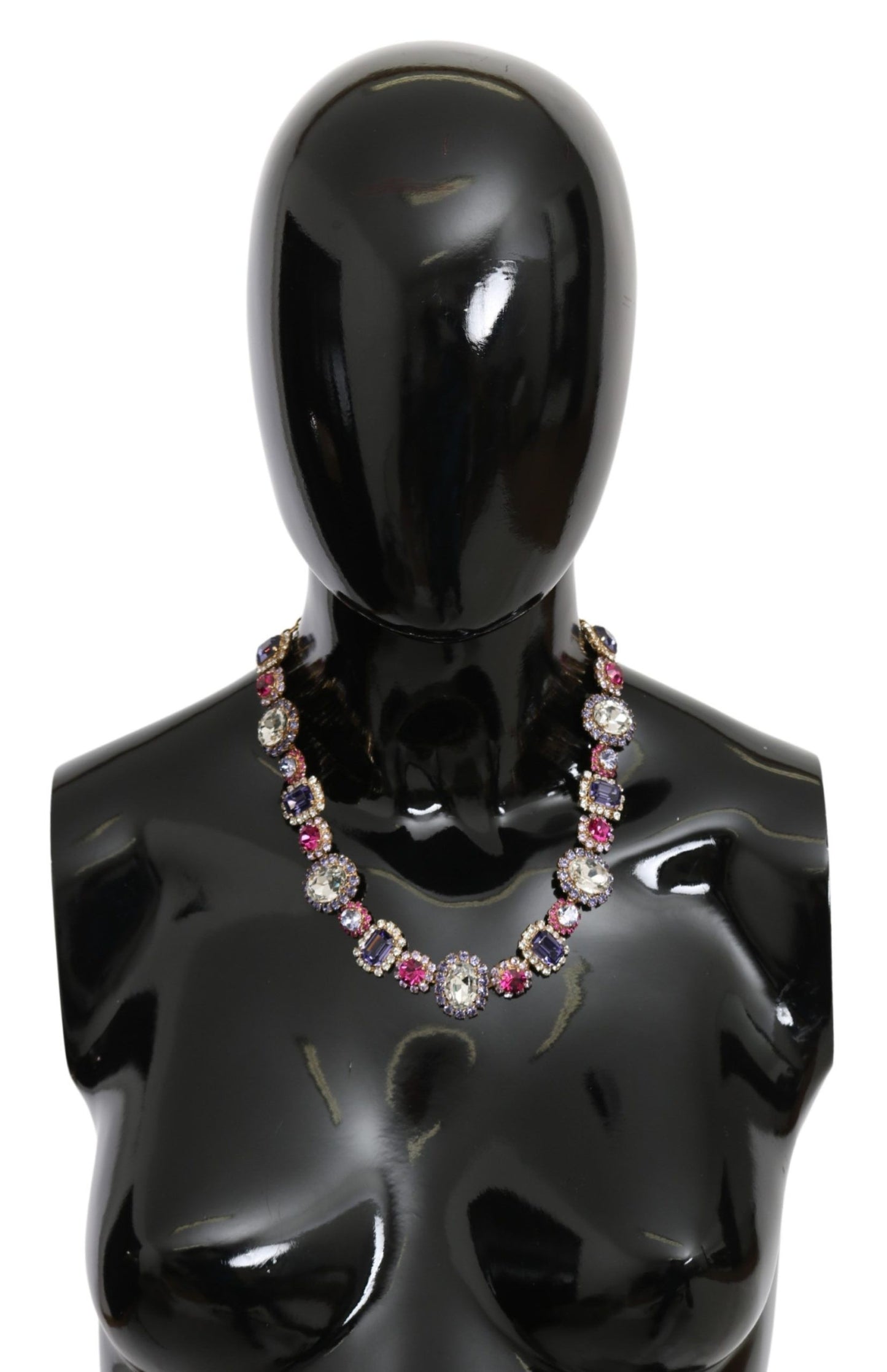 Indulge in the opulence of this stunning Dolce & Gabbana gold-plated brass necklace, adorned with sparkling crystals. A perfect blend of elegance and statement-making style, this piece features a mix of silver, blue, and pink colors complemented by clear, pink, and purple crystals. Designed with intricate filigree motifs and a secure lobster clasp closure, this made-in-Italy necklace is a luxurious addition to any ensemble. With its exquisite craftsmanship and logo details, this piece is not just jewelry; it’s a rare and exclusive artifact that elevates your personal collection.