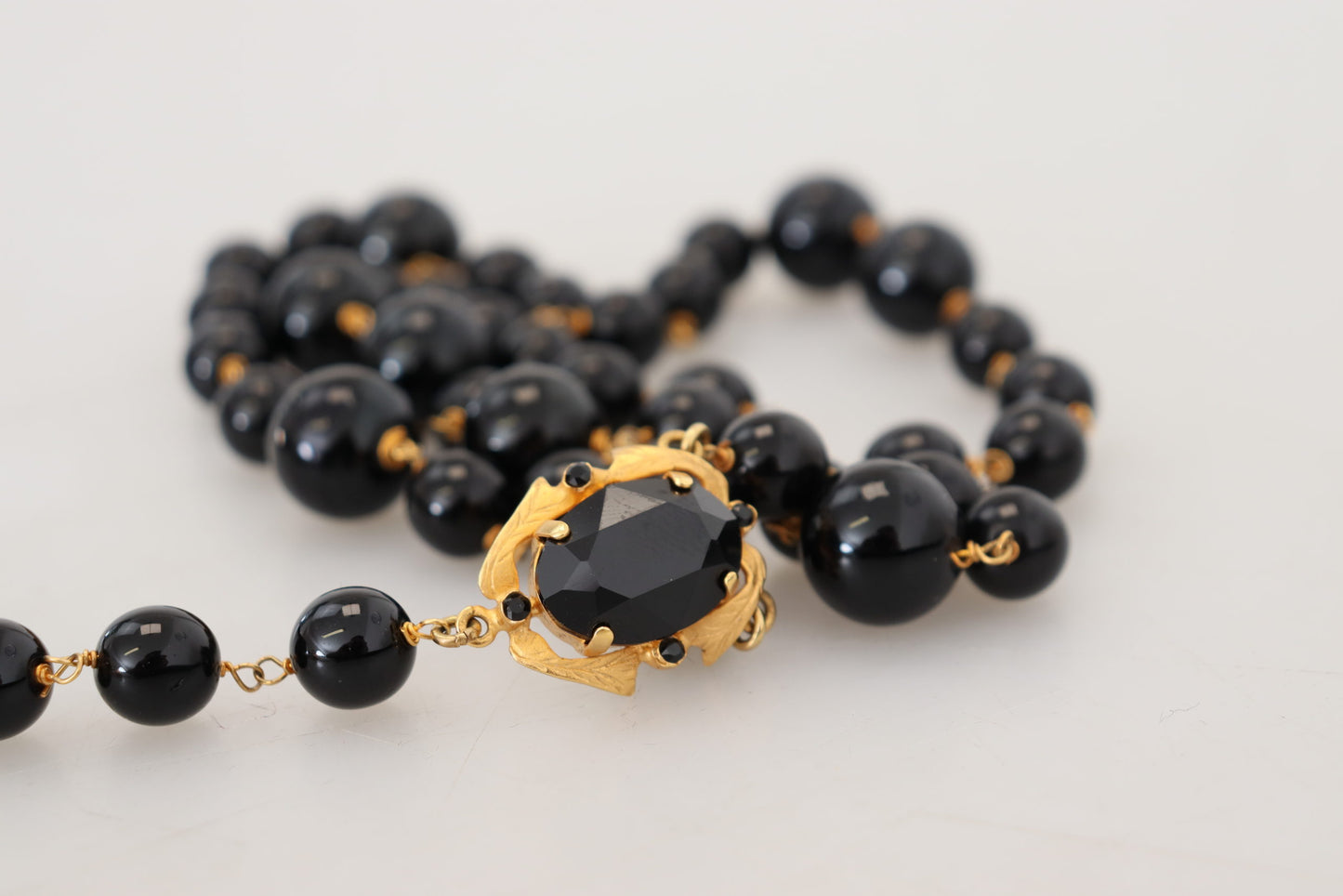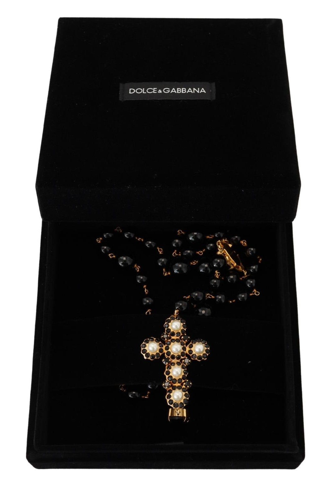 Introducing an exquisite piece that exudes timeless elegance – the Dolce & Gabbana ‘Croce’ Chain Necklace. This stunning accessory is a perfect blend of sophistication and style, featuring a captivating cross pendant adorned with shimmering crystals. Delicately crafted with artificial pearls and chic black and gold small balls, this necklace makes a statement of luxury and refinement. A comfortable lobster clasp closure ensures that this piece of jewelry sits perfectly around your neck, adding a touch of grandeur to any outfit. Proudly made in Italy with precision and care, this necklace showcases the attention to detail and high-quality craftsmanship synonymous with the Dolce & Gabbana brand.