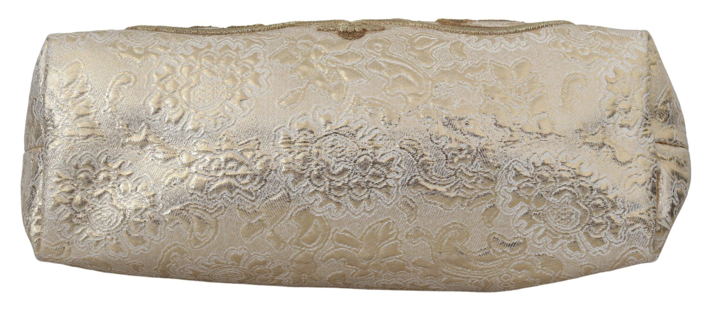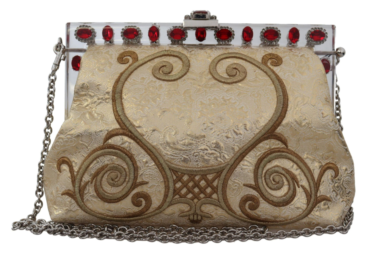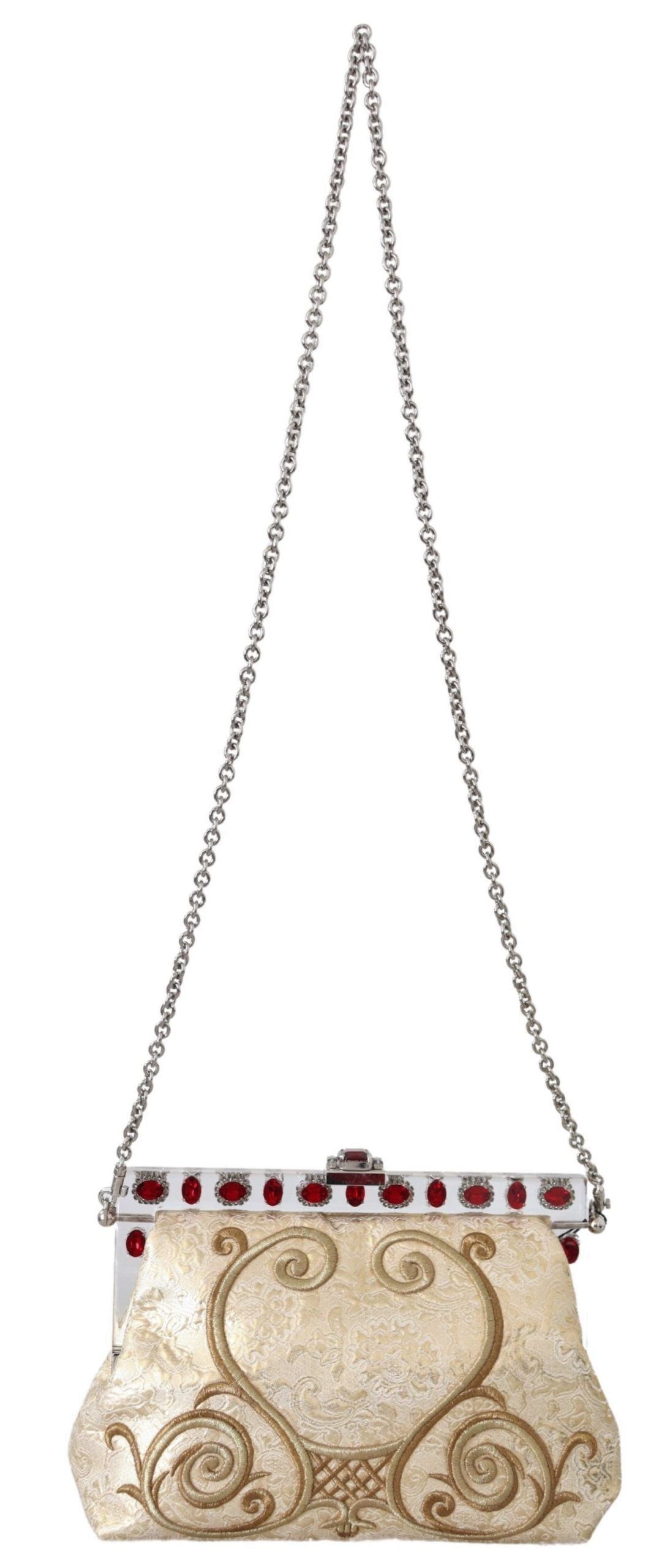 Indulge in the opulence of Dolce & Gabbana with this exquisite gold evening clutch, perfect for elevating your party attire. Adorned with red and clear crystal embellishments, this clutch boasts a luxurious silk blend inner lining and comes equipped with a detachable silver shoulder chain, allowing for versatile styling. Crafted with precision in Italy, it’s a little piece of luxury to hold your essentials.