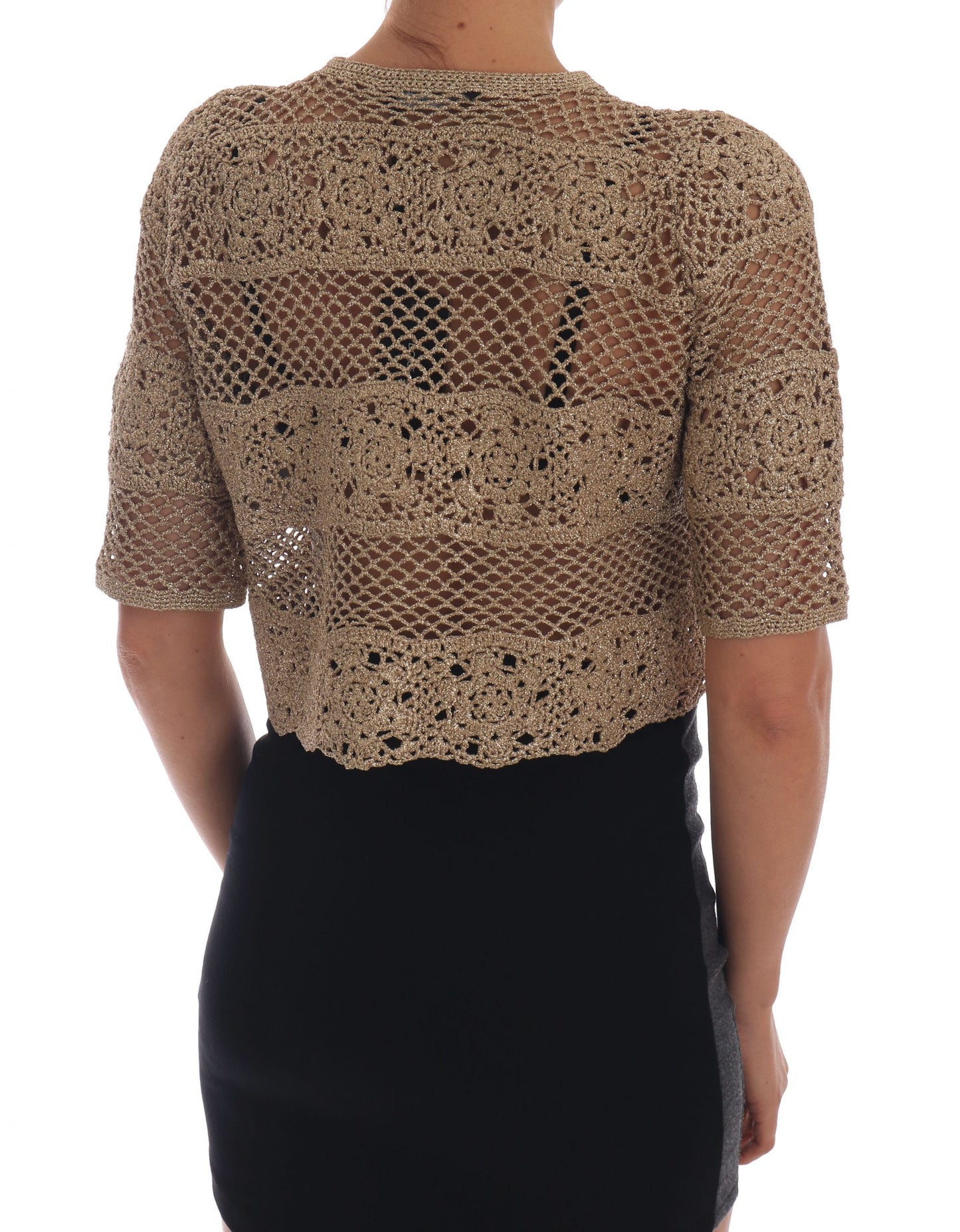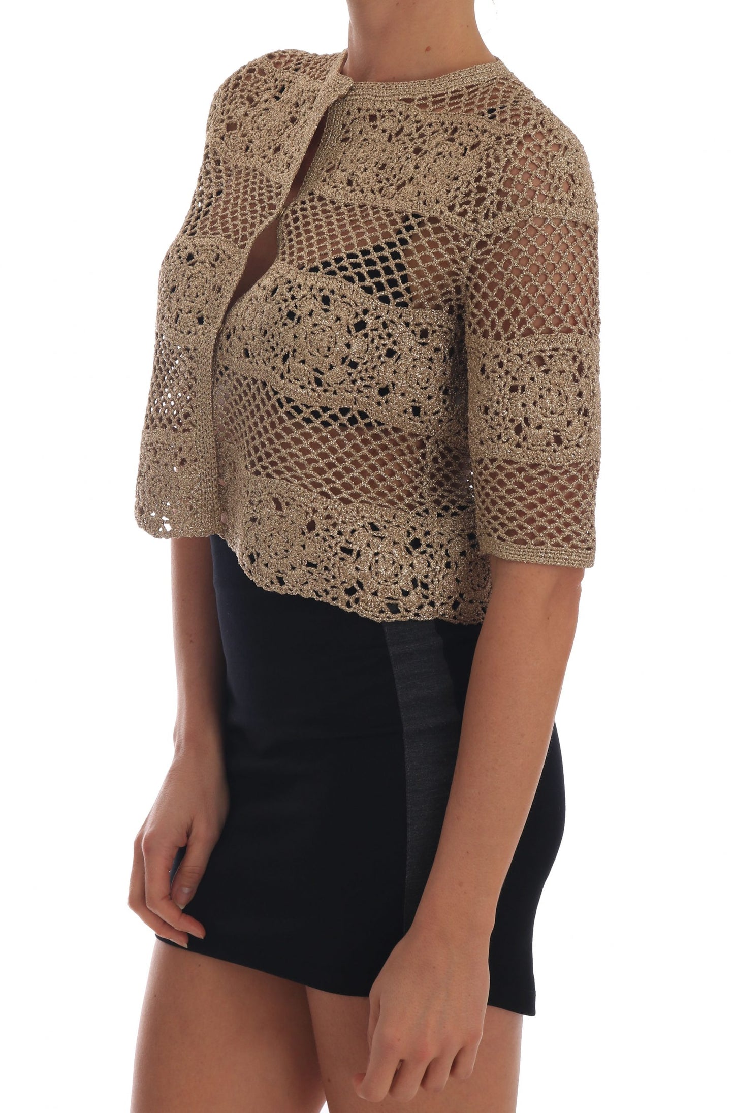 Experience the epitome of luxury with this exquisite Gold Crochet Knitted Crop Cardigan from the renowned Dolce & Gabbana. This stunning piece boasts not only a chic cropped design but also an eye-catching gold hue that radiates elegance and charm. Perfectly crafted in Italy, this cardigan merges high fashion with exceptional craftsmanship, ensuring that your ensemble is the epitome of sophistication. It comes brand new with tags, confirming its authenticity and pristine condition. Whether it’s a casual outing or a sophisticated event, this cardigan promises to elevate your style quotient effortlessly.