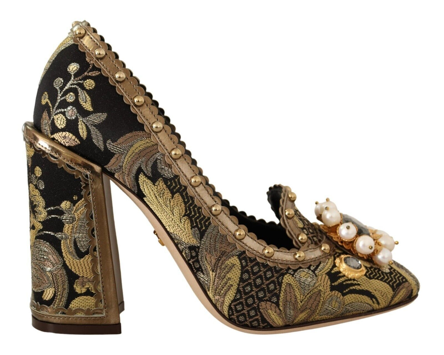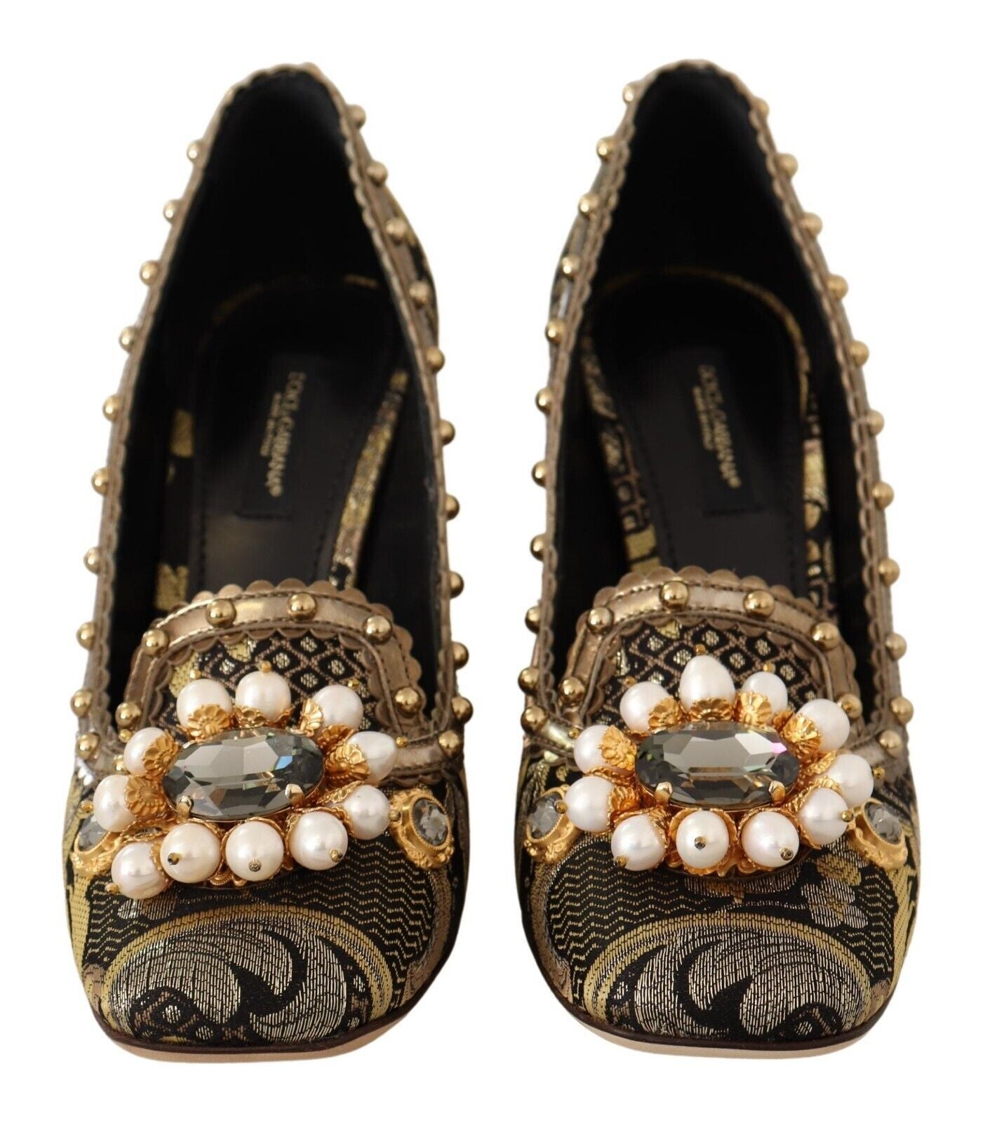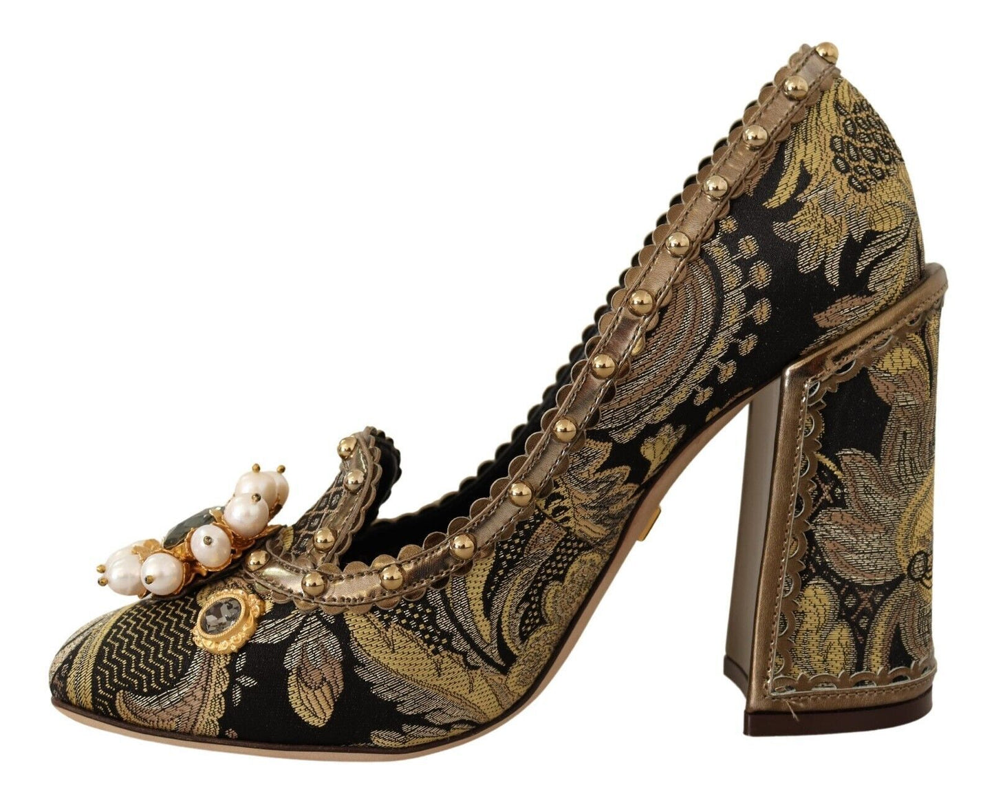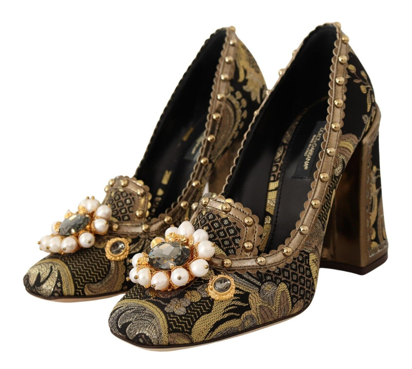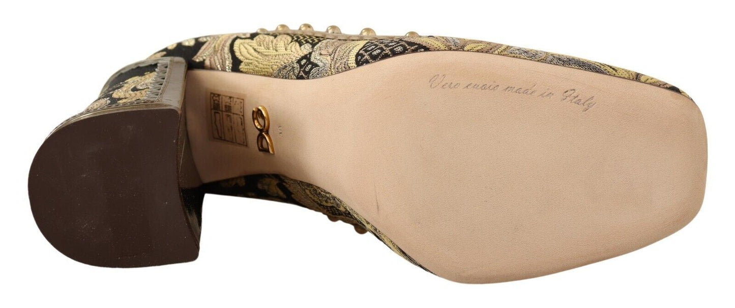 Elevate your footwear collection with these stunning Dolce & Gabbana Jacquard brocade square toe pumps. Resplendent in gold, these shoes are not just footwear; they are a statement of elegance and sophistication. Adorned with pearls and studs, the pumps feature a comfortable block heel and an easy slip-on style. Perfect for any upscale event where making an impression is a must.
