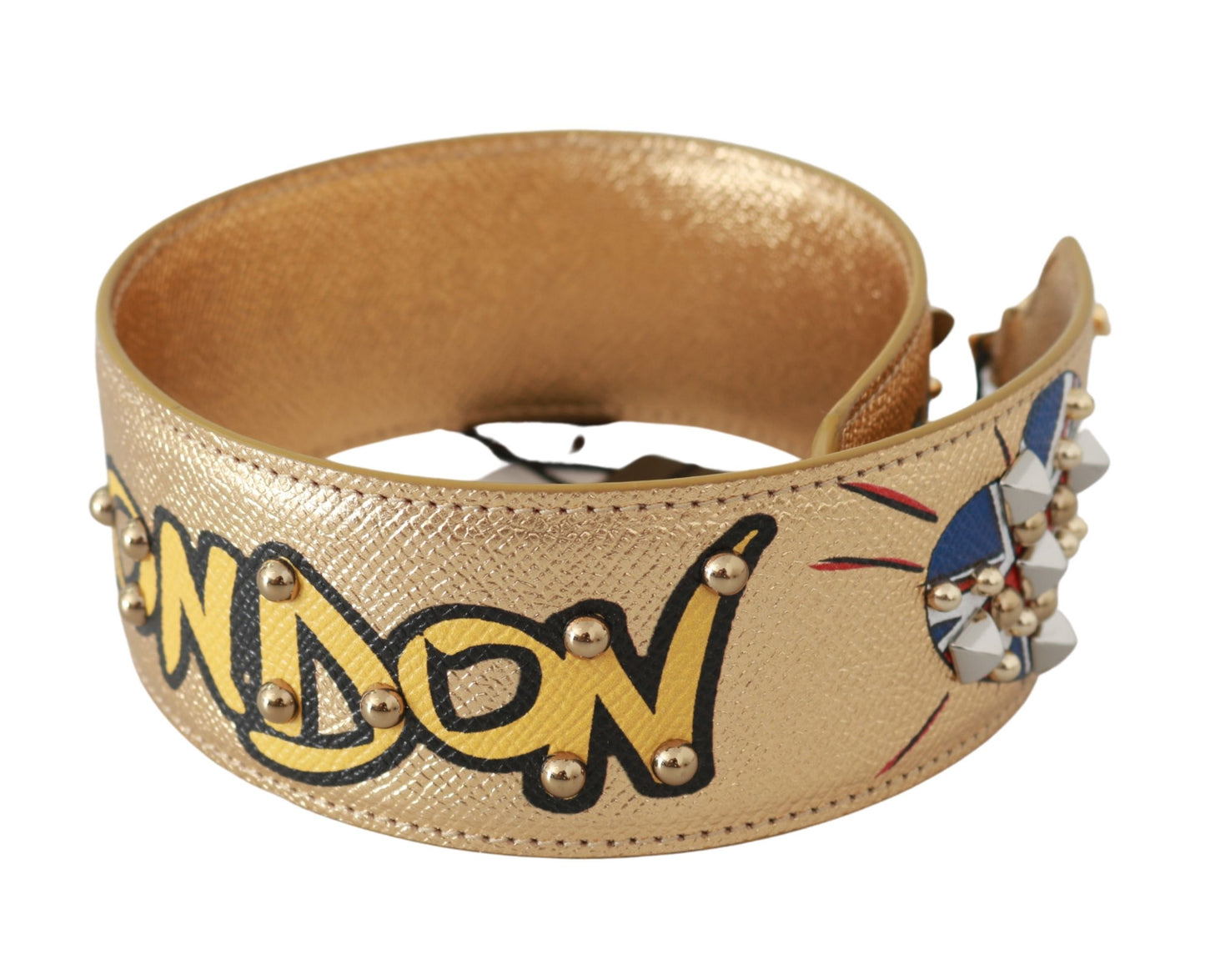 Adorn your handbag with an exquisite touch of luxury with this authentic Dolce & Gabbana shoulder strap. Crafted from premium 100% calfskin leather, this accessory features a stunning gold hue, embellished with the distinctive #DGLovesLondon studs, presenting not just an addition to your carry-on but a statement of sophistication. Perfect for women who appreciate elegance and quality, it was meticulously made in Italy and measures 58cm in length and 5cm in width. Elevate your accessory game with this dazzling piece!