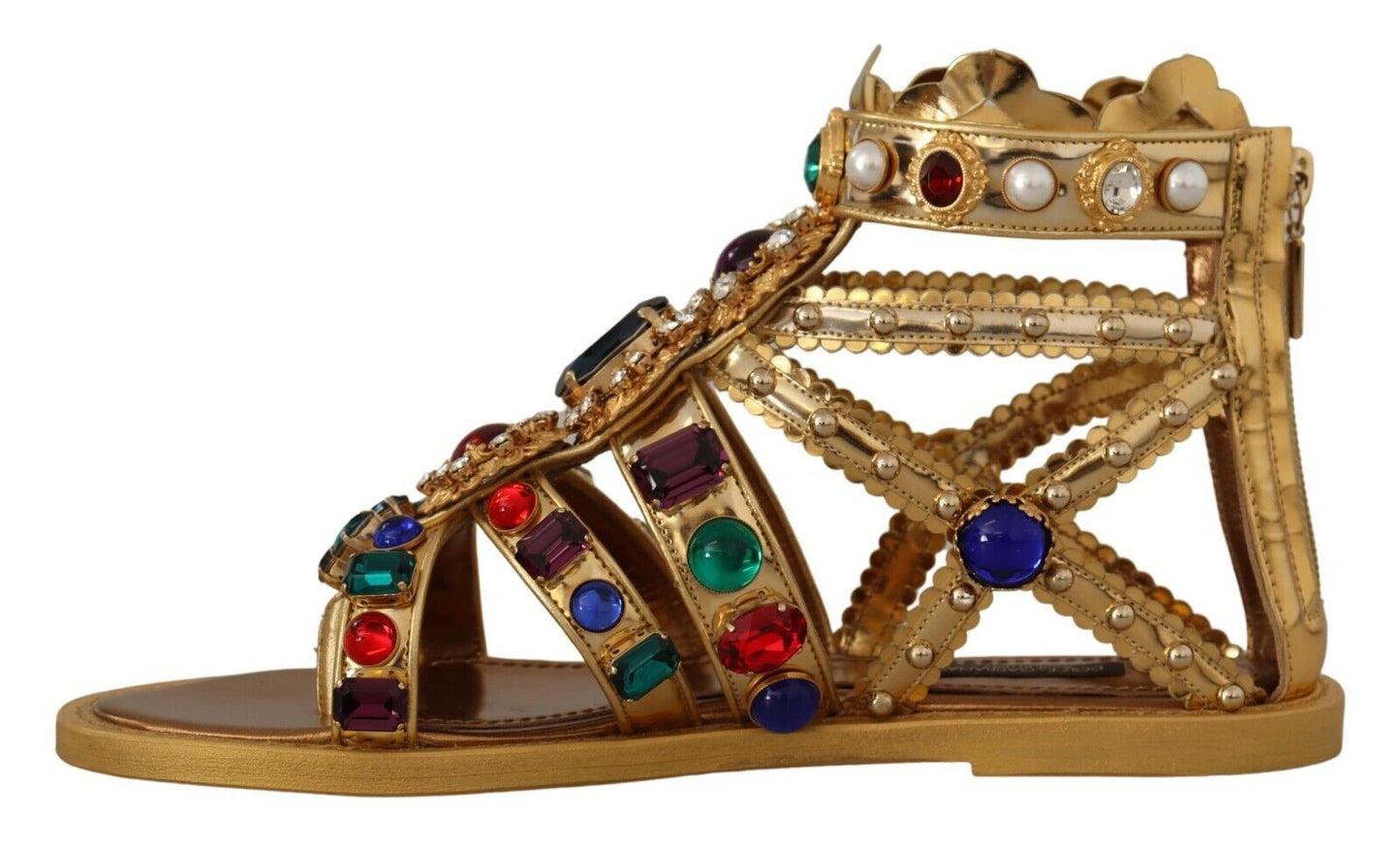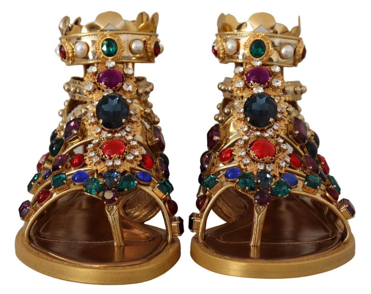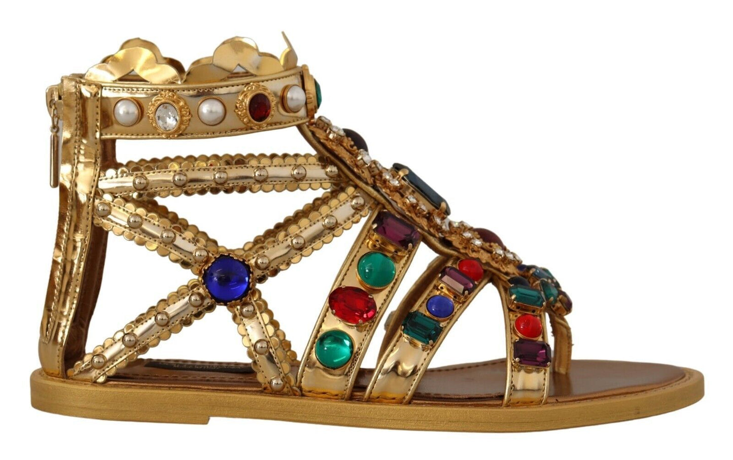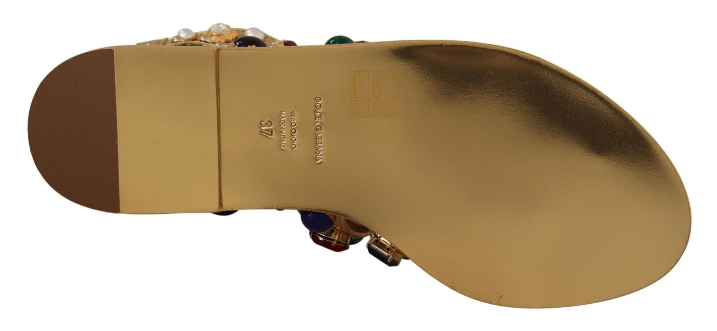 Step into luxurious elegance with these exquisite gold sandals by Dolce & Gabbana, adorned with radiant multicolor crystal embellishments. These brand new, authentic flats effortlessly marry comfort with high-end style, making them perfect for both exclusive events and casual outings. Crafted in Italy with a keen eye for detail, they feature a sumptuous leather composition accented with elastane and polyester for a snug fit, finished with the iconic logo detail.