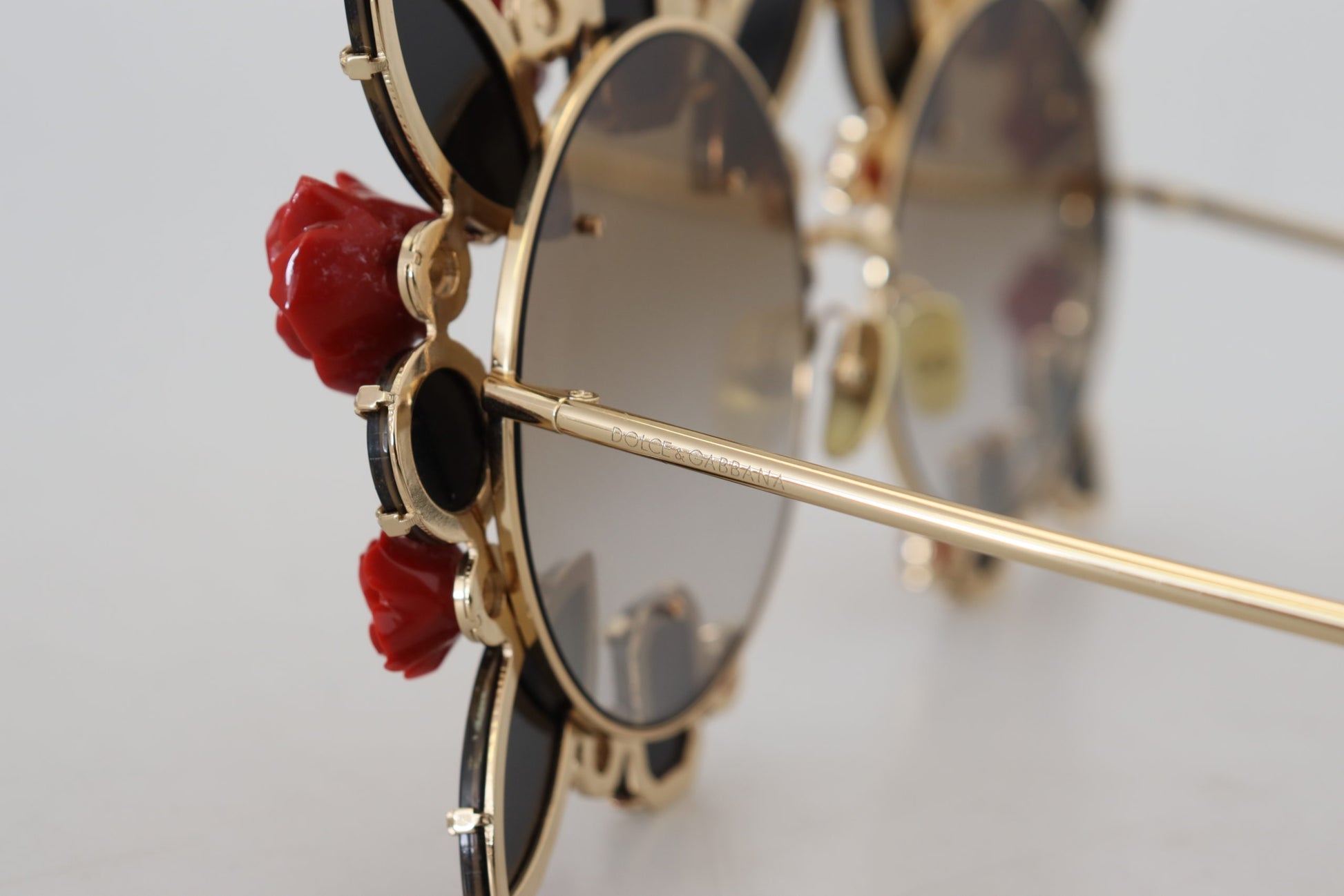 Step into the sunshine with style and grace with these Gorgeous 100% Authentic Dolce & Gabbana sunglasses. A stunning round metal shape in gold, these frames are artfully embellished with delicate roses, creating a look that’s both timeless and chic. With brown lenses offering 100% UV protection, they are not just a fashion statement but a practical accessory for any sunny day out. Embrace the quintessence of Italian luxury and make these sunglasses a statement piece in your accessory collection.