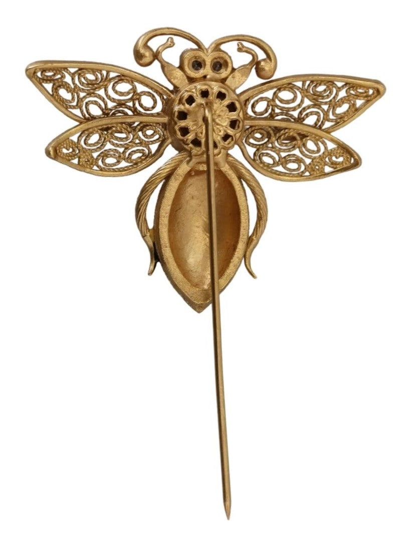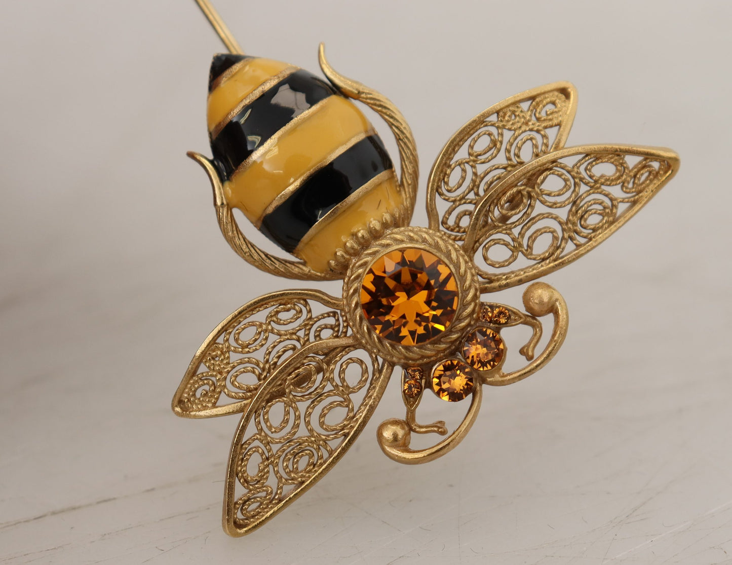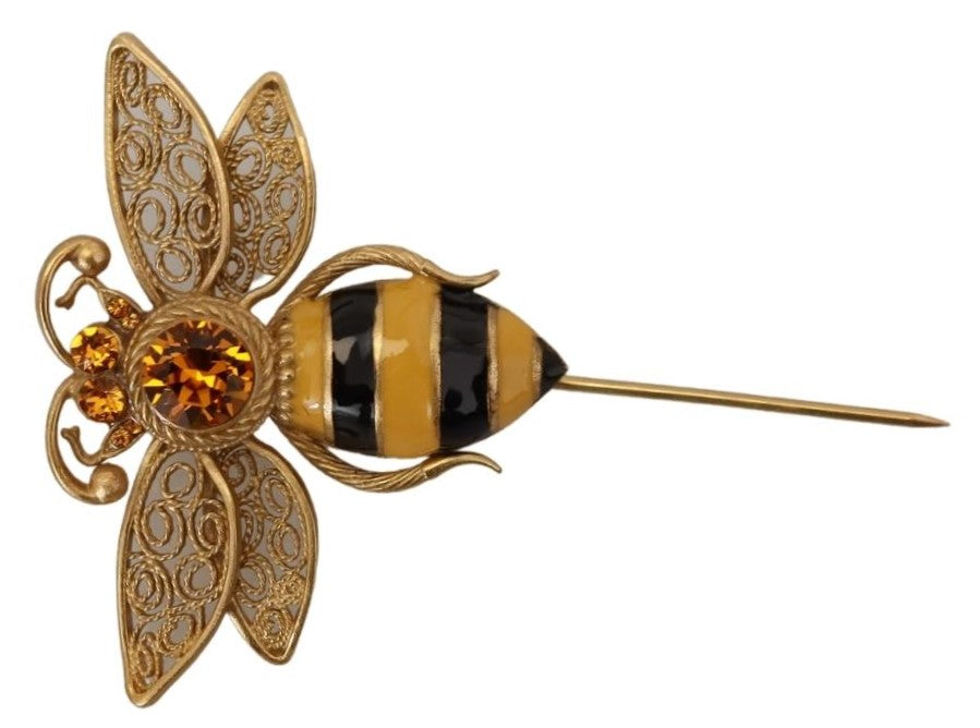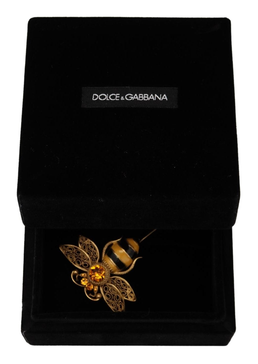 Adorn your ensemble with a touch of elegance from Dolce & Gabbana. This exquisite gold-plated brass brooch shaped like a bee is a stunning accessory that adds a sparkle of sophistication to any outfit. Crafted in Italy with meticulous attention to detail, it features shimmering crystals that catch the light beautifully. The iconic logo detail ensures authenticity and luxury appeal, making this piece a perfect gift or a treasured addition to your collection.