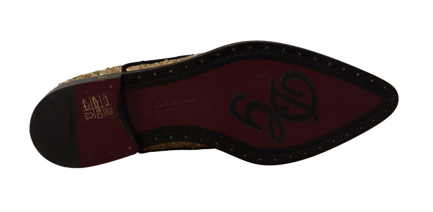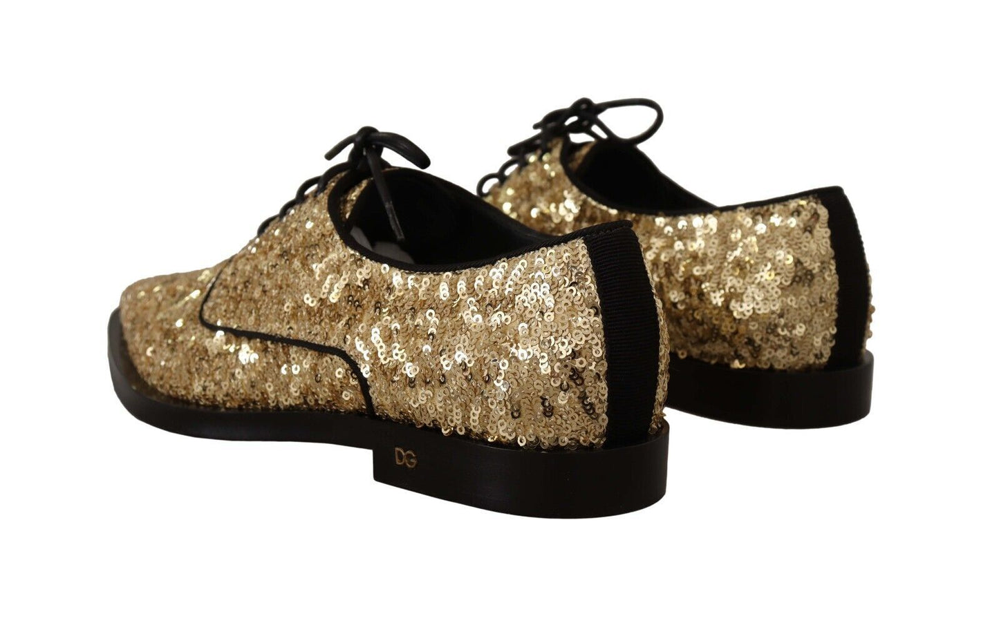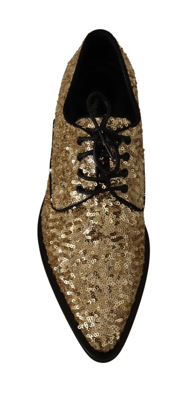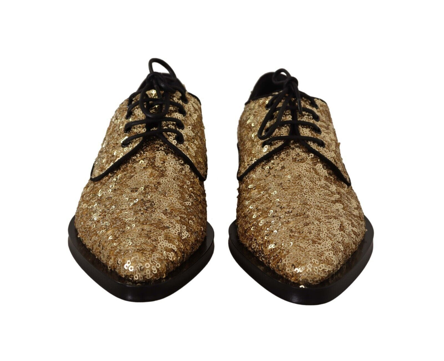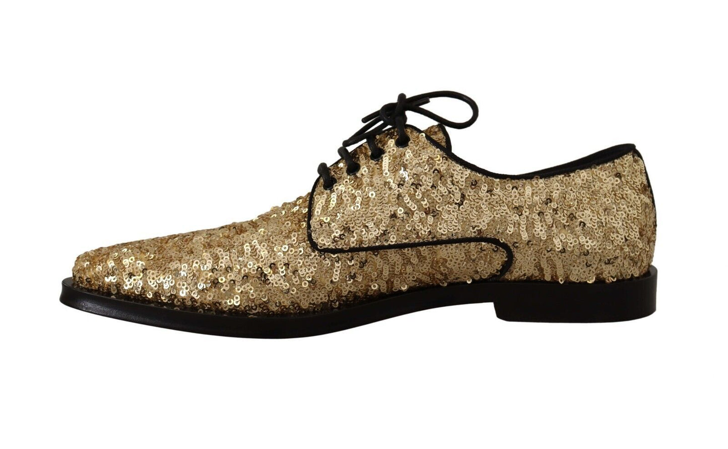 Unveil the essence of luxury with Dolce & Gabbana’s meticulously crafted golden sequined brogue dress shoes. Perfect for the discerning fashionista looking to add sparkle and unrivaled style to their ensemble, these shoes come with a logo detail and leather sole, embodying the Italian brand’s dedication to opulence and high craftsmanship. Whether for a special event or just to stand out, these lace-up closure shoes are a wardrobe must-have.