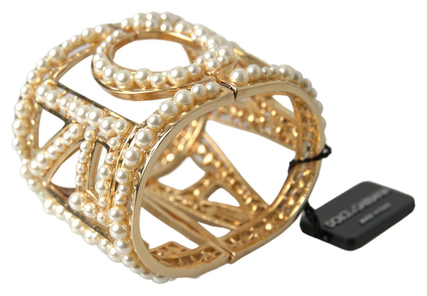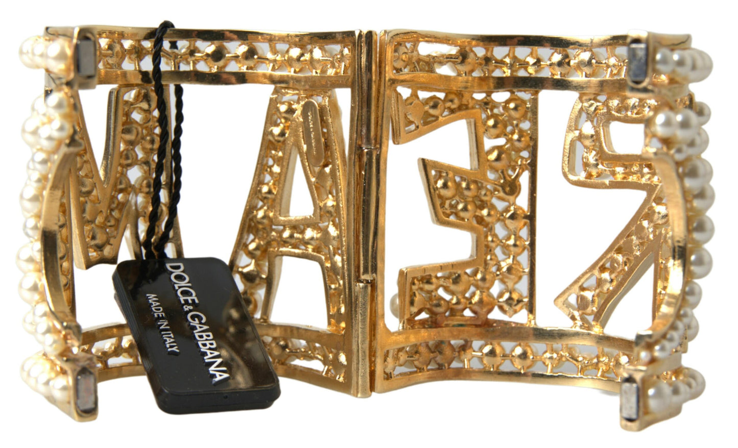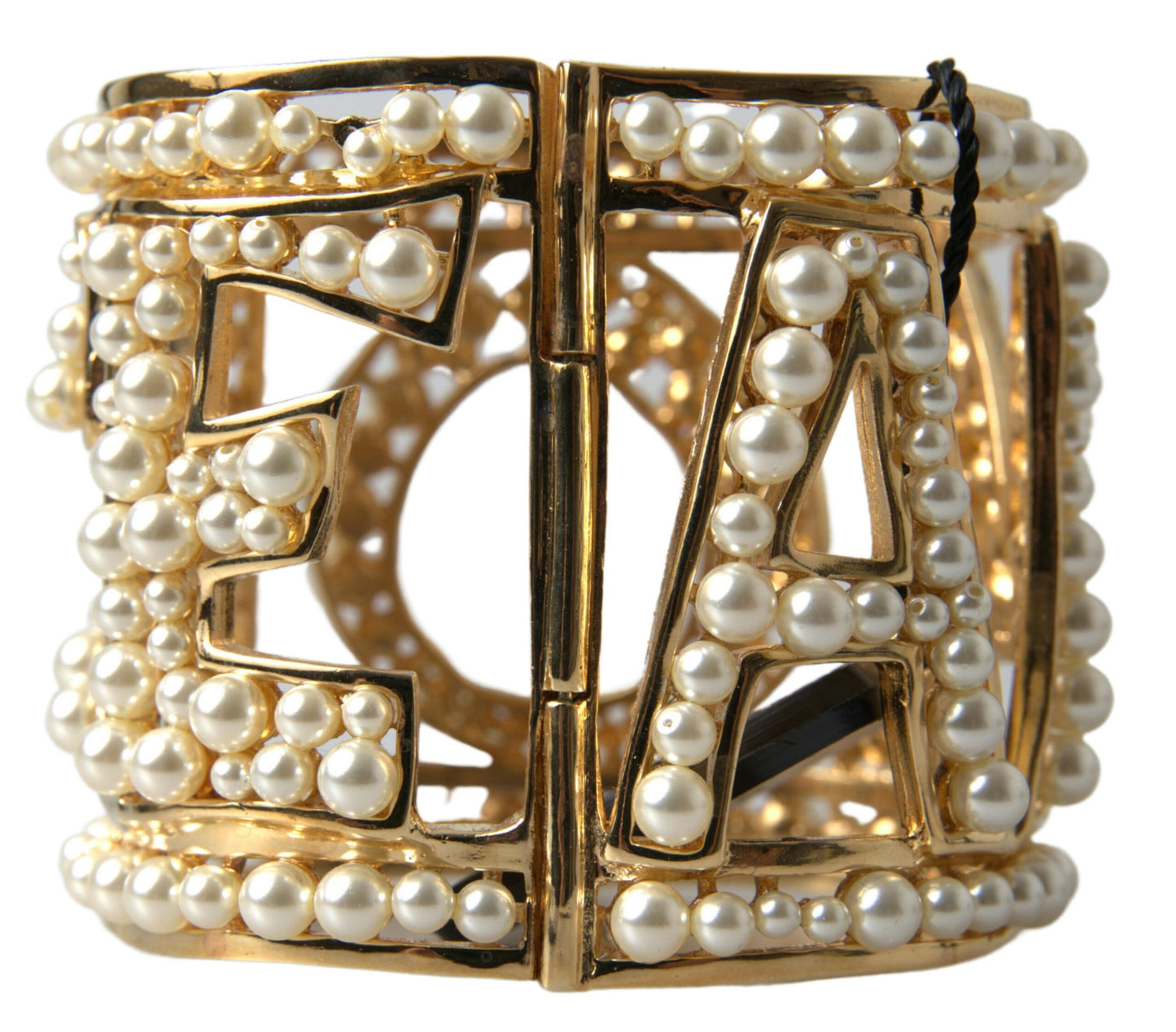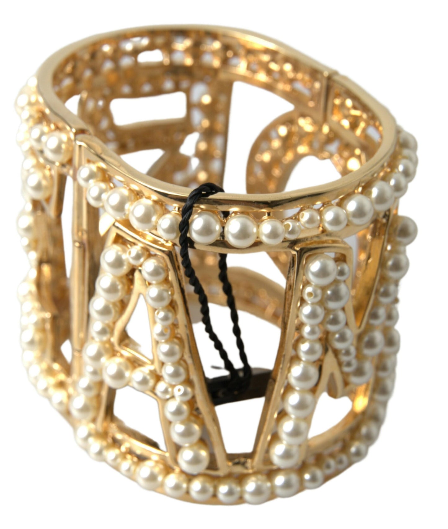 Exude elegance with this stunning Dolce & Gabbana gold-tone metal cuff bracelet, intricately detailed with the romantic ‘AMORE’ lettering alongside lustrous faux pearl embellishments. A statement piece that encapsulates the luxury and craftsmanship synonymous with the iconic fashion house.