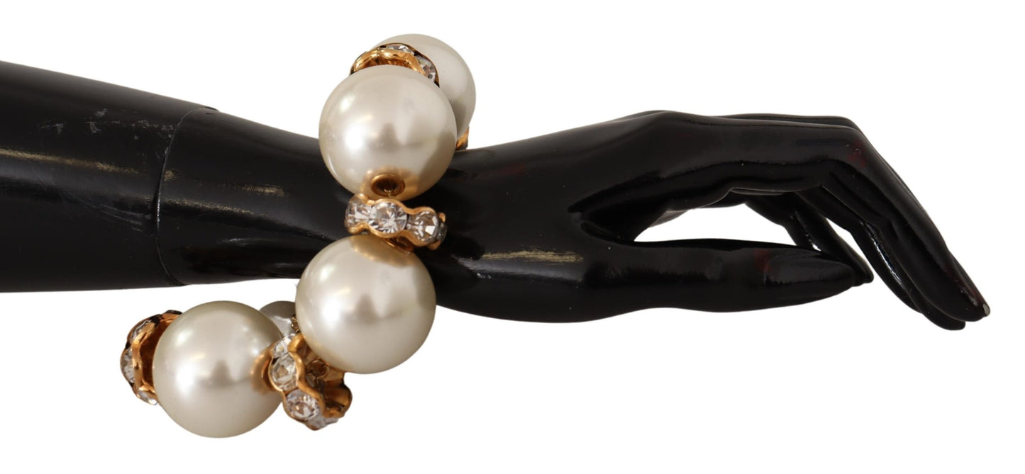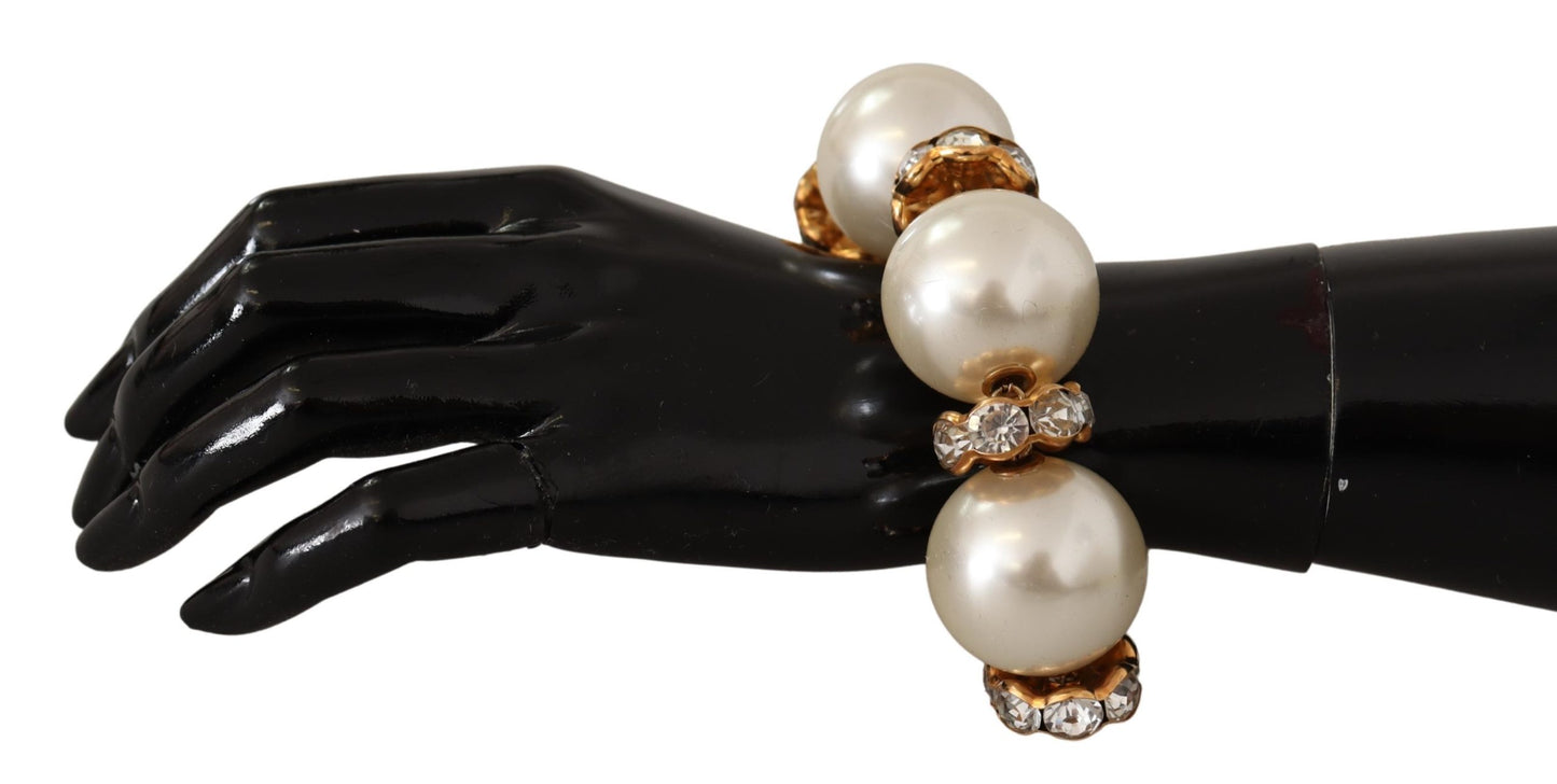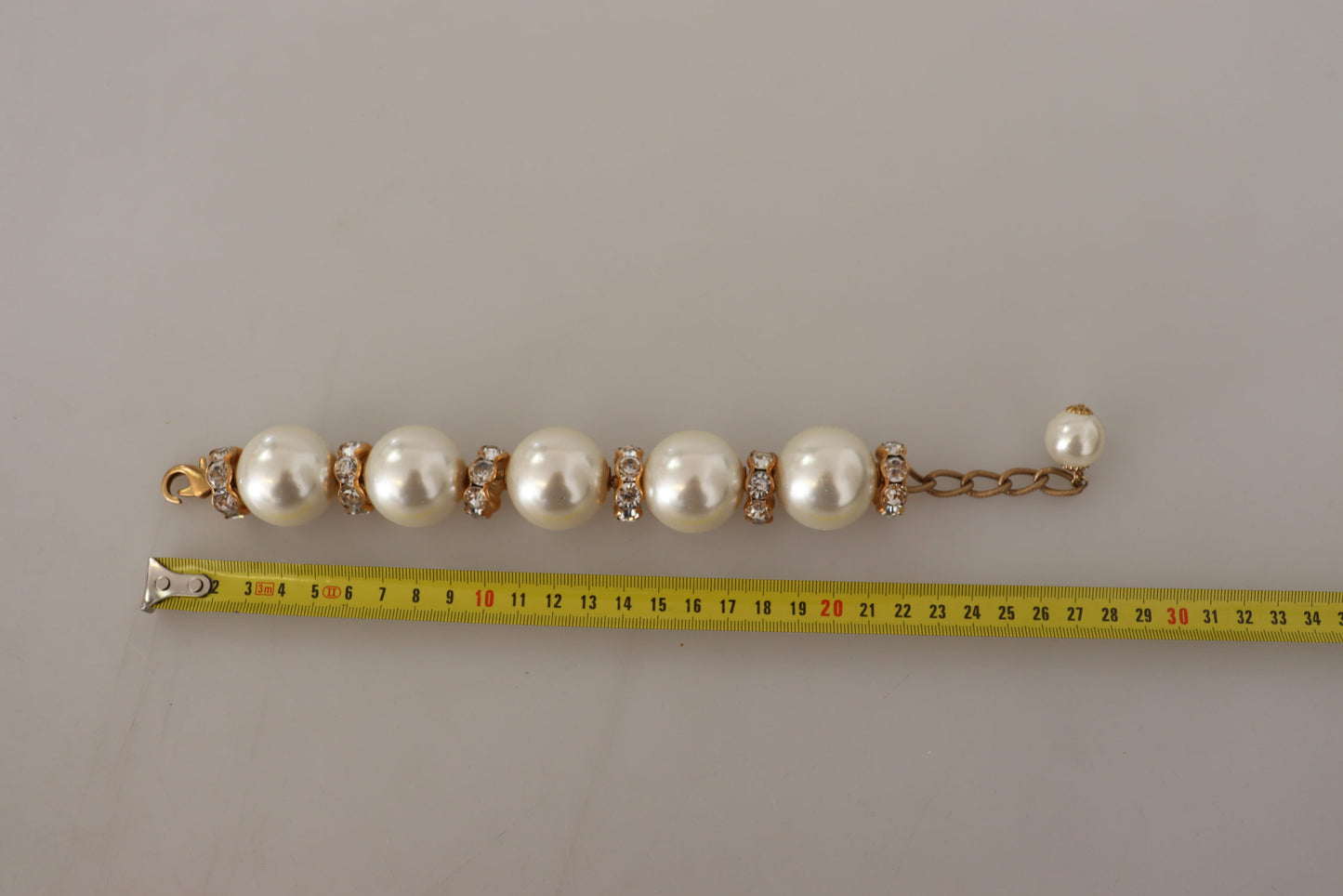Exude elegance with this opulent Dolce & Gabbana bracelet, featuring a lavish display of crystal embellishments and majestic pearls. This gold-tone brass accessory promises enduring shine and sophistication. Perfect for the discerning woman who desires a touch of luxury in her ensemble.