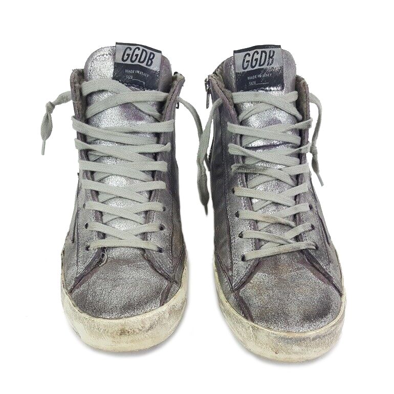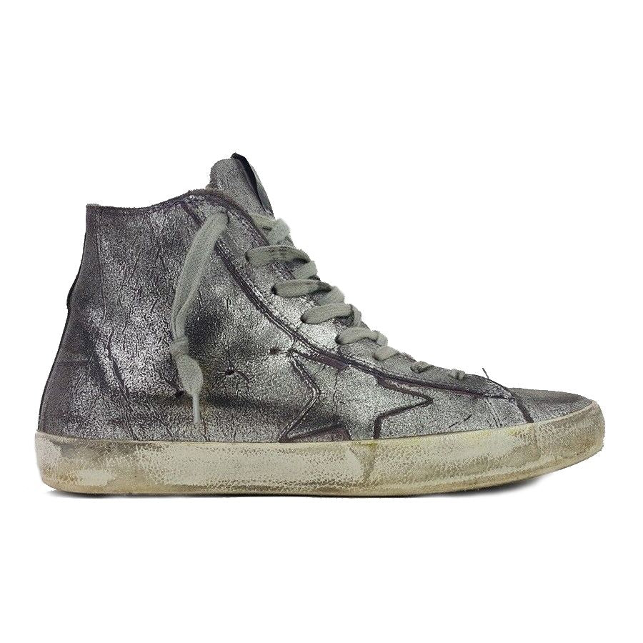 Step into a blend of luxury and edgy style with these high-top sneakers showcasing a unique silver-painted purple calfskin. Deliberate wear effects and dirt signs give them an urban, lived-in appeal, while the convenient side zip opening offers ease of access. Crafted with care in Italy, they feature a robust rubber sole for lasting durability and style on the go.