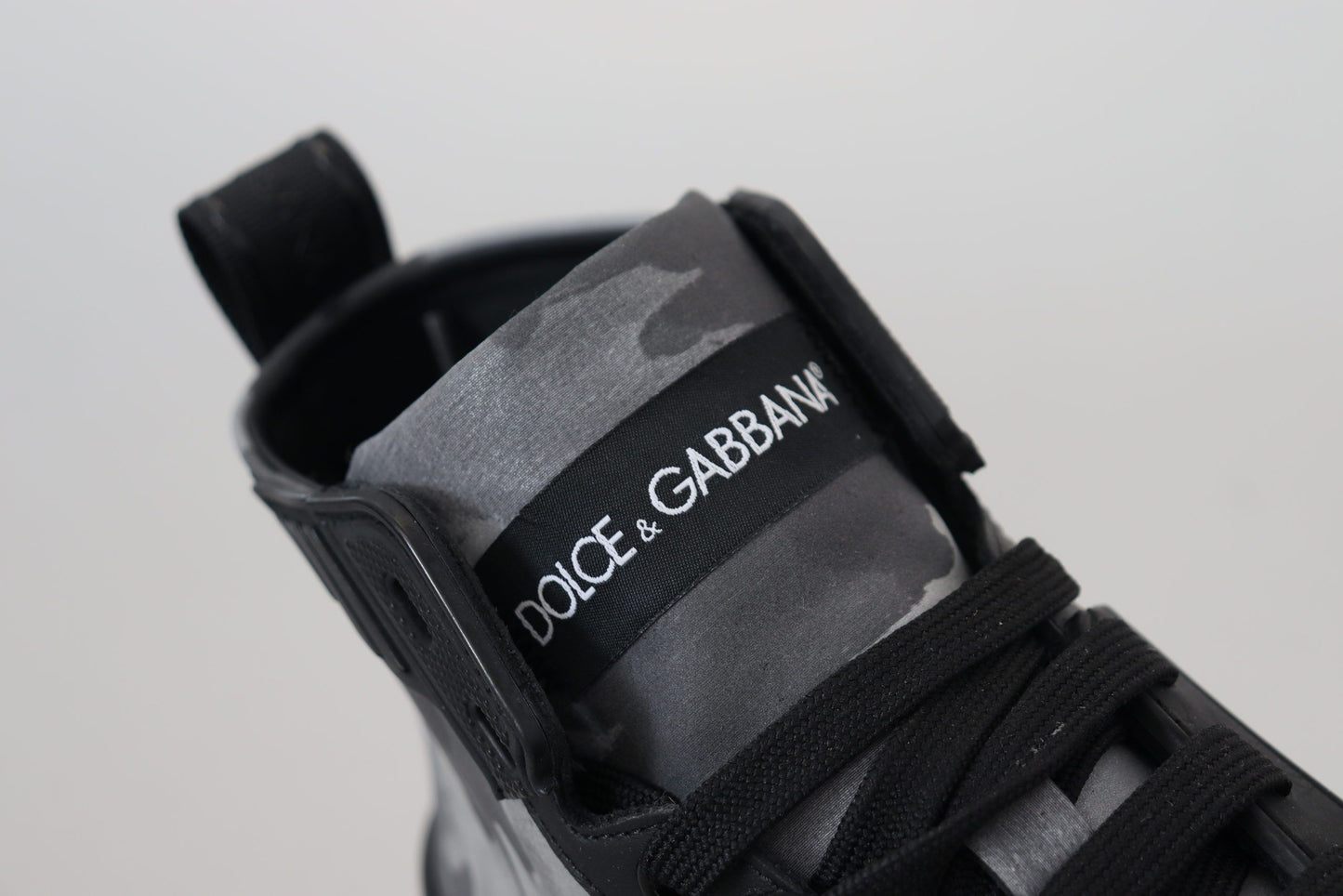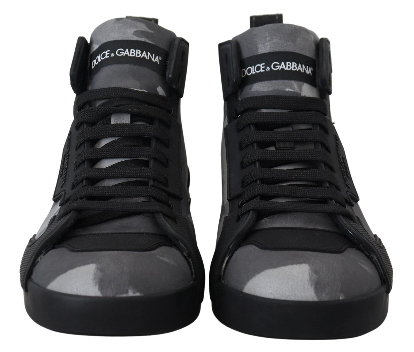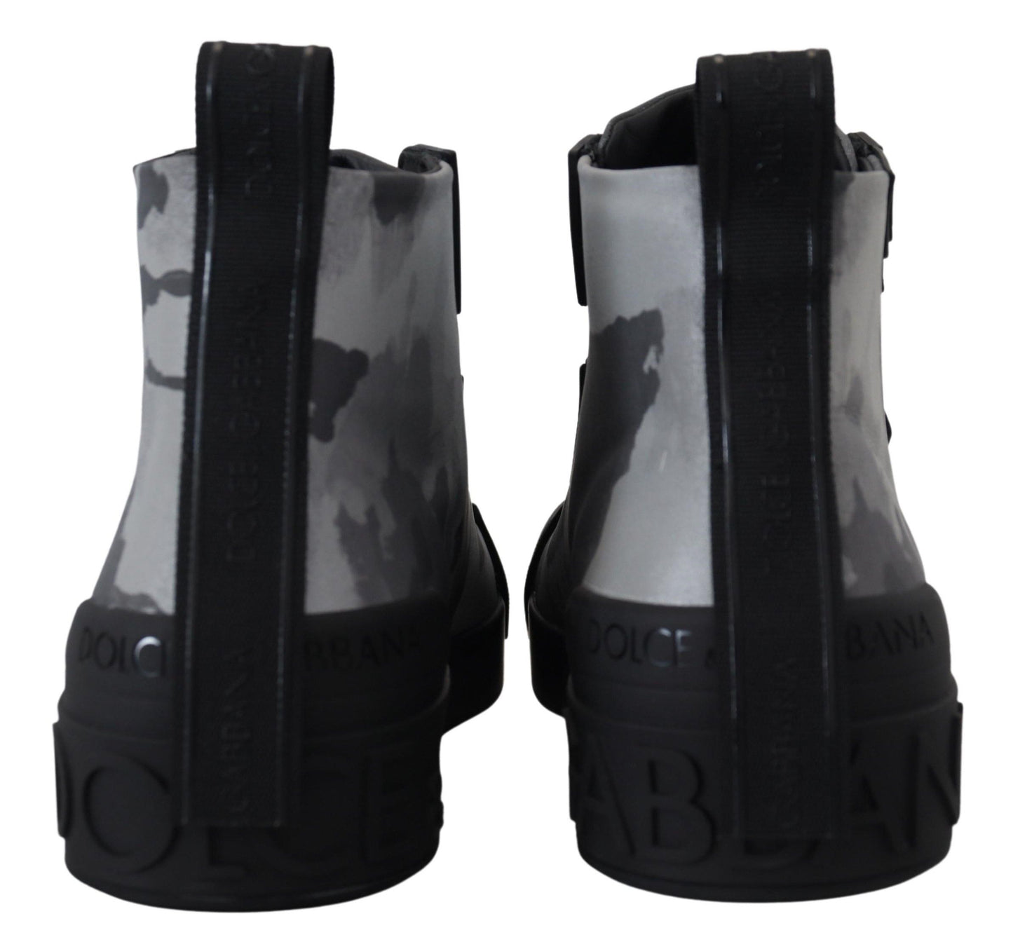 Step up your sneaker game with these striking high-top sneakers, unveiled by the prestigious Dolce & Gabbana. These shoes aren’t just a fashion statement; they’re an Italian-crafted treasure, blending both luxury and edgy style. The pair boasts a unique gray camouflage print interspersed with sleek black details for a contemporary look. With their remarkable logo details and enduring rubber soles, these kicks are made for those who appreciate the finer things in style and comfort. Adorn your feet with the excellence of Dolce & Gabbana craftsmanship.