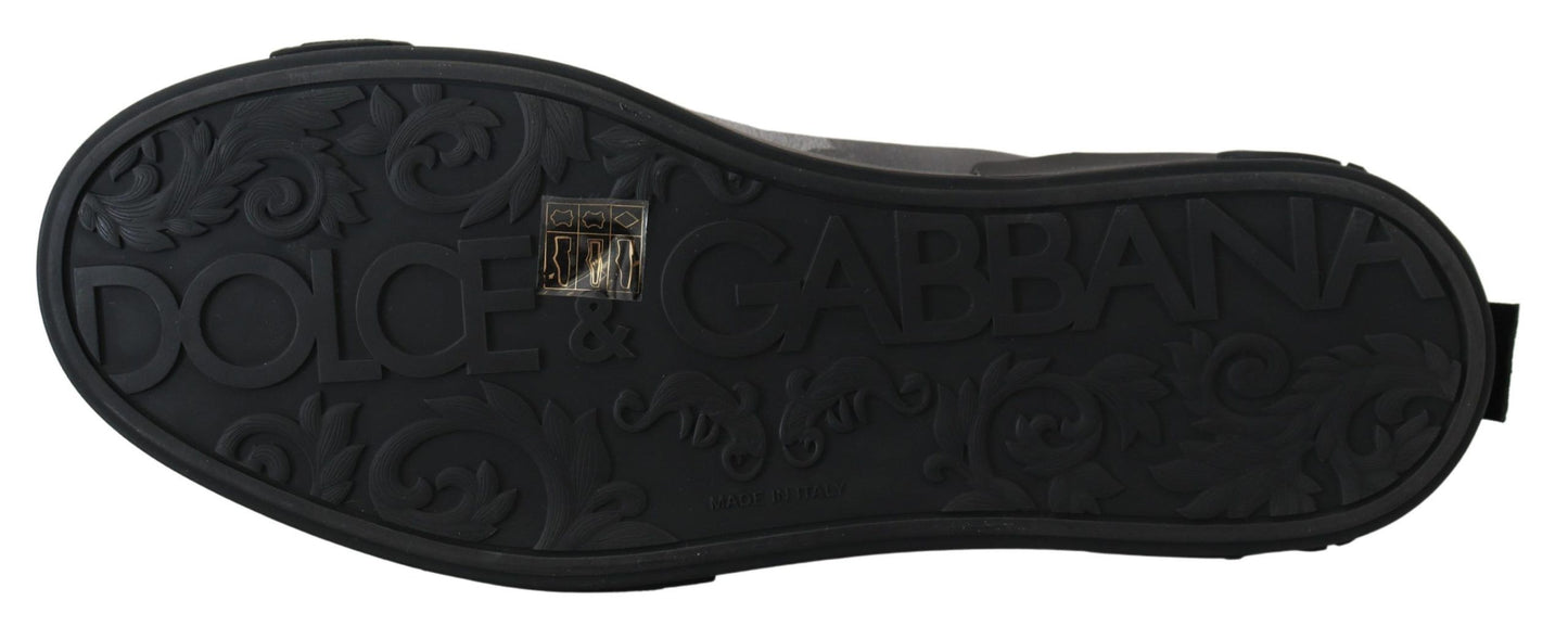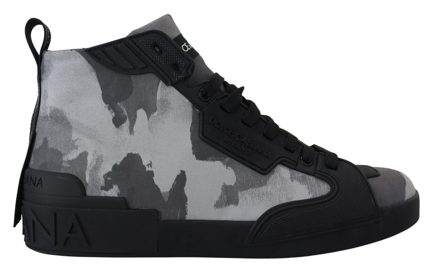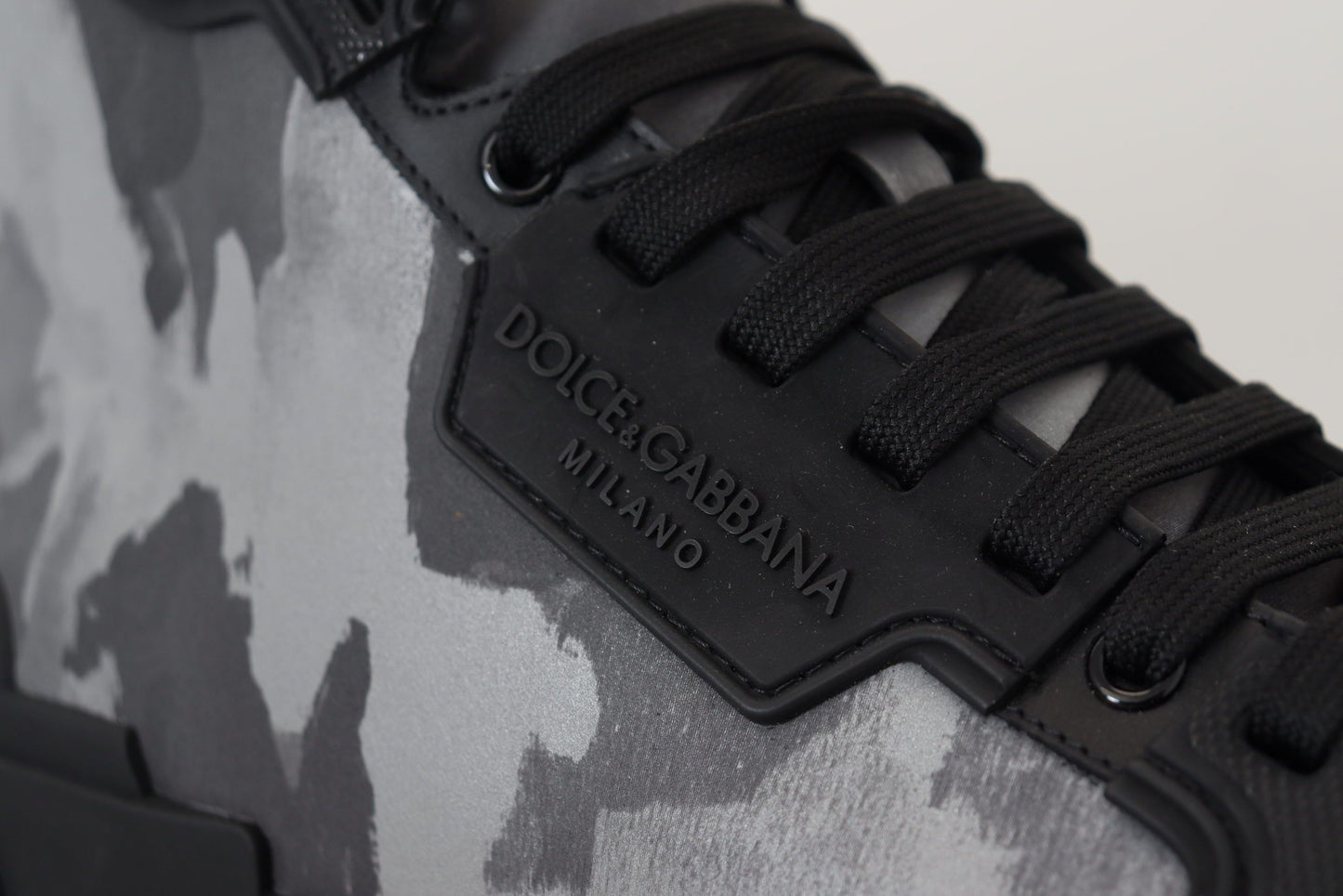 Step up your sneaker game with these striking high-top sneakers, unveiled by the prestigious Dolce & Gabbana. These shoes aren’t just a fashion statement; they’re an Italian-crafted treasure, blending both luxury and edgy style. The pair boasts a unique gray camouflage print interspersed with sleek black details for a contemporary look. With their remarkable logo details and enduring rubber soles, these kicks are made for those who appreciate the finer things in style and comfort. Adorn your feet with the excellence of Dolce & Gabbana craftsmanship.