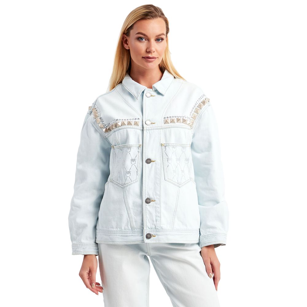 Pinko light blue denim jacket with metal studs and applied glitter and crystal details, two chest pockets and two front pockets, button closure