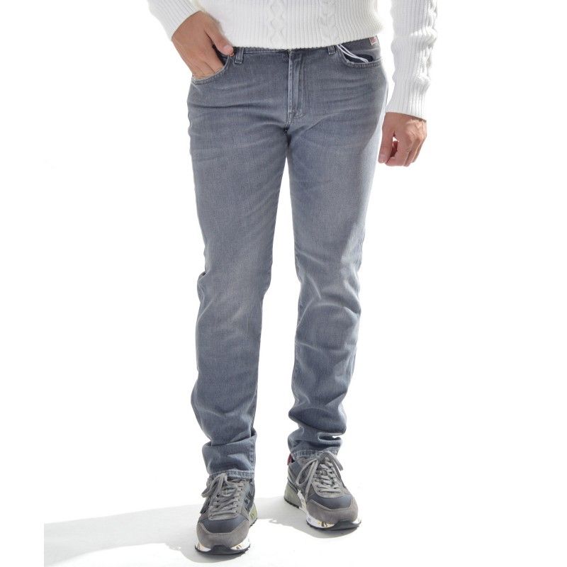Embrace Italian elegance with these sophisticated gray jeans, meticulously crafted for the modern man. The Sharon model encapsulates a sleek design with its five-pocket silhouette, complete with zip and button closure. A testament to quality and comfort, these jeans are made from a blend of 98% cotton and 2% elastane, ensuring both durability and flexibility. The leather patch on the back adds a touch of luxury, while belt loops provide functionality for your daily wear.