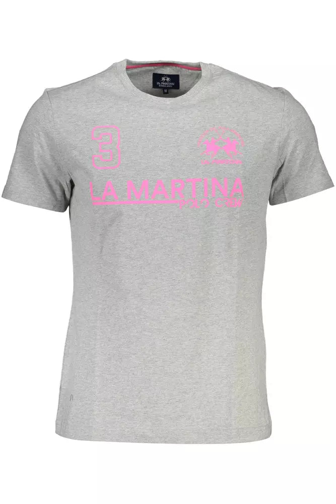 Discover pure comfort and style with La Martina’s finely crafted gray t-shirt. Designed for those who appreciate a blend of simplicity and sophistication, this regular-fit tee features a classic round neck and is adorned with a distinctive print and the iconic La Martina logo, embodying casual luxury.