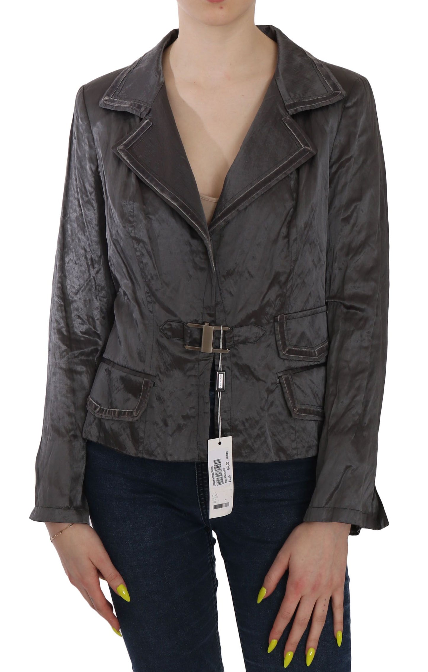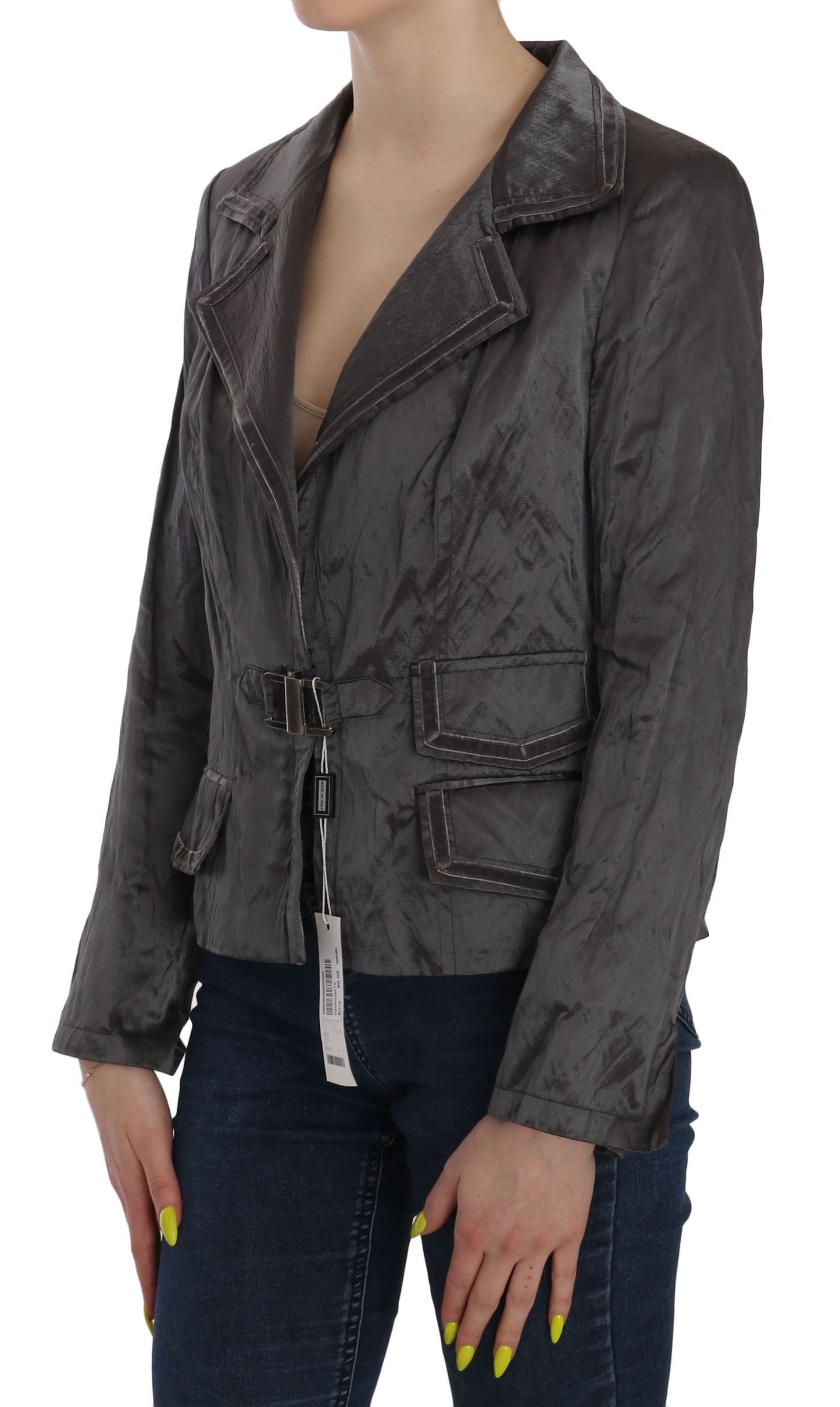 Indulge in the epitome of sophistication with our Gorgeous, brand new with tags blazer jacket from BENCIVENGA. This exquisite piece features a sleek metallic gray color, complemented by a unique metal lock front closure. Experience the pinnacle of luxury and craftsmanship with logo details that exude elegance.
