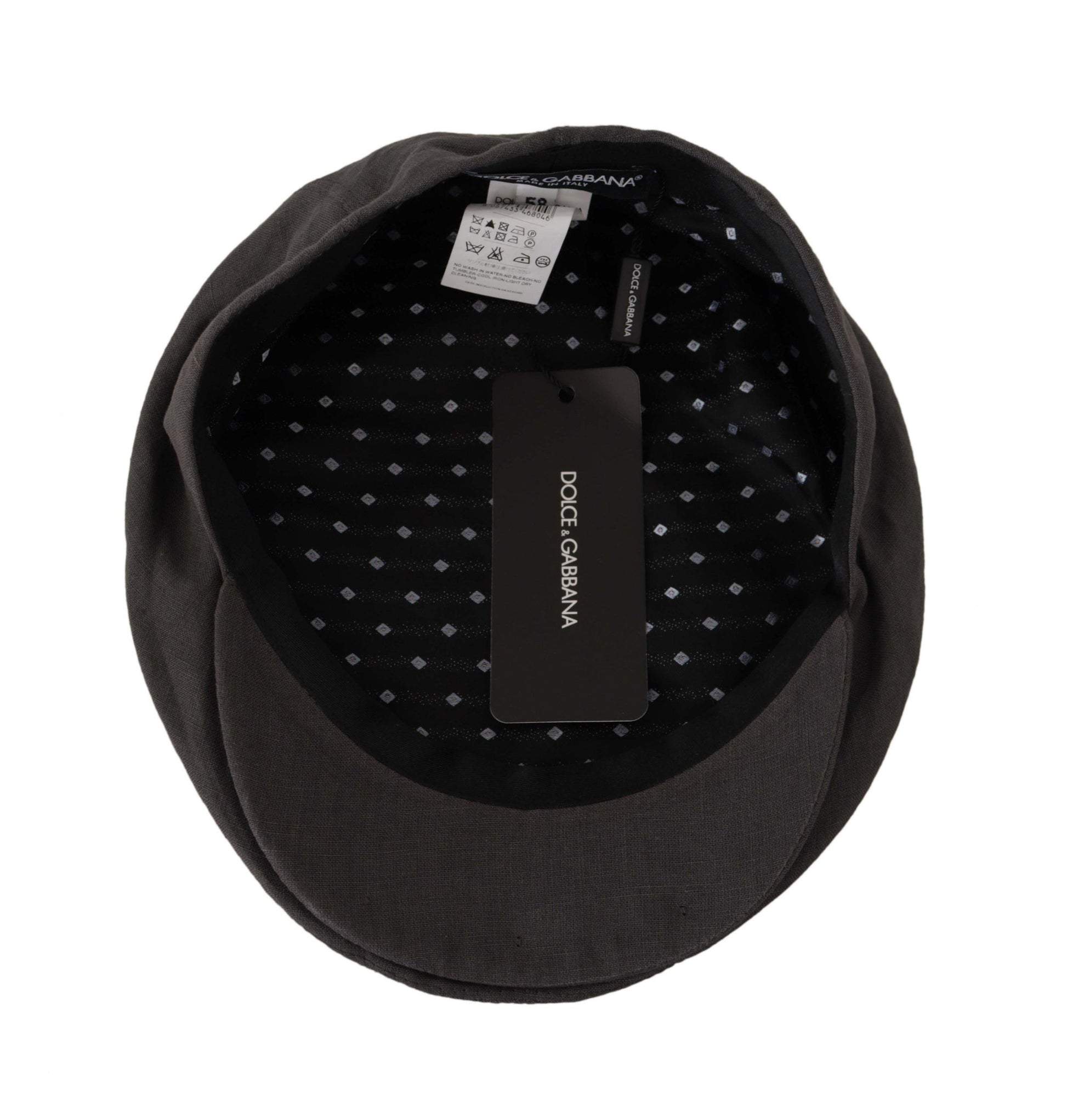 Step out in style with this chic and timeless Dark Gray Newsboy hat by the luxurious Dolce & Gabbana. Exude elegance with this 100% authentic piece, perfect for fashion-forward individuals looking to add a classic touch to their wardrobe. Crafted from high-quality linen, this hat provides both comfort and a distinguished look. Proudly made in Italy, it features subtle logo details that signify the brand’s renowned craftsmanship.