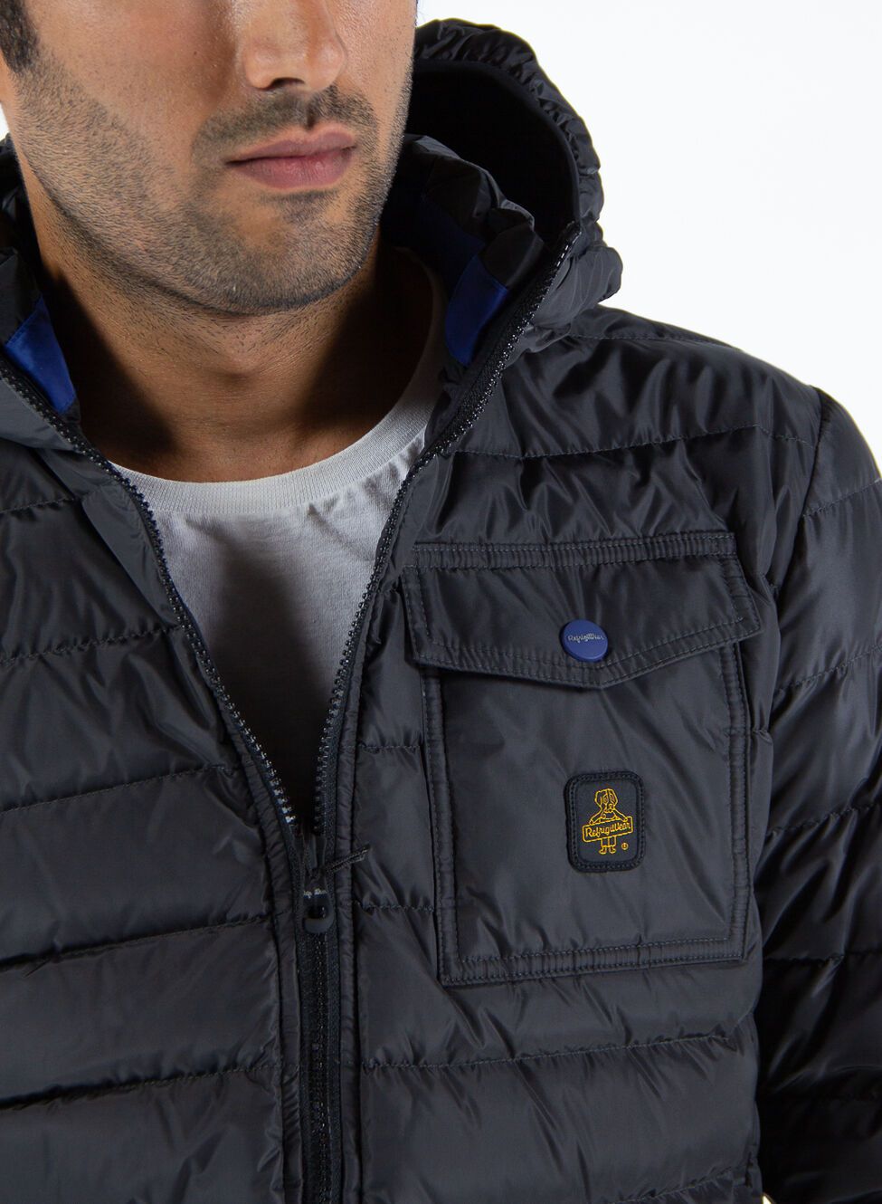 Embrace the cold in style with our chic gray down jacket, complete with a cozy hood, snug side pockets, and a practical zip closure. A sleek chest pocket with button closure adds a touch of functional elegance.