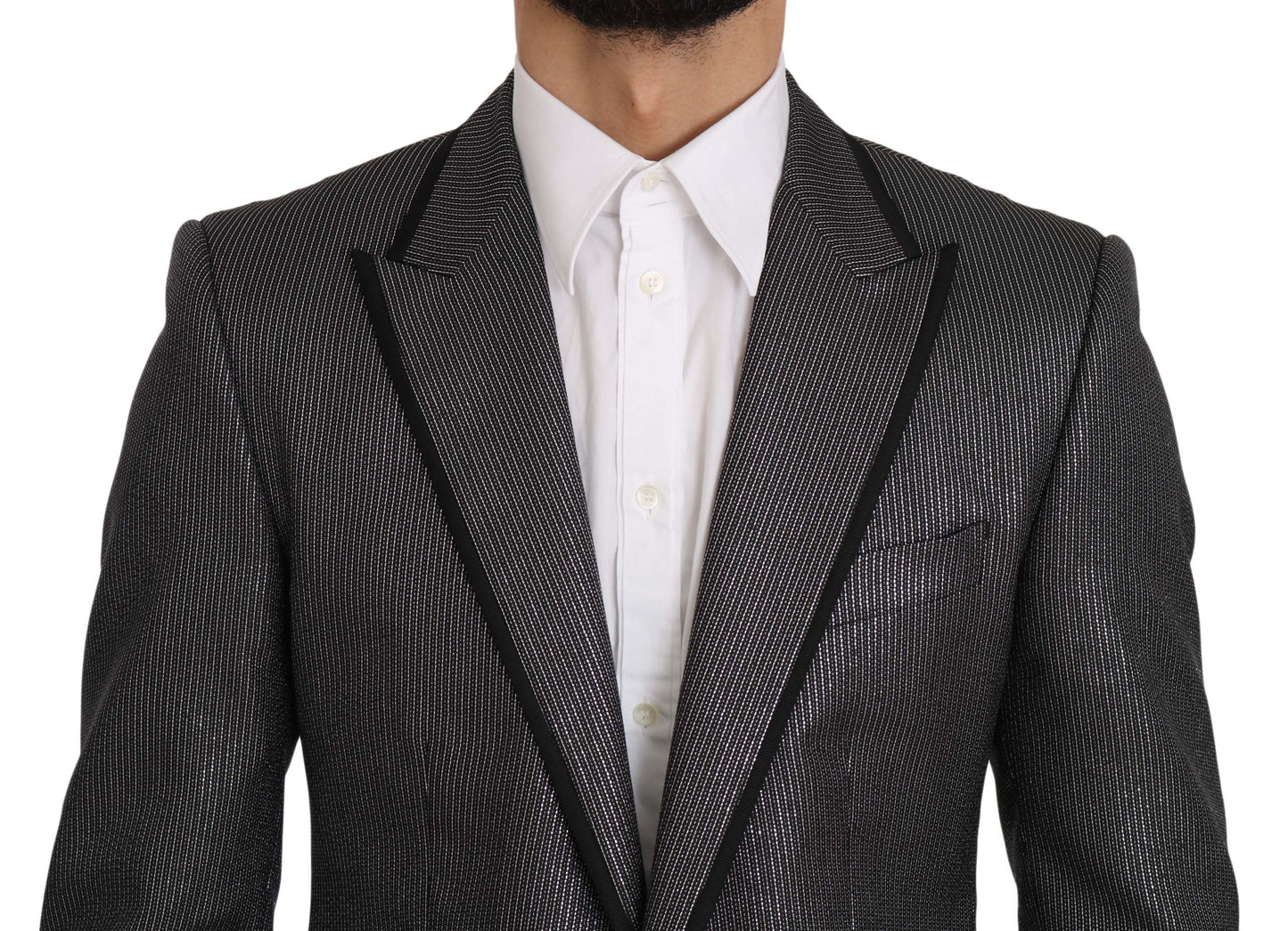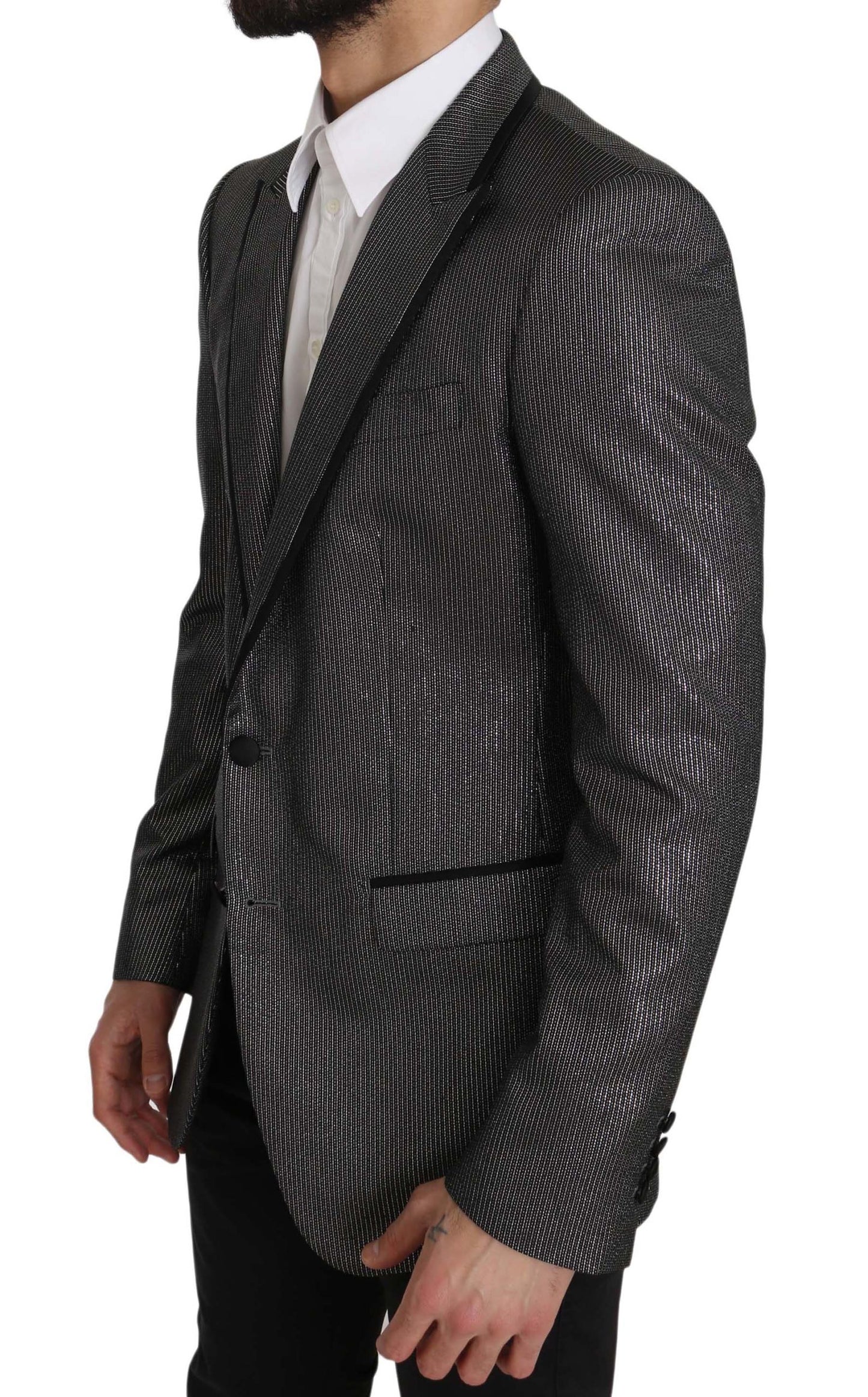 Step up your suiting game with this impeccably crafted Dolce & Gabbana Martini Blazer. The perfect blend of high fashion and timeless style, this slim-fit jacket is designed to elevate your wardrobe to new heights of elegance. With its subtle gray stripes and masterful Italian craftsmanship, this piece reflects luxury and sophistication. It boasts a sharp silhouette accentuated by a single breasted two-button fastening, and promising a snug yet comfortable fit. Its versatile design features a multitude of pockets, providing both functionality and style. The luxurious blend of materials promises durability and a soft, elegant drape, making it perfect for any high-end occasion. Experience the comfort of its smooth lining and the understated panache of logo details. Truly an exclusive piece with unrivaled craftsmanship.