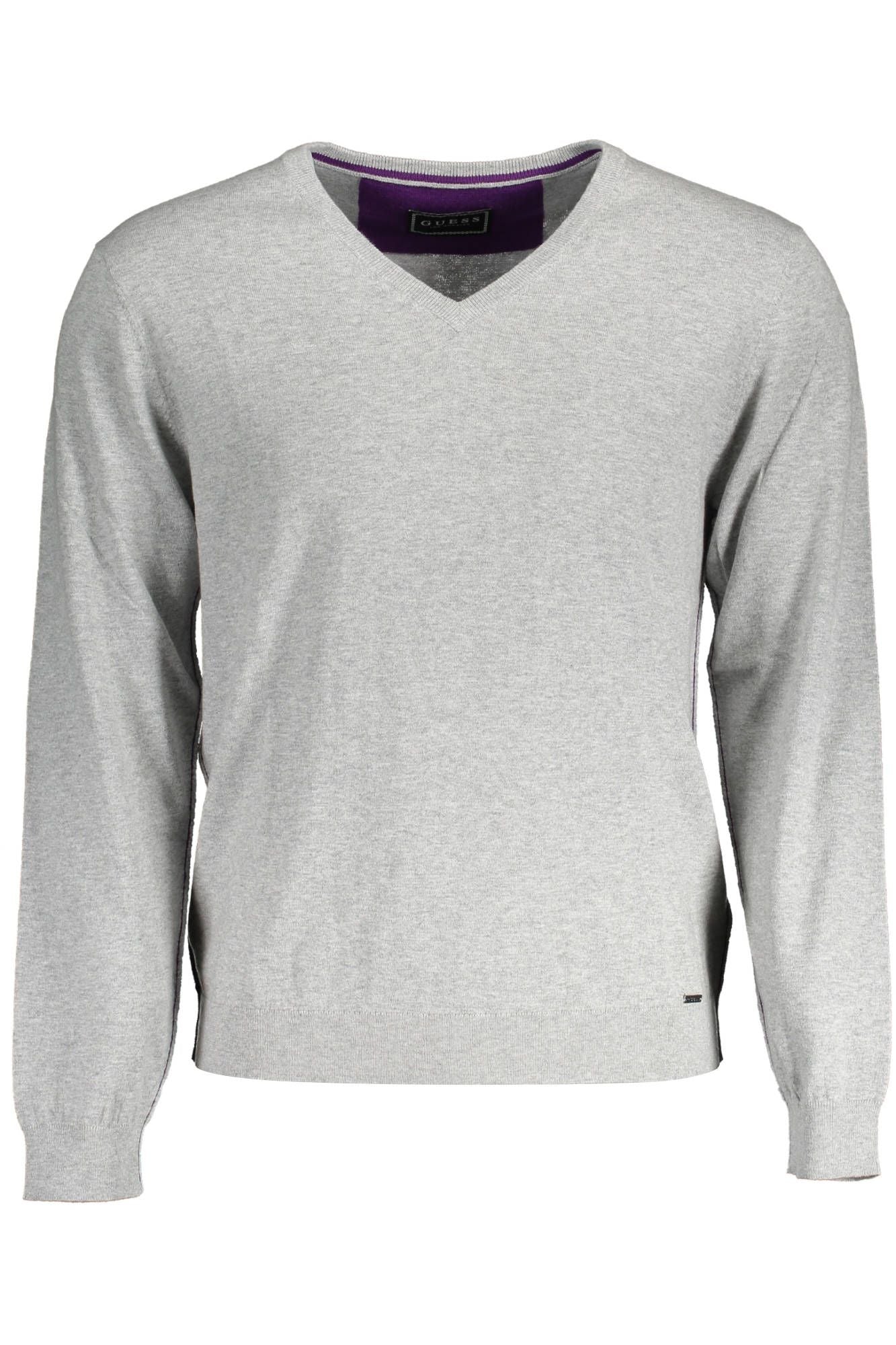 Elevate your style with this sophisticated gray long sleeve sweater featuring a sleek ‘v’ neck design and eye-catching contrasting details. Adorned with the Guess Jeans signature logo, it offers both comfort and class for the discerning gentleman.