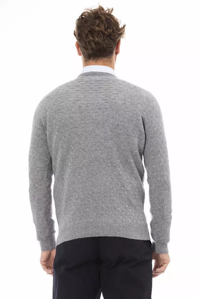 Indulge in the epitome of comfort and style with Alpha Studio’s luxurious V-neck sweater. Lovingly crafted with a blend that includes delicate cashmere and warm wool, this sweater features a classic ribbed collar, cuffs, and bottom for a snug, regular fit. Its versatile gray color ensures it pairs effortlessly with your existing wardrobe. Perfect for elevating your everyday look or adding a touch of sophistication to your evening ensemble.