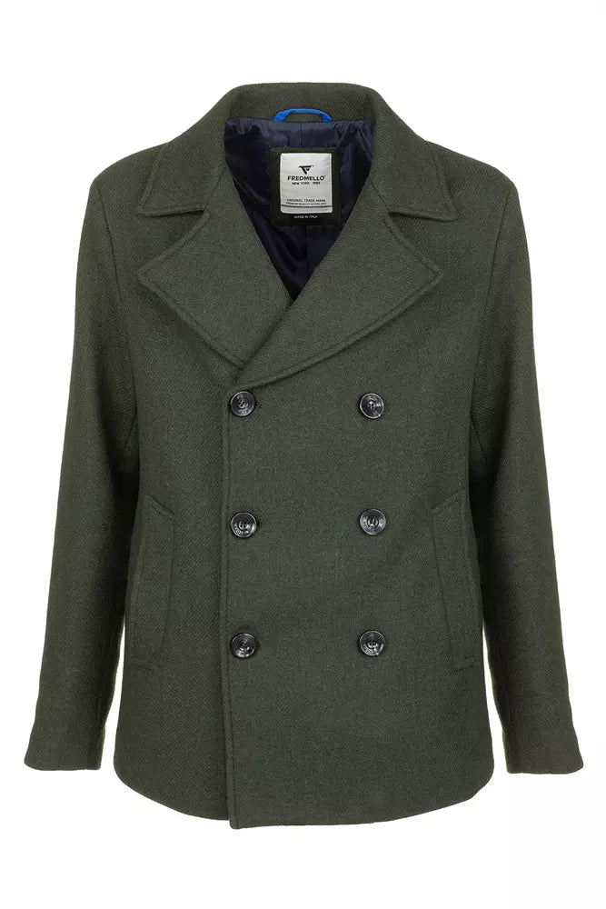 Immerse yourself in Italian elegance with this sophisticated Fred Mello men’s short coat. Showcasing a refined double-breasted three-button closure, this coat is not only stylish but also functional with its convenient inside breast pocket and practical open side pockets. Crafted with a harmonious blend of quality materials, this coat is a testament to classic tailoring and contemporary design.