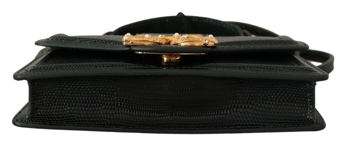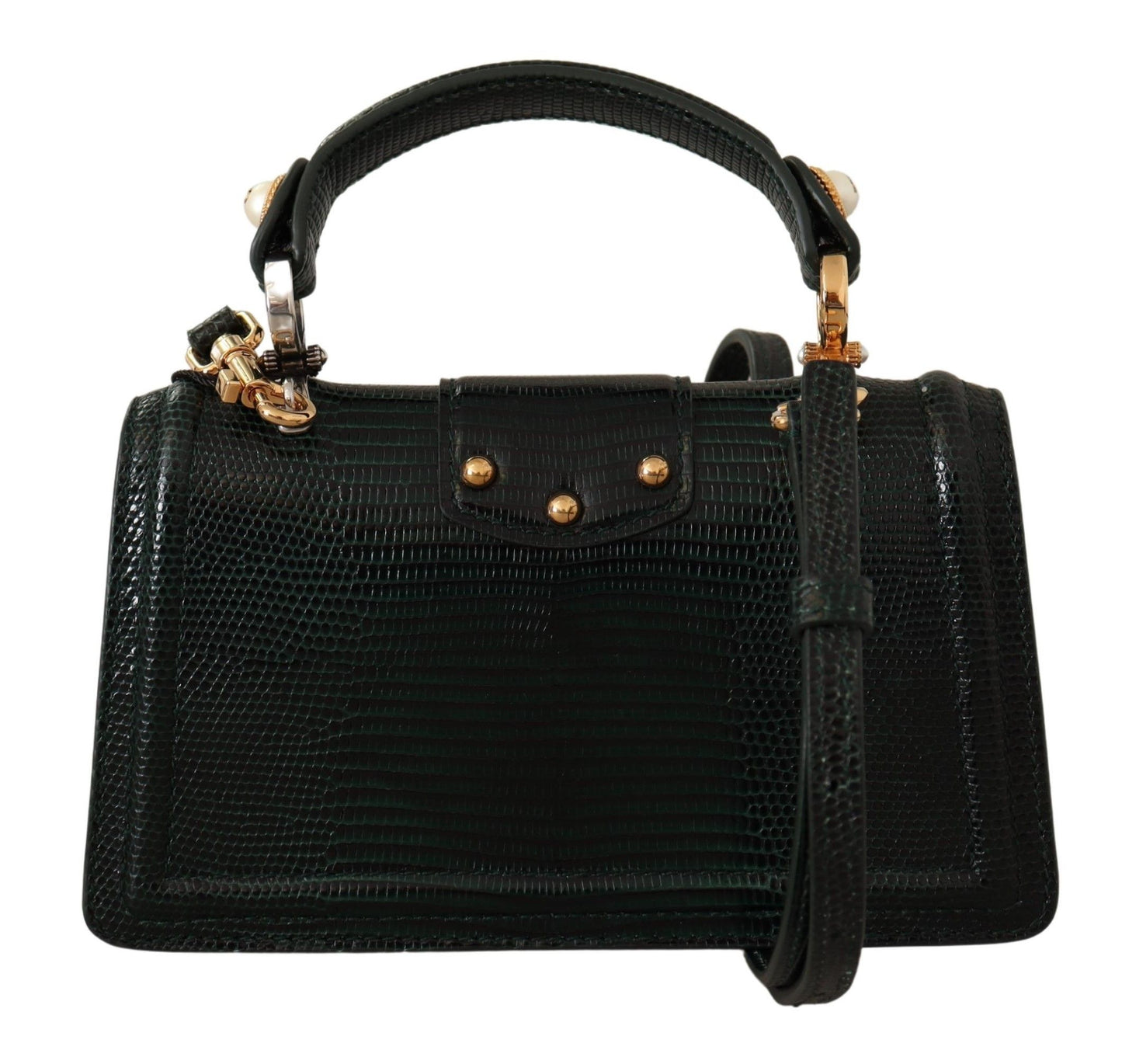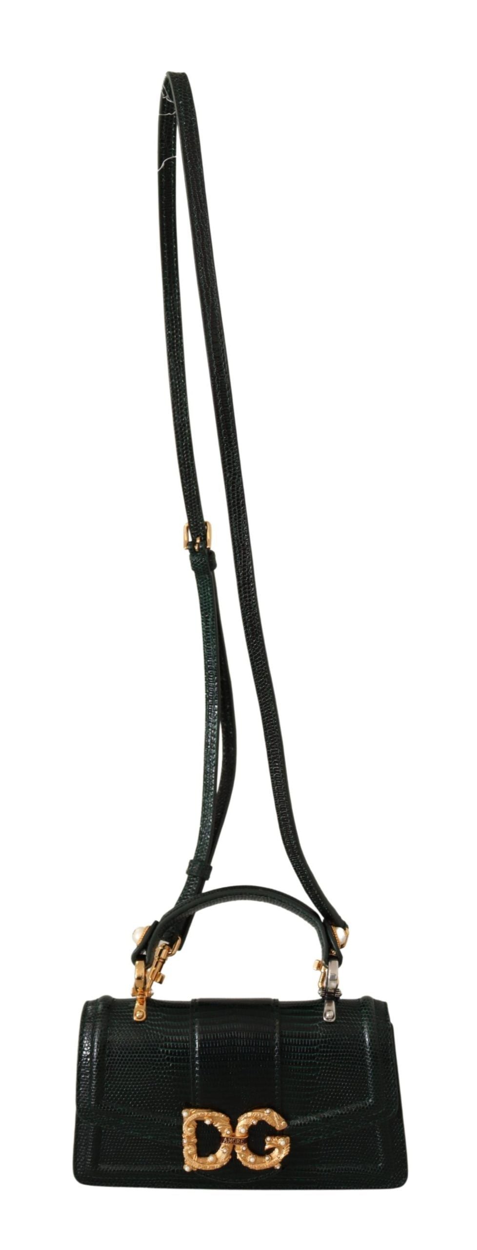 Indulge in the epitome of luxury with our exquisite Dolce & Gabbana Amore shoulder bag. Crafted from premium quality leather and drenched in a vibrant green hue, this purse is accentuated with gold and silver metal details. The front flap features a sumptuous bejeweled DG, hand-tooled from a metal alloy with elegant pearl inlay, while the interior boasts a chic leather lining.