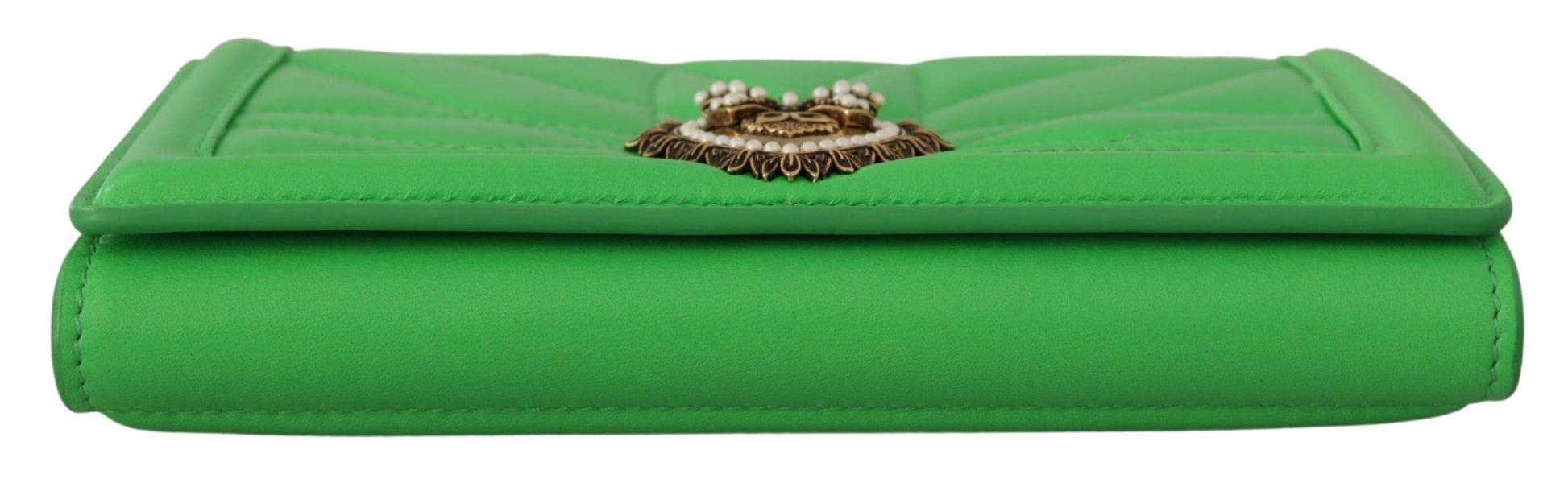 Indulge in the ultimate combination of luxury and functionality with this Dolce & Gabbana wallet case, designed to fit your iPhone 11 Pro with sophistication. Crafted from premium leather in a lush green hue, this case features a sleek gold shoulder chain, perfect for an on-the-go lifestyle. Keep your essentials organized with convenient credit card slots and secure your device with the stylish button flap closure, all while showcasing timeless elegance.