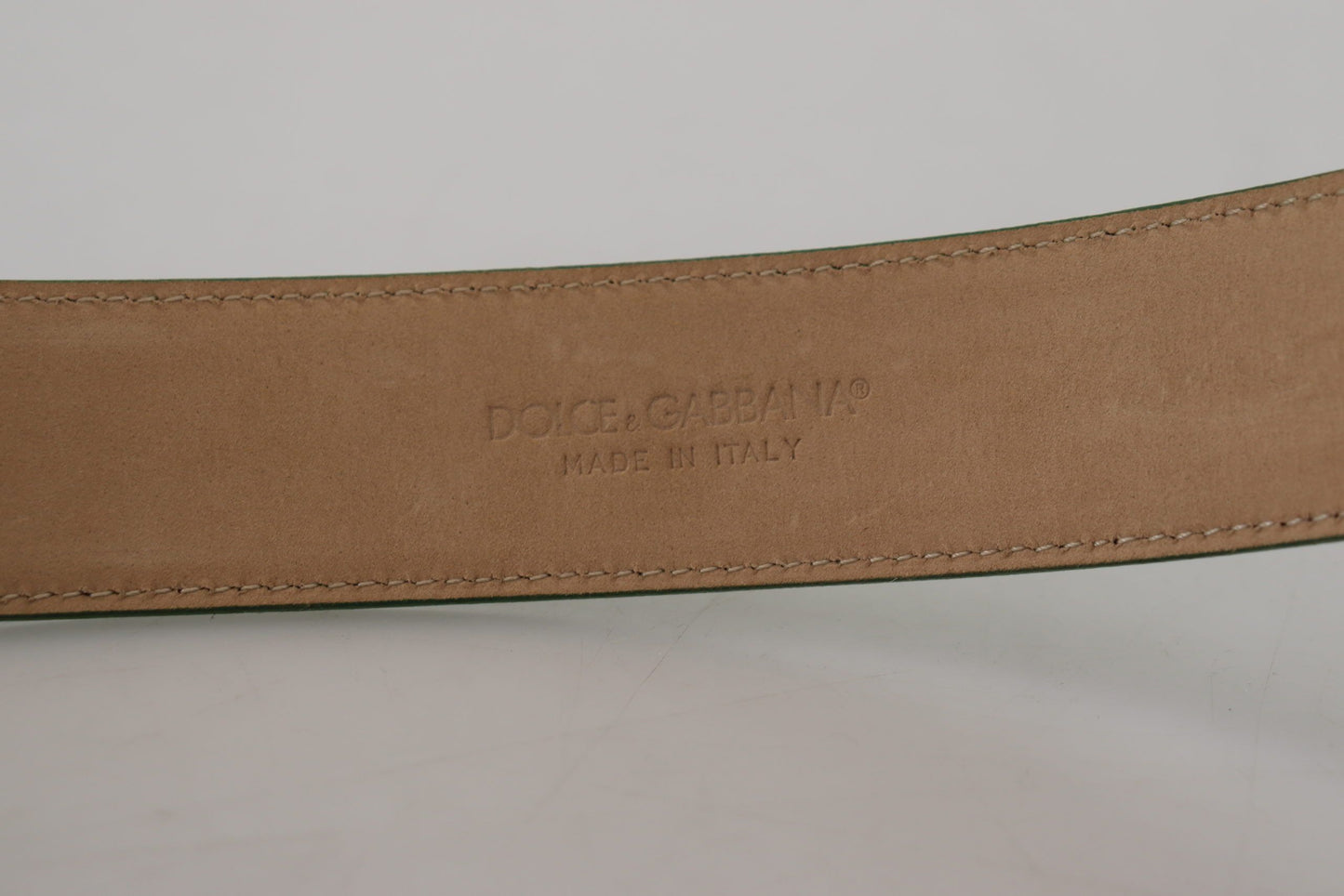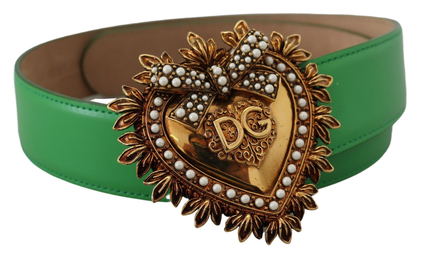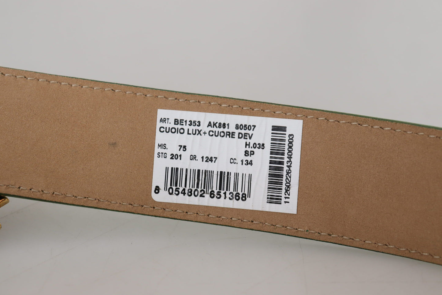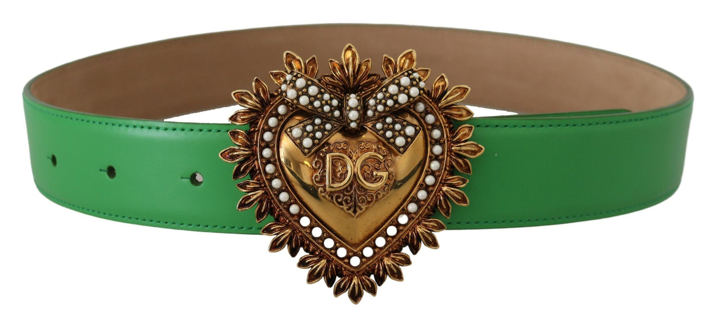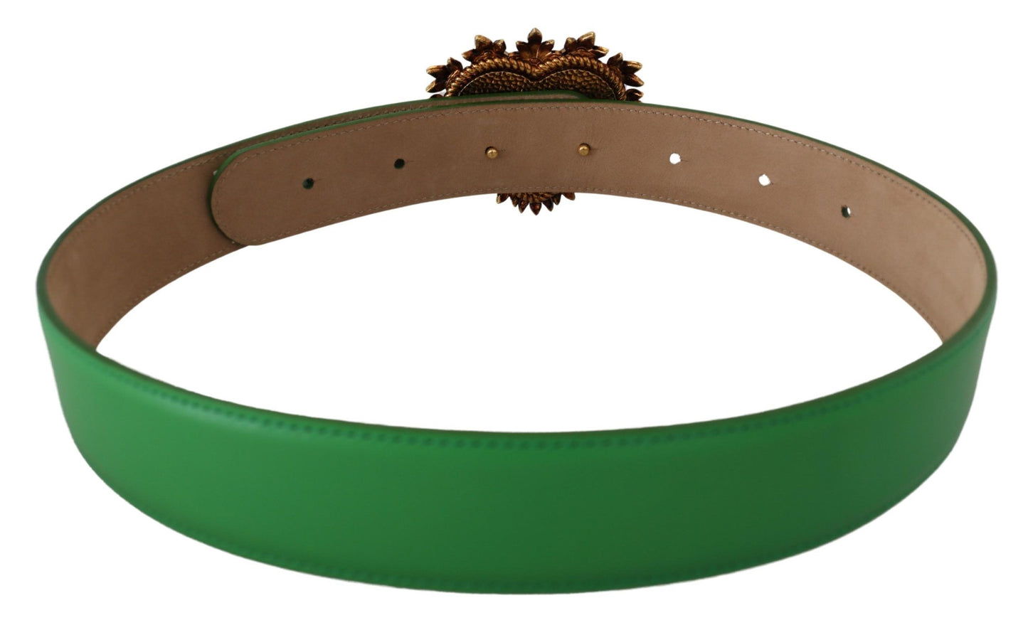 Adorn your waist with the epitome of luxury with this stunning Dolce & Gabbana belt. Crafted from the finest 100% leather in a rich green hue, this accessory features an exquisite gold Devotion Heart buckle that adds a touch of glamour to any outfit. Perfect for women who appreciate high fashion and timeless elegance, this belt is made in Italy and comes with tags and its original box, ensuring its authenticity and brand-new condition.