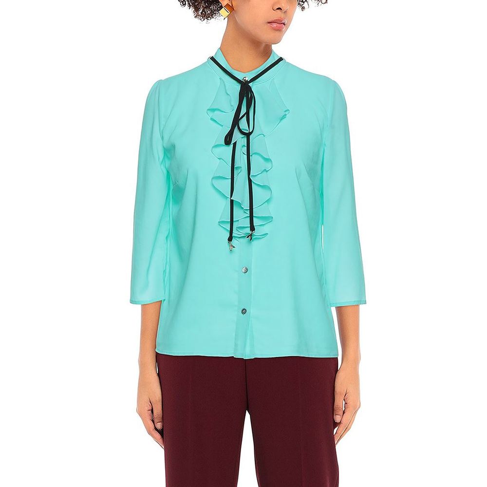 Embrace a touch of sophistication with this Patrizia Pepe crepe blouse. This charming piece is designed with a neat mandarin collar and secure button closure, while the delicate ruffle decoration on the front provides an air of refined femininity. The addition of a black cord around the neck offers a striking contrast against the light blue palette, ensuring this blouse stands out in any wardrobe.