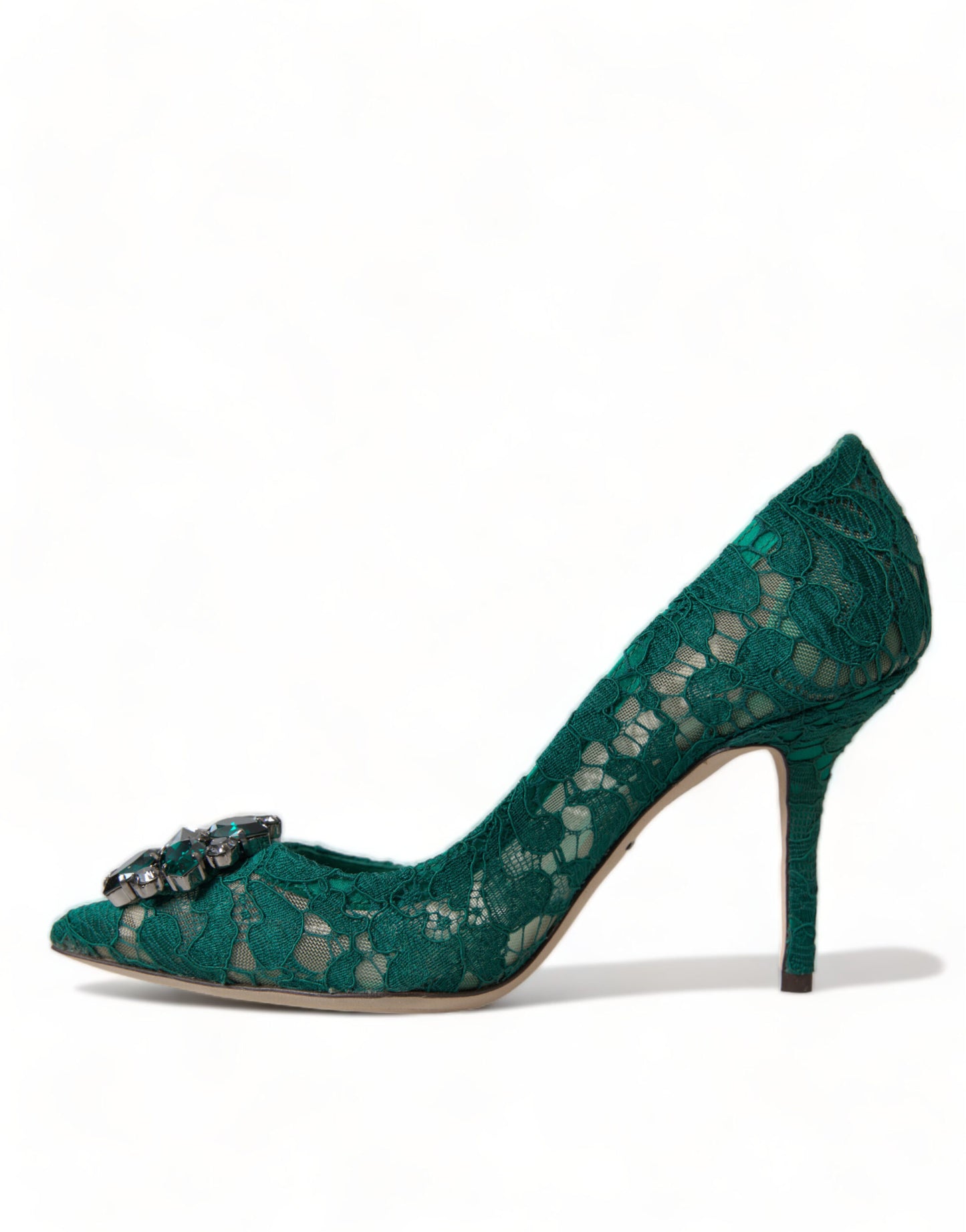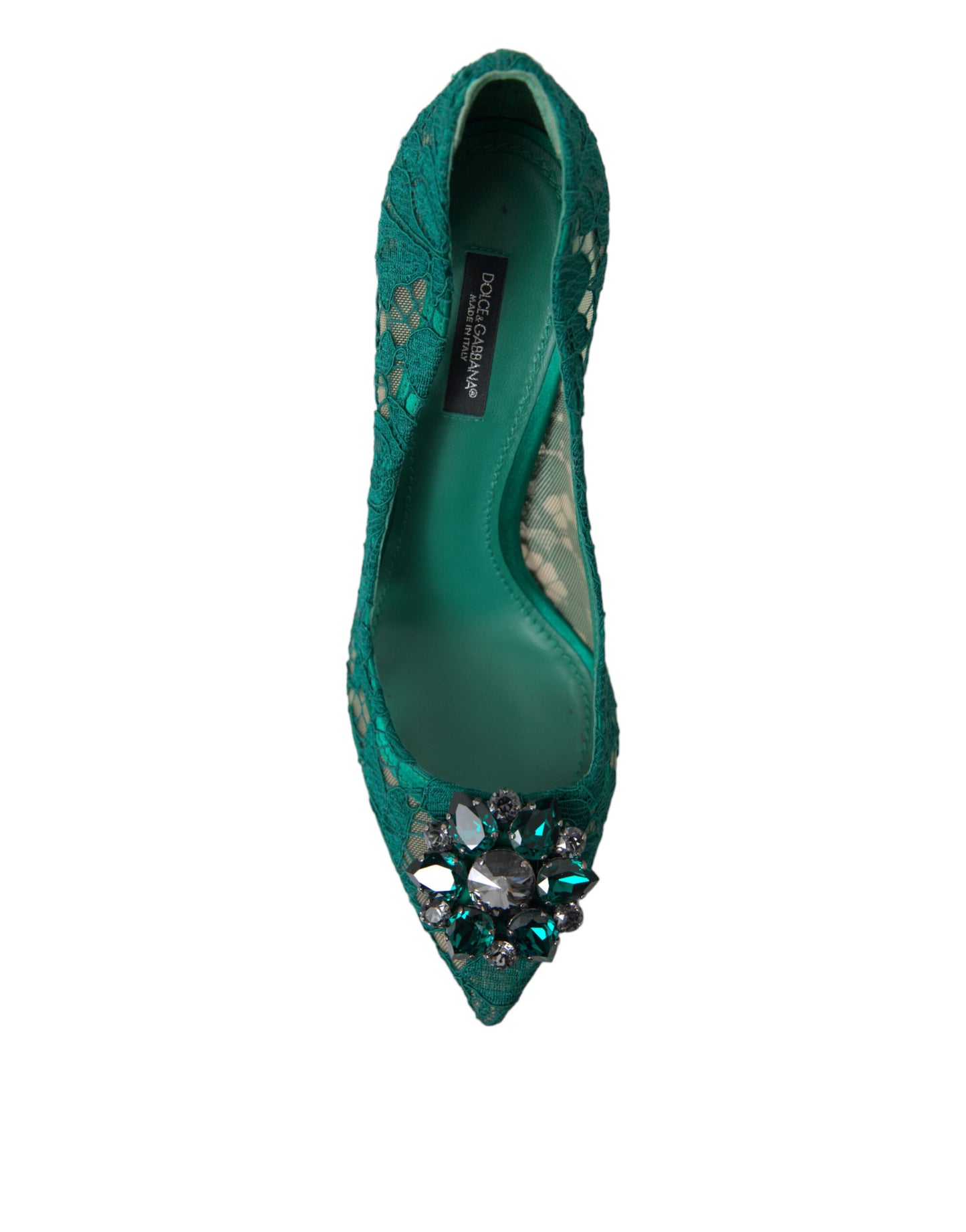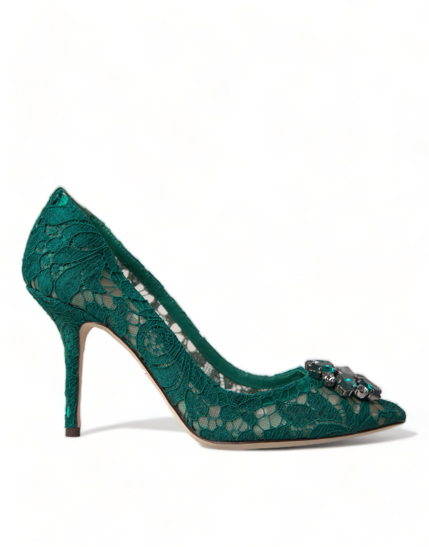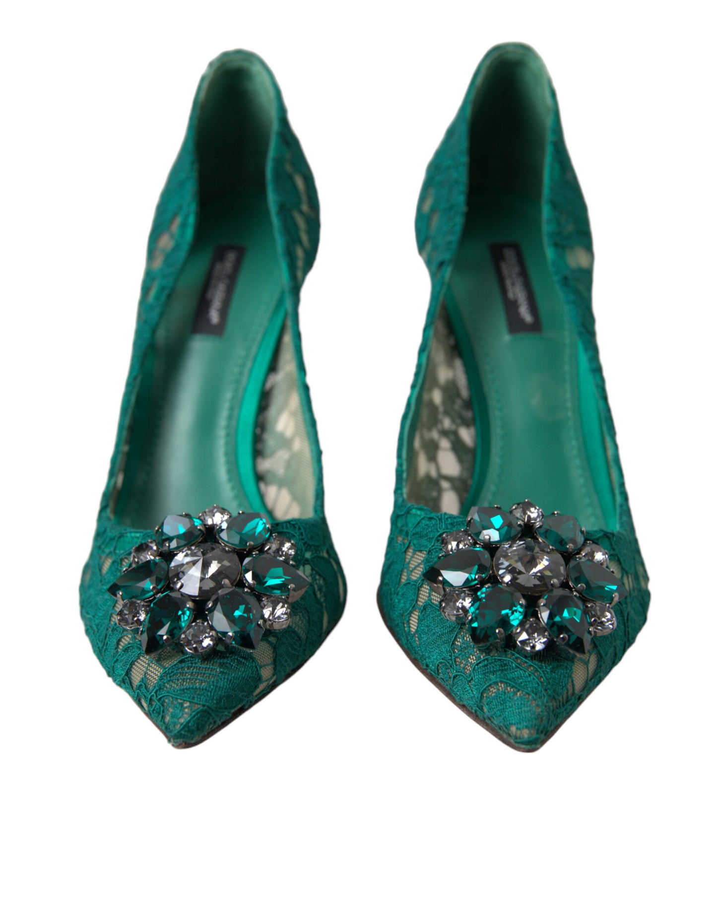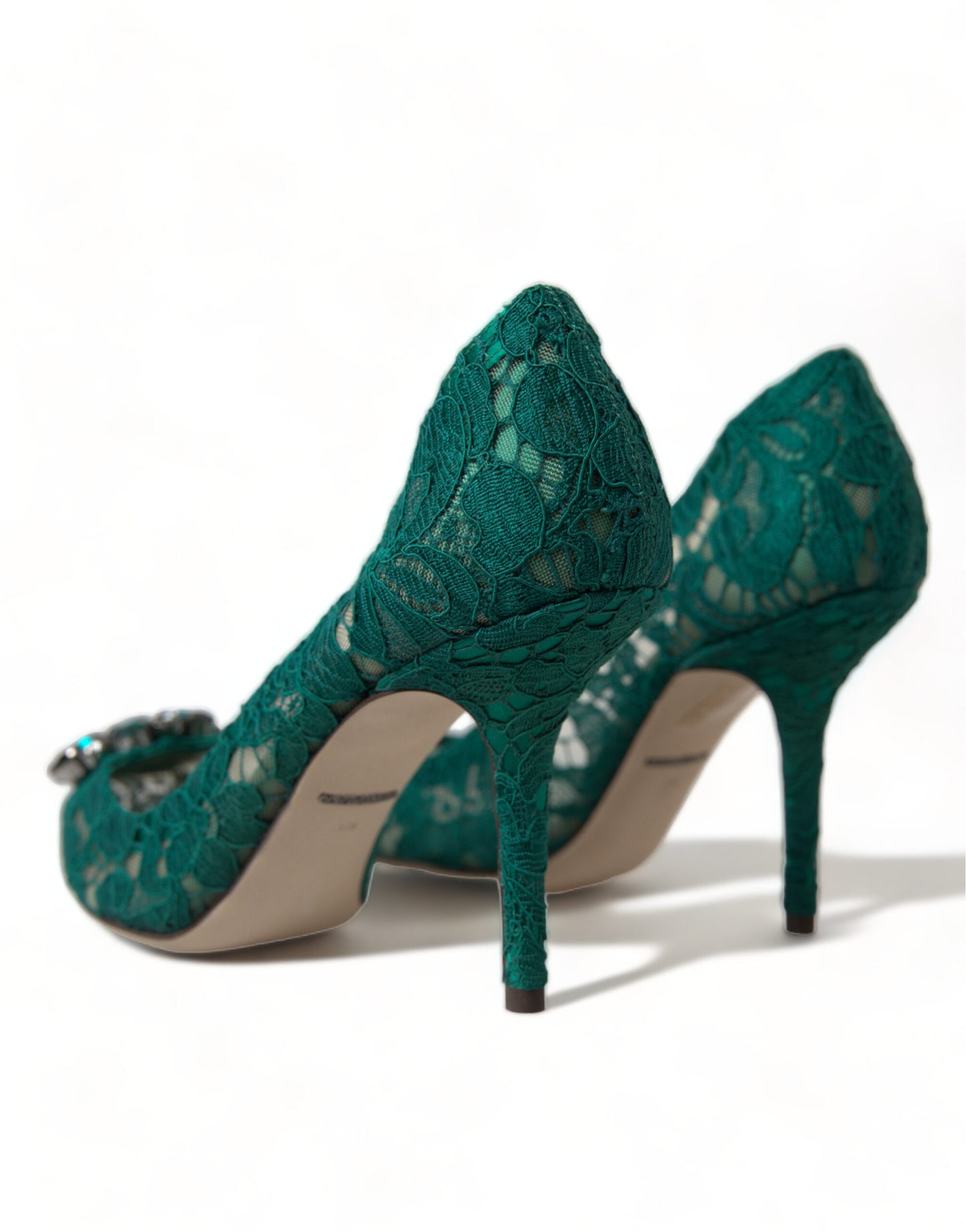Step into luxury with these stunning heels by Dolce & Gabbana. Crafted from taormina lace with exquisite crystal embellishments, these pumps are the epitome of elegance. A vibrant green hue stands out, matched beautifully by the gray crystals. Designed with a leather sole, logo details, and made with Italian craftsmanship, these shoes are a symbol of fashion and finesse.