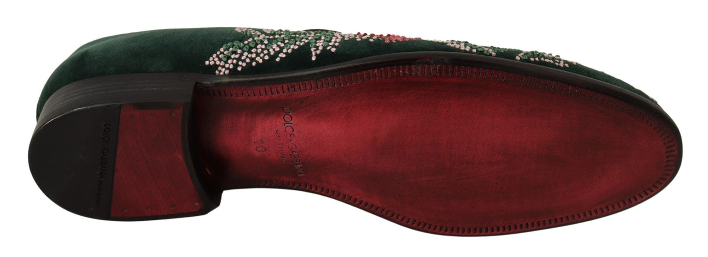 Step into luxurious comfort with these opulent Emerald Velvet Embroidered Loafers by Dolce & Gabbana. Meticulously crafted with a plush velvet cotton material, these shoes don’t just whisper but shout high craftsmanship and exclusive style. The vibrant green hue serves as the perfect backdrop to multicolored embroidery and sequined details that elevate this footwear to a piece of art. Constructed with a refined leather sole and adorned with logo details, these loafers are a true testament to Italian artisanship, ready to enhance your wardrobe.