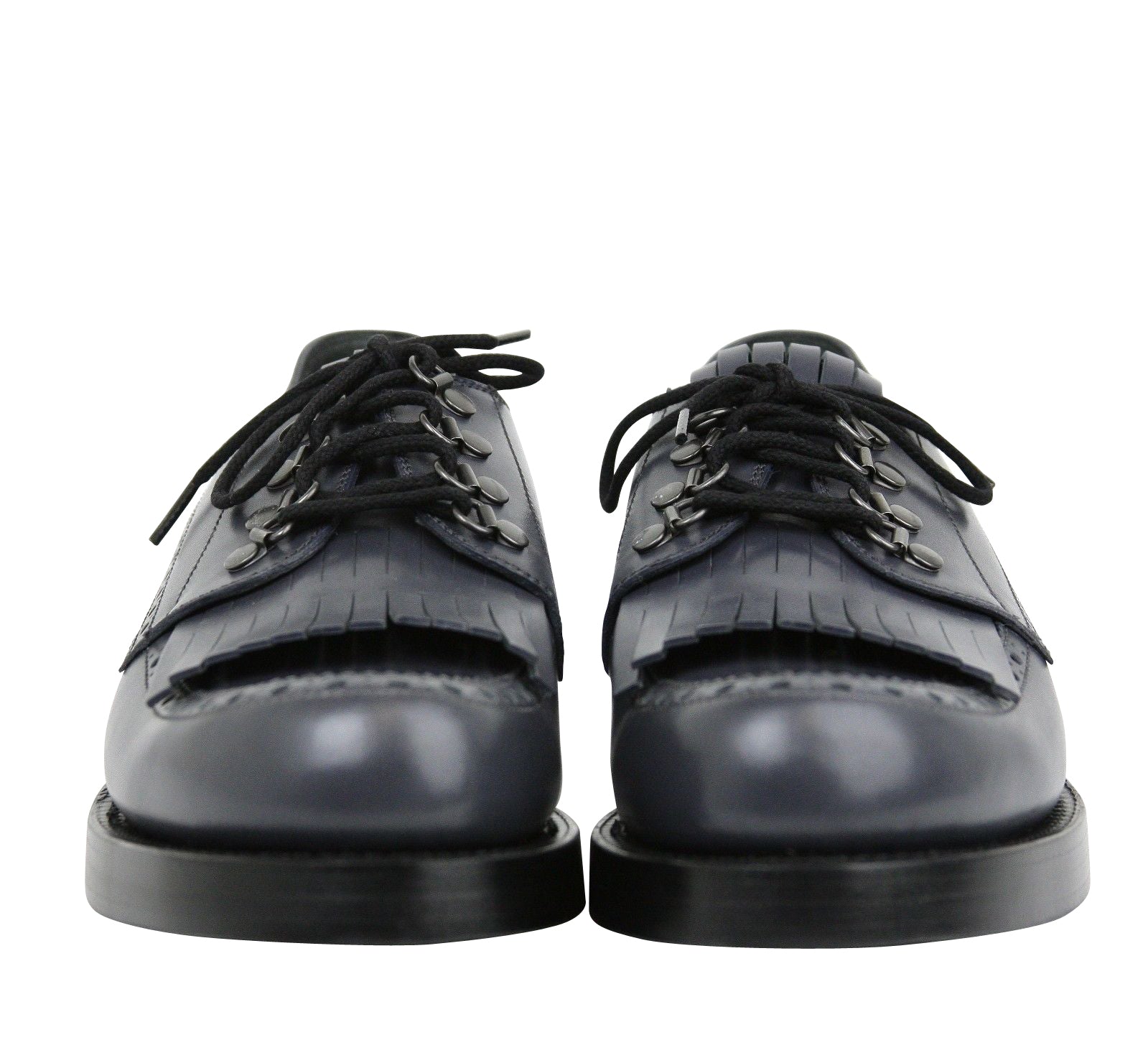Stacked leather sole and metal loops, Fringe detail, Lace-ups.