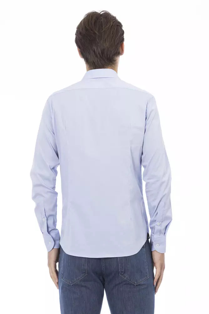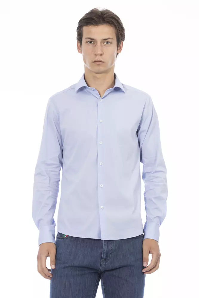 Immaculately tailored for the modern gentleman, this light-blue slim-fit shirt from Baldinini Trend exudes sophistication. Perfect for any professional or social setting, the shirt features a seamless front button closure, a sharp Italian collar, and signature logo details that punctuate its pristine design.