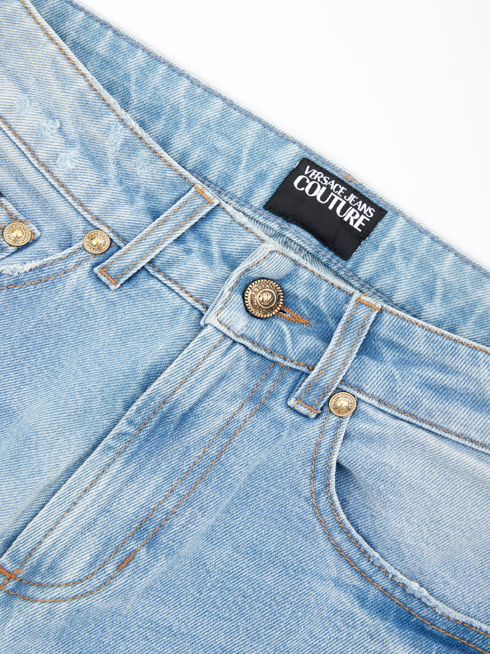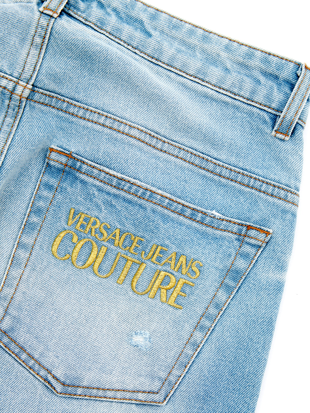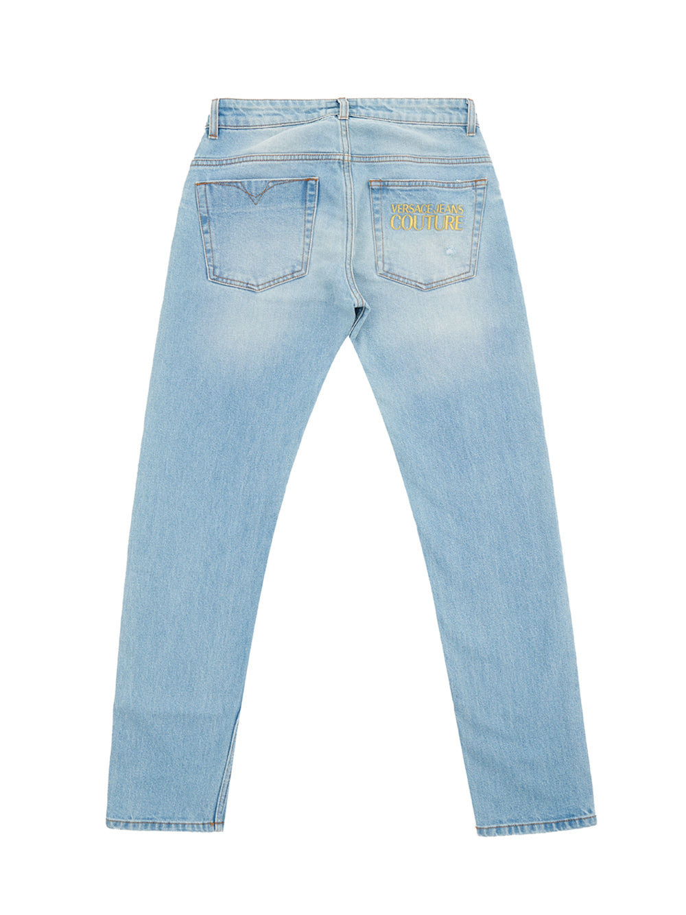 Step out in style with these impeccable straight fit denim jeans from Versace Jeans Couture. With a striking gold logo embroidery gracing the back pocket, they are a testament to classic design with a modern twist. Expertly crafted and ready to add elegance to any outfit, these jeans are a wardrobe must-have for those who appreciate luxury and style.