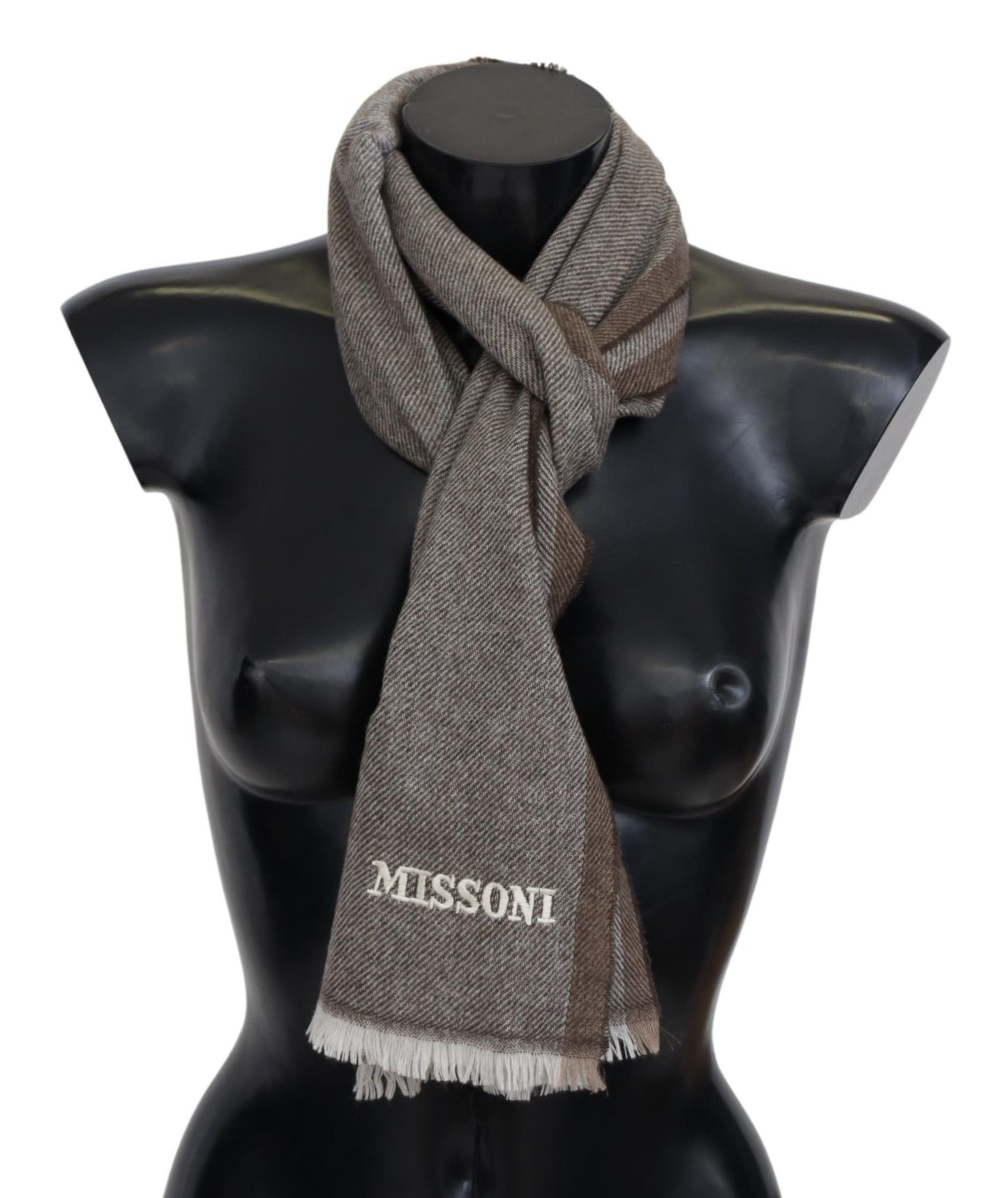 Indulge in the comfort and luxury of a beautiful 100% Authentic Missoni wool scarf. Perfect for enhancing any outfit, it features a stylish striped pattern, delicate fringes, and the iconic brand logo embroidery, showcasing the high-quality craftsmanship that is distinctly Missoni. This versatile light brown scarf transcends seasons and genders, making it an exquisite choice for anyone’s wardrobe.