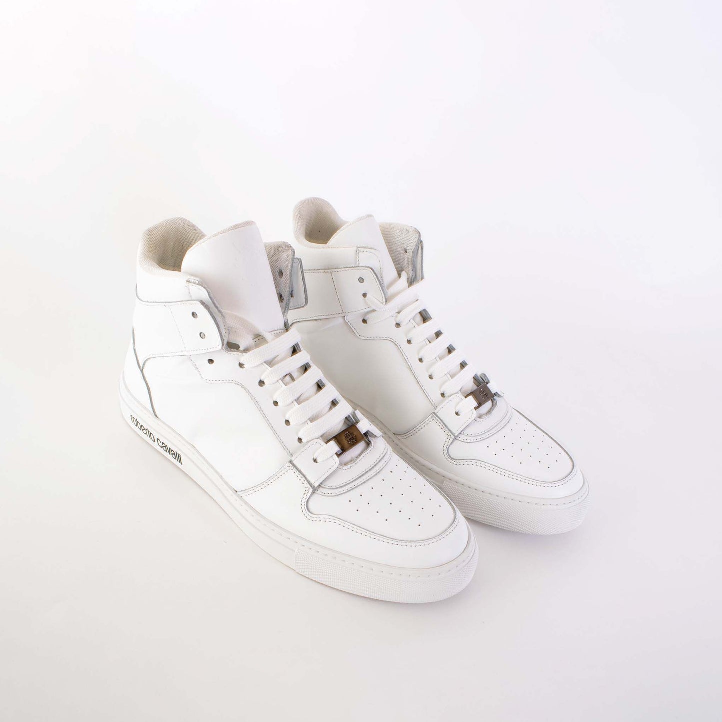 Elevate your style with these elegant Roberto Cavalli High-Top Sneakers. These brand-new, 100% Authentic sneakers blend luxury with casual flair, presenting a refined white suede finish that guarantees to add an exclusive touch to your ensemble. Crafted with high craftsmanship in Italy, they’re not only a symbol of fashion but comfort and durability too, featuring a matching white sole and the iconic logo detailing that adds an extra layer of sophistication to these trendy kicks.
