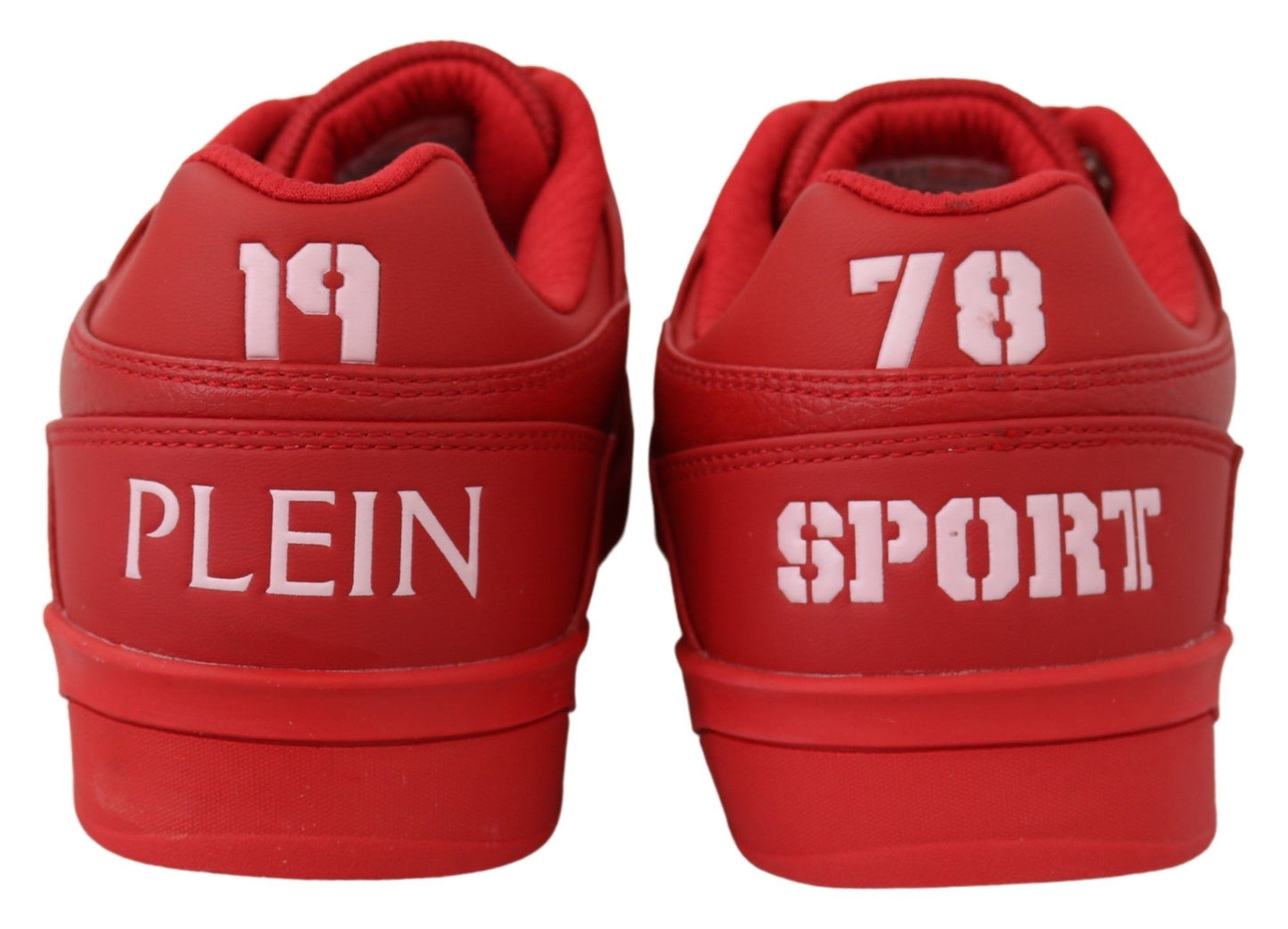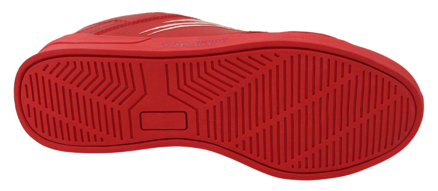 Step up your style with these 100% Authentic Plein Sport Men’s Sneakers. Brand new with tags and original box, these ‘Lincoln Sport Sneakers’ are designed to make a statement. Bathed in a striking Marlboro Red shade, these sneakers combine luxury with high craftsmanship. The durable rubber sole ensures long-lasting wear, while logo details add an exclusive touch of elegance to your stride.