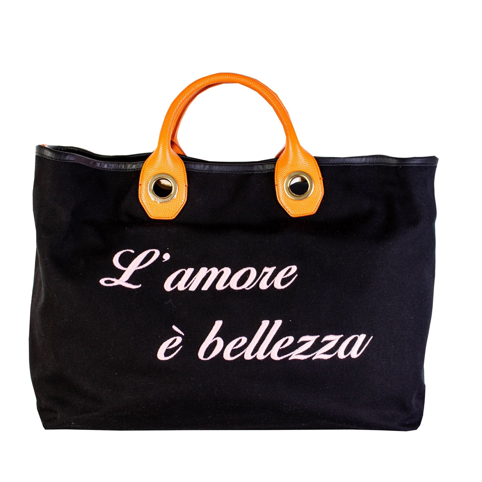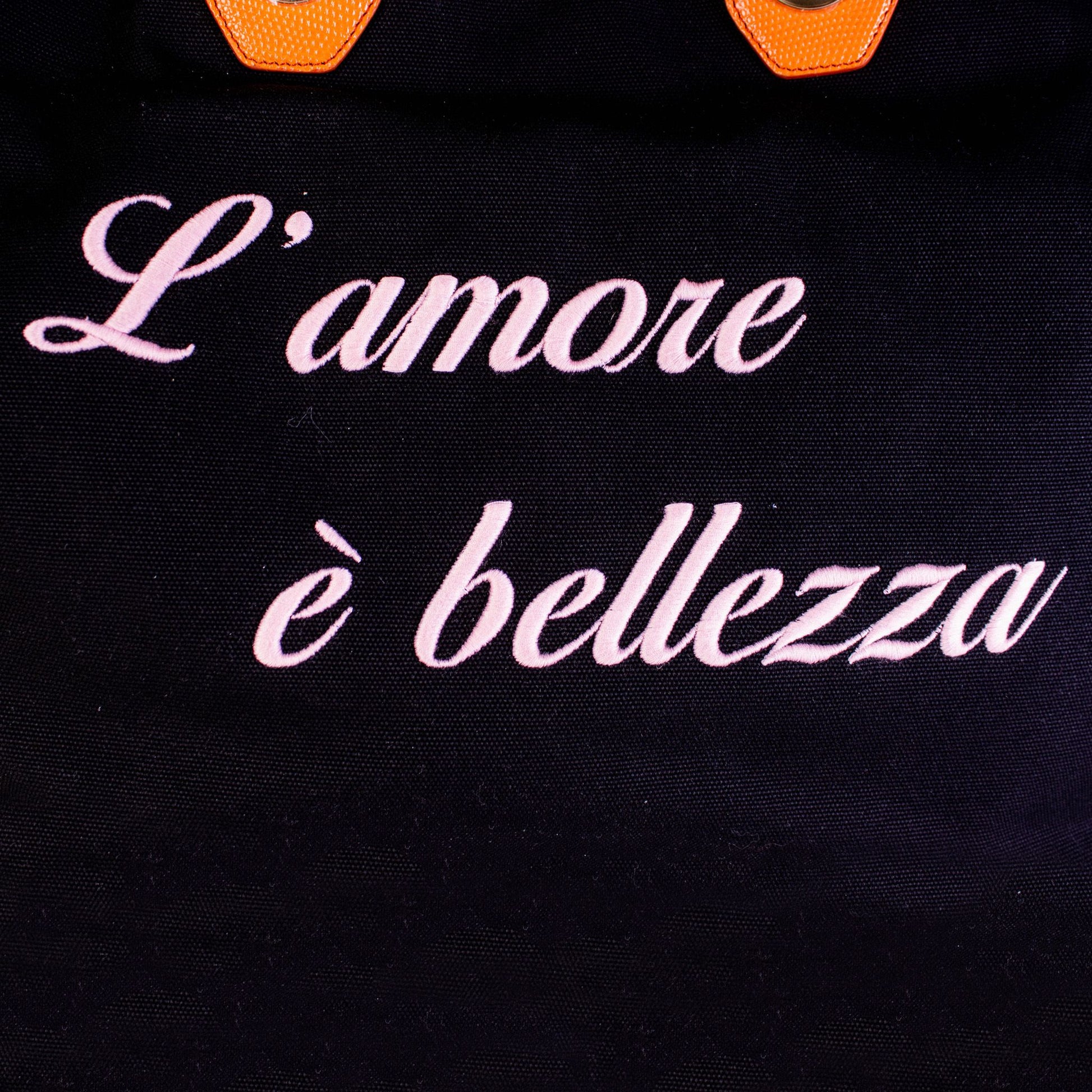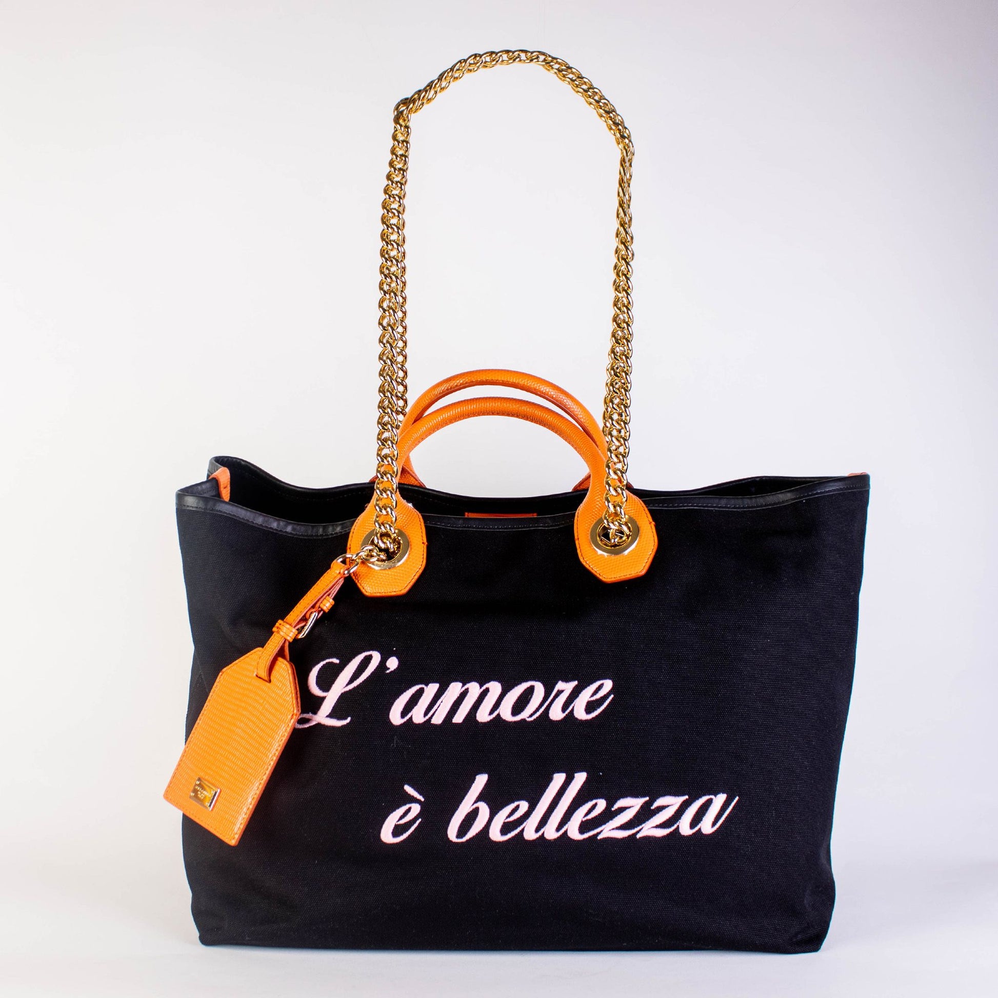 Discover the epitome of Italian luxury with this exquisite Dolce & Gabbana maxi handbag, featuring elegant ‘L’Amore è bellezza’ embroidery. Crafted from premium cotton and leather, this chic black handbag is your perfect companion for making a sophisticated statement. Designed with practicality in mind, it boasts internal pockets and comfortable leather handles. With its beautiful internal printed linen, this handbag marries functionality with high-end fashion, making it an essential piece for your collection.
