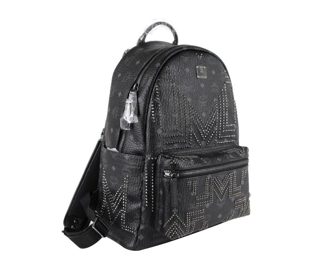 MCM Black Coated Canvas Studded Medium Backpack