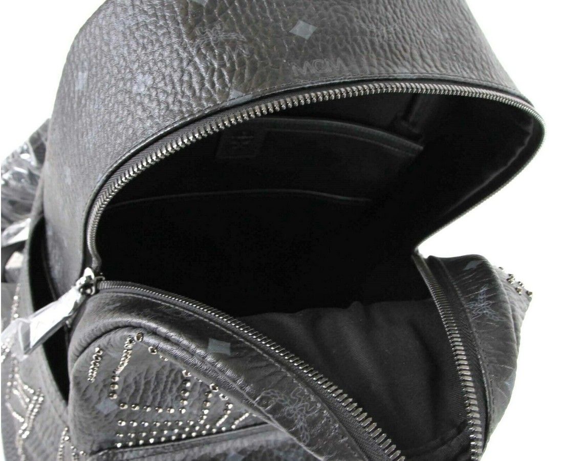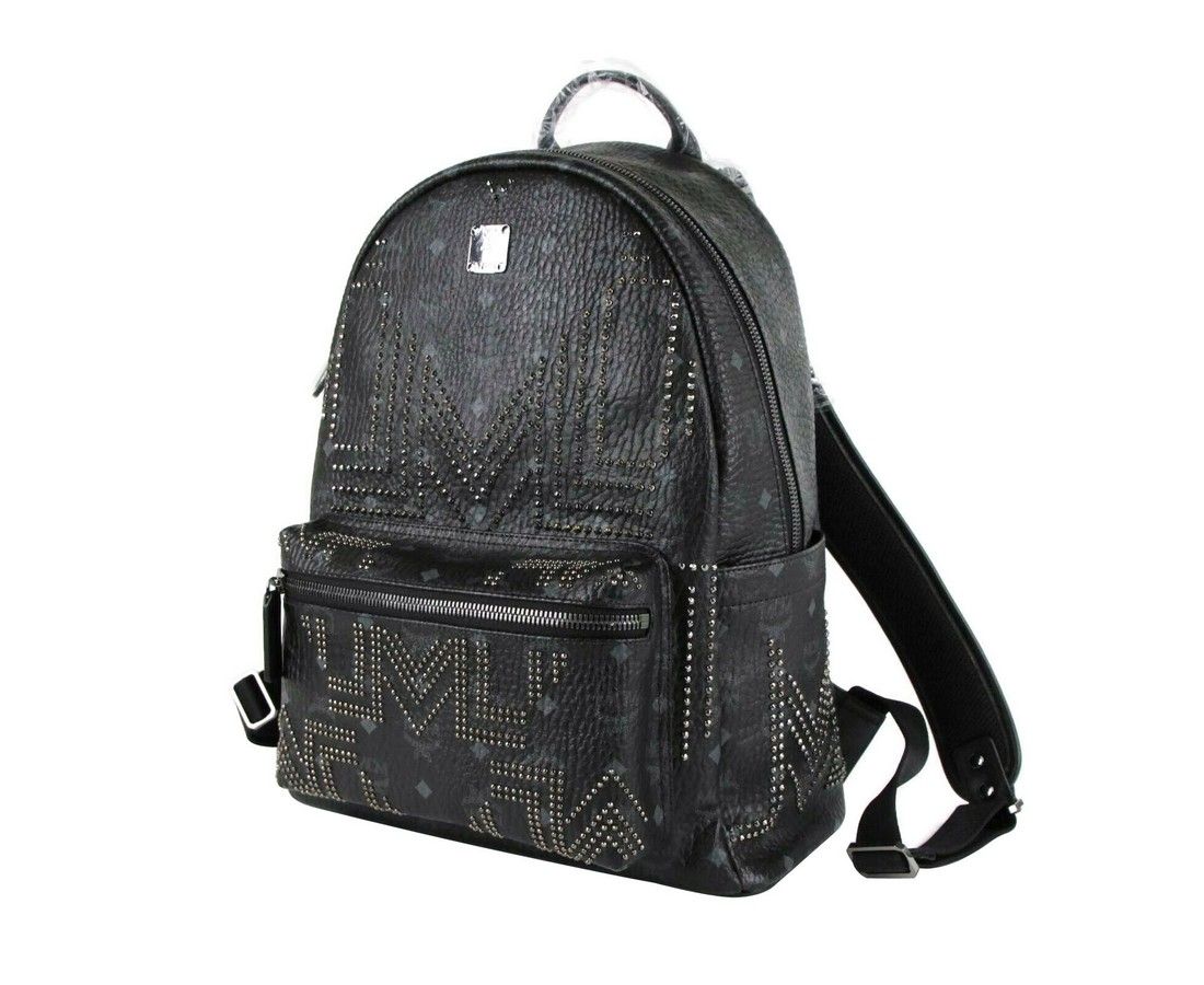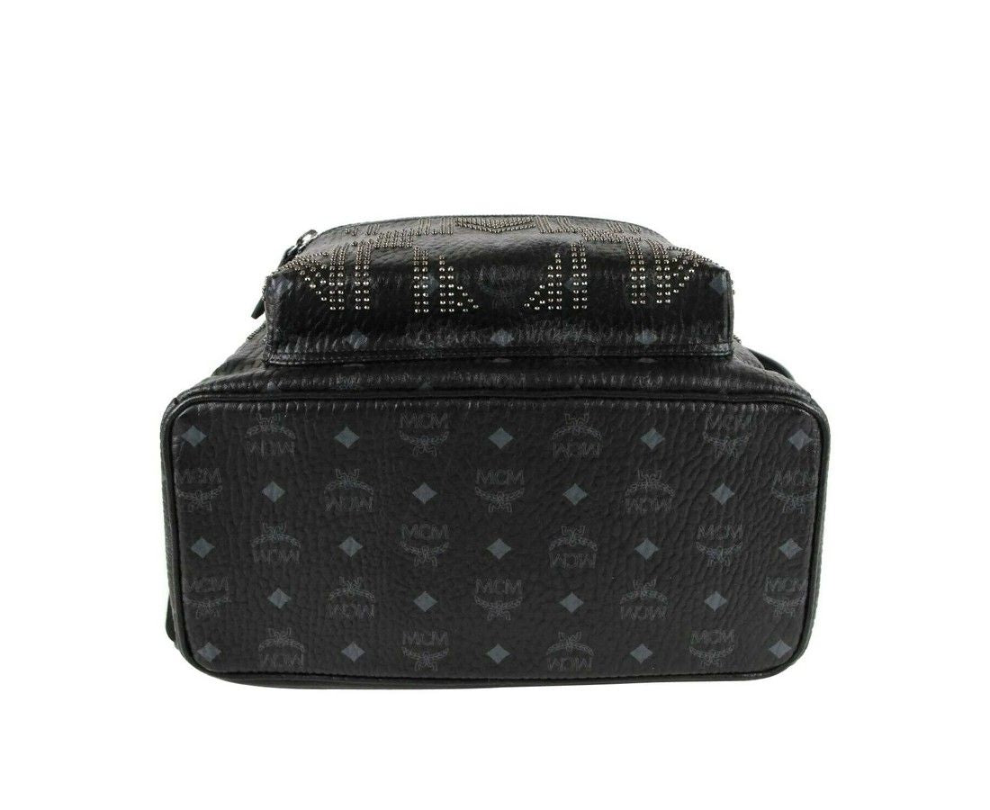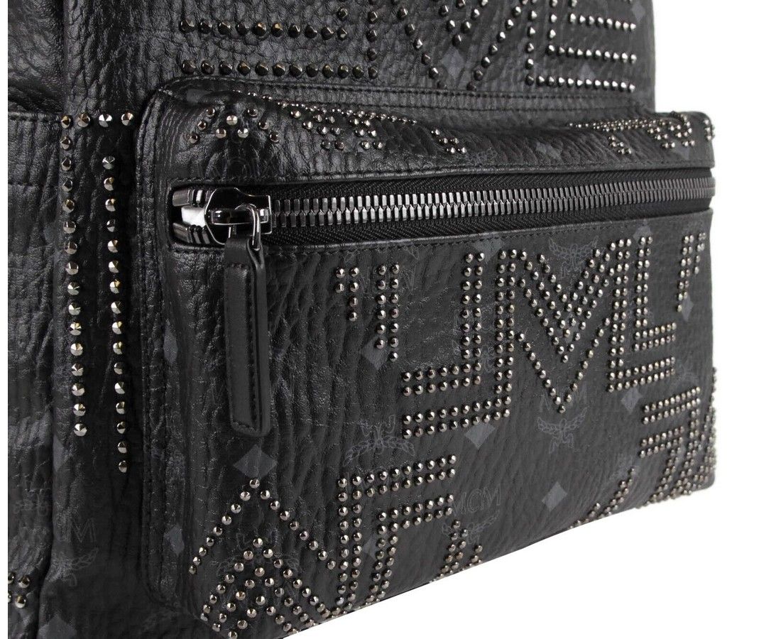Made of Coated Canvas; Leather top handle; Adjustable padded shoulder straps; Front zipped pocket; 2 exterior flat pockets at sides; 2-way zip around closure; Cotton twill lining; Silver cobalt hardware; Accents: Studded; Measurements: Bag Height: 13.25; Bag Depth: 8.25; Bag Width: 16.5; Strap Length: 28 - 35 Inches; Original MCM tags, dust bag and authenticity cards included