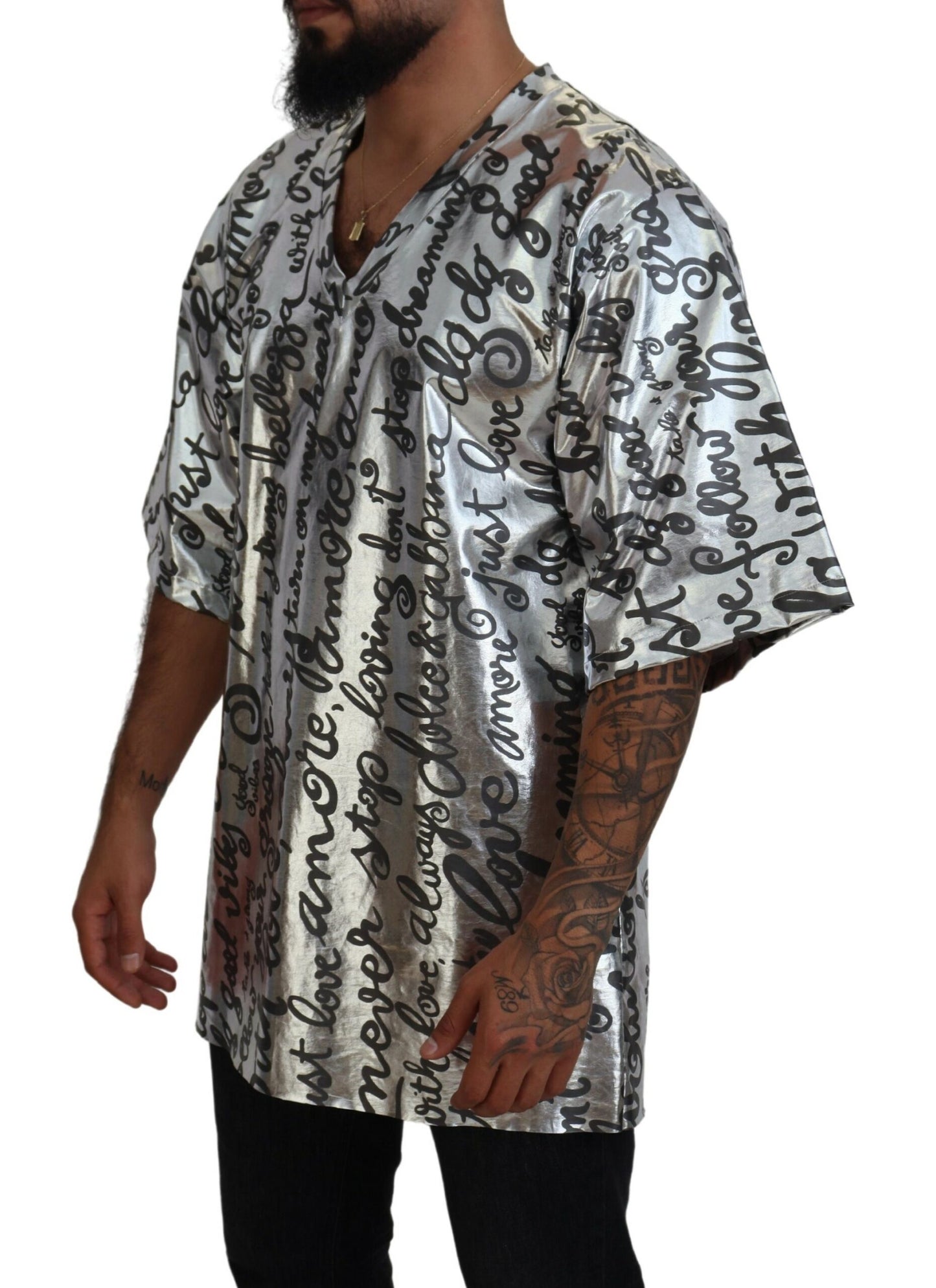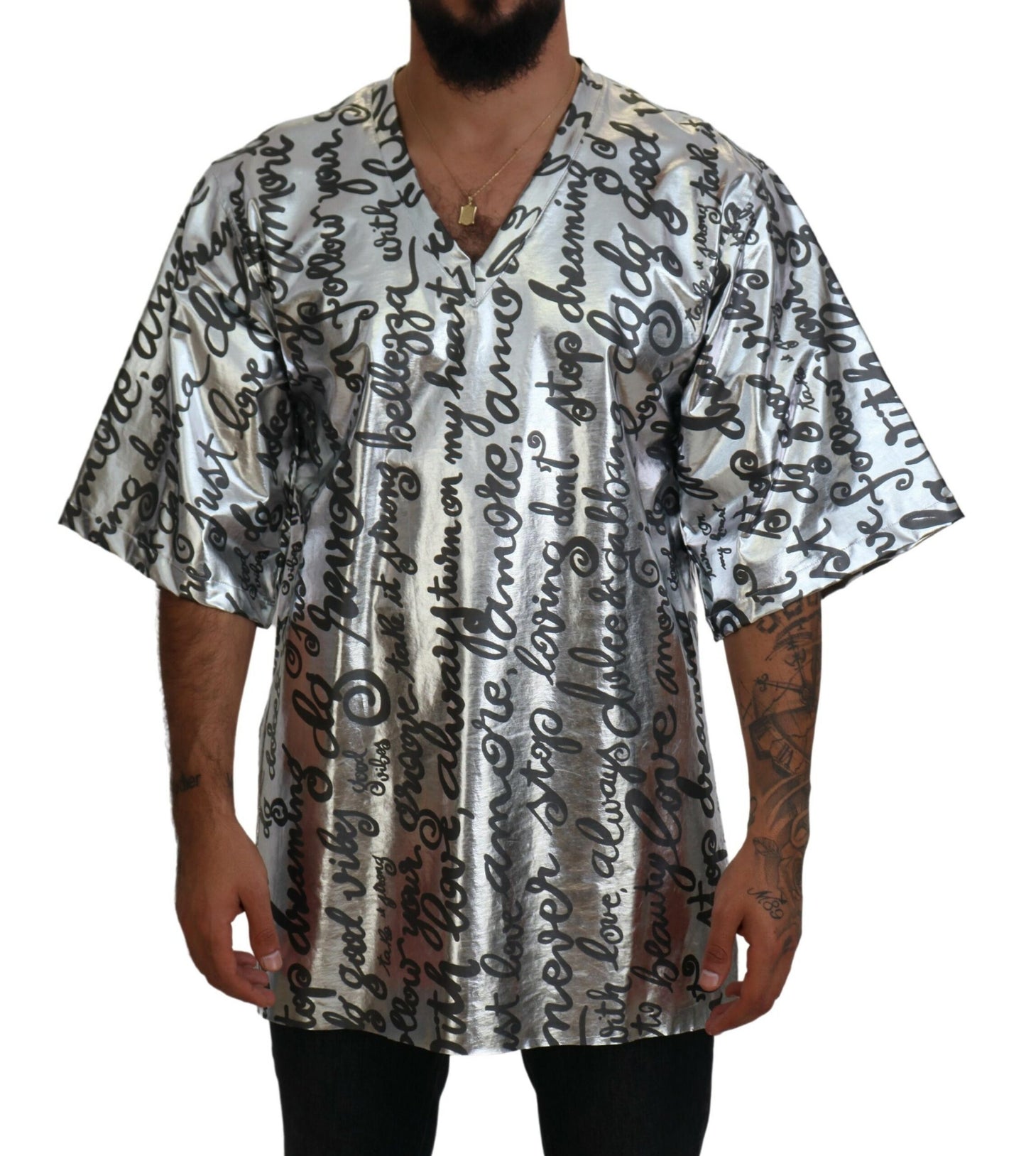 Indulge in the perfect blend of luxury and comfort with this exquisite Dolce & Gabbana short sleeve V-neck T-shirt. Made in Italy, it features a chic silver hue complemented by an elegant logo print. Crafted from premium 100% nylon, this T-shirt offers a regular fit that ensures a sophisticated silhouette. A must-have addition to your wardrobe for a touch of high-fashion allure.