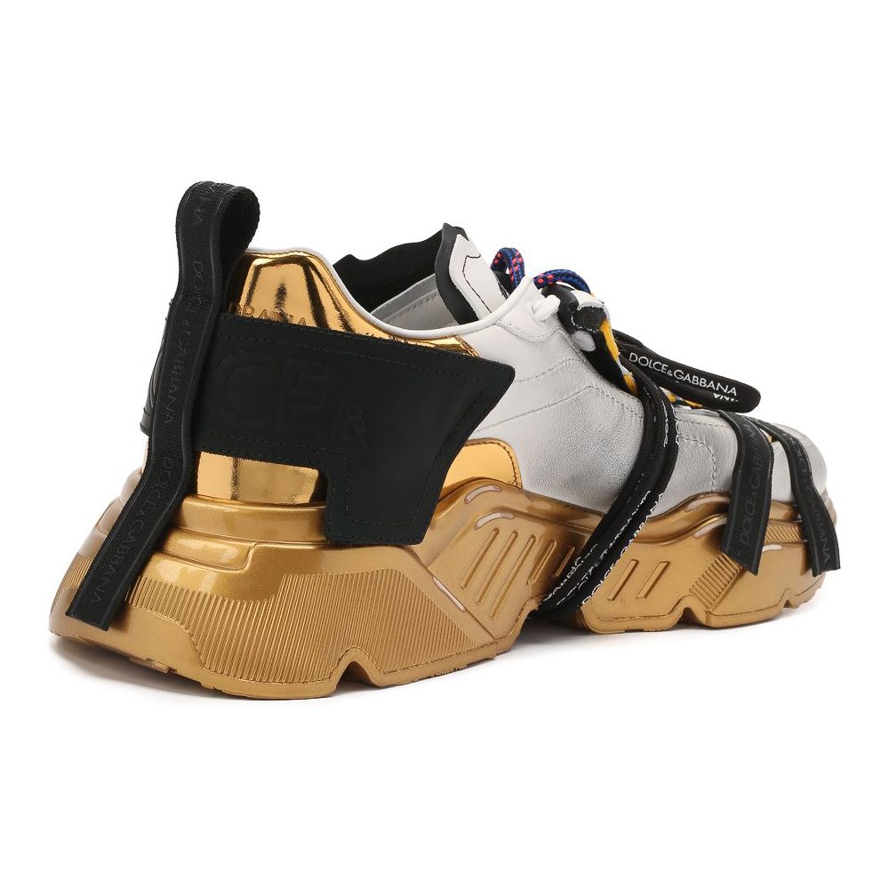 Step up your footwear game with these exquisite men’s sneakers, crafted from 100% calfskin leather, featuring a striking gold patent leather heel counter. The luxurious design is finished with a thick rubber sole adorned with gold chromium plating, adding a touch of opulence to your stride. Embrace the epitome of Italian craftsmanship with this eye-catching pair.