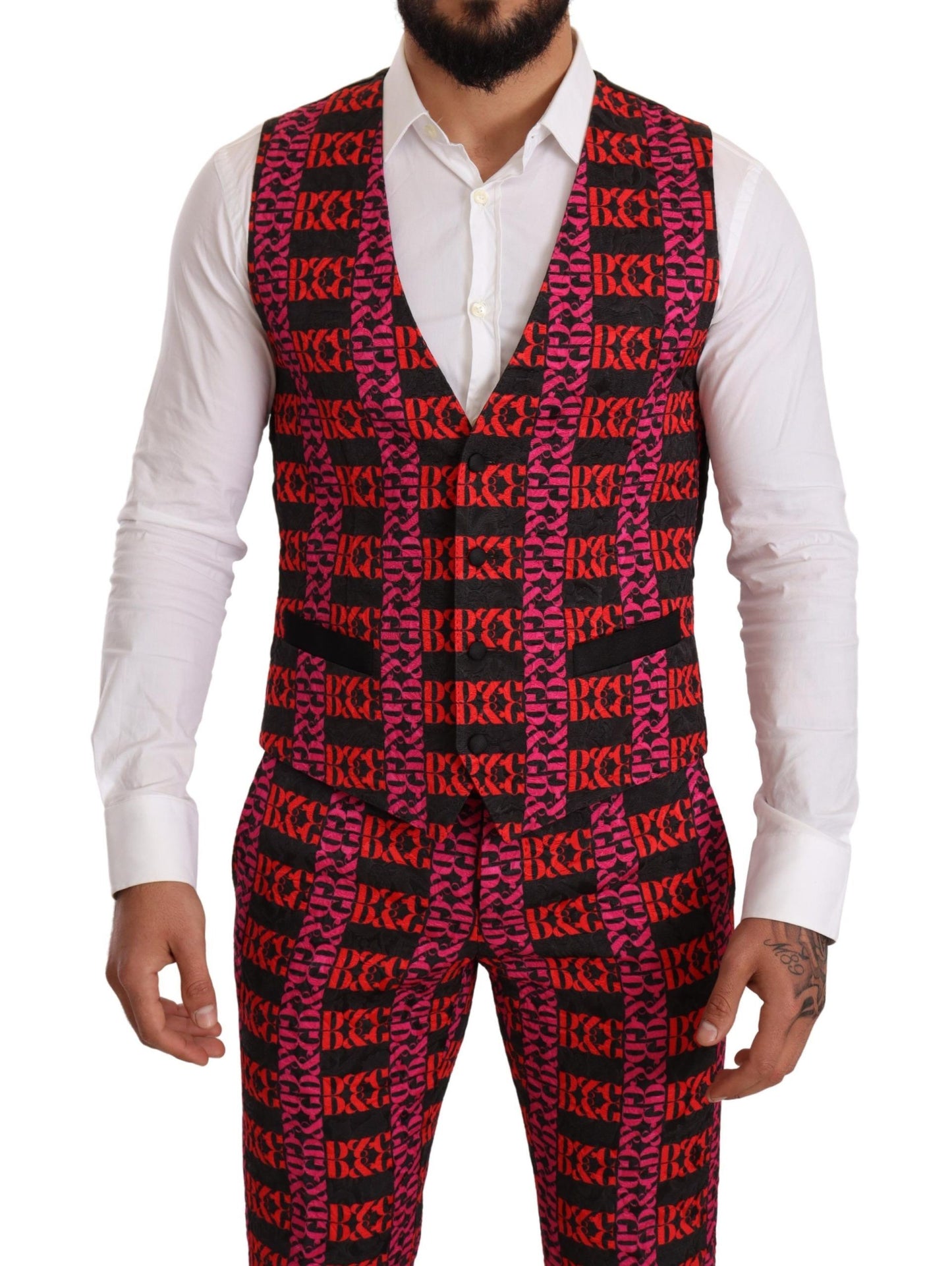 Experience the epitome of sophistication with our stunning three-piece suit from Dolce & Gabbana. The set includes a single-breasted blazer with a standout shawl lapel featuring a contrasting velvet reverse, a stylish vest, and well-tailored pants. Exhibiting a rich multicolor palette with hues of pink, red, and black, this slim-fit ensemble promises to turn heads at any high-profile event. Completed with a one-button blazer closure, adjustable strap-back vest, and convenient 3-way pants zipper, this suit pairs modern style with traditional elegance. Crafted in Italy, it showcases the high craftsmanship that Dolce & Gabbana is renowned for, with luxurious fabric composition and meticulous attention to detail. Perfect for the gentleman who demands both style and quality.