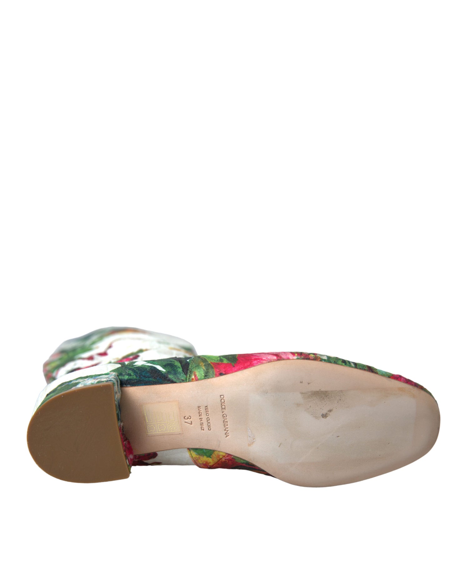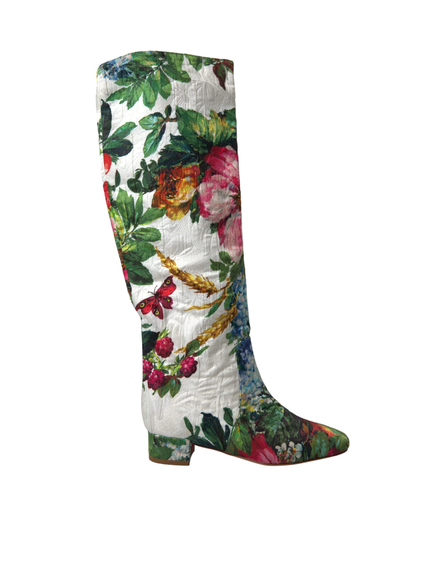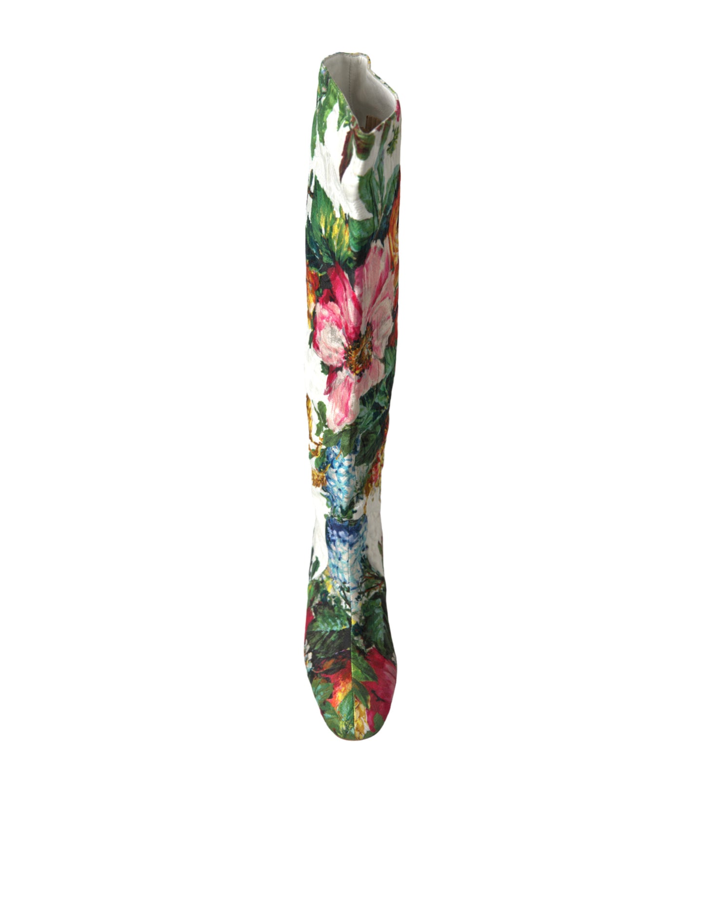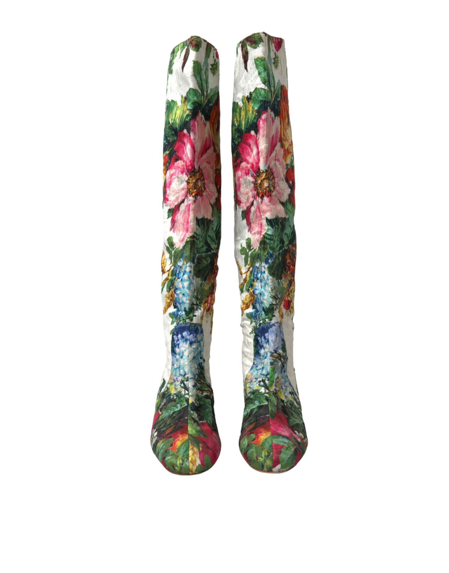 Step into a world of timeless elegance with these stunning knee-high boots by Dolce & Gabbana. Gorgeous and brand new with tags, these 100% Authentic boots showcase a vibrant multicolor floral print that captures the essence of classic Italian fashion. The exquisite brocade material paired with a sleek leather bottom sole radiates luxury with every step. Adorned with subtle logo details, these boots from Dolce & Gabbana are a true masterpiece, made in Italy to perfection.
