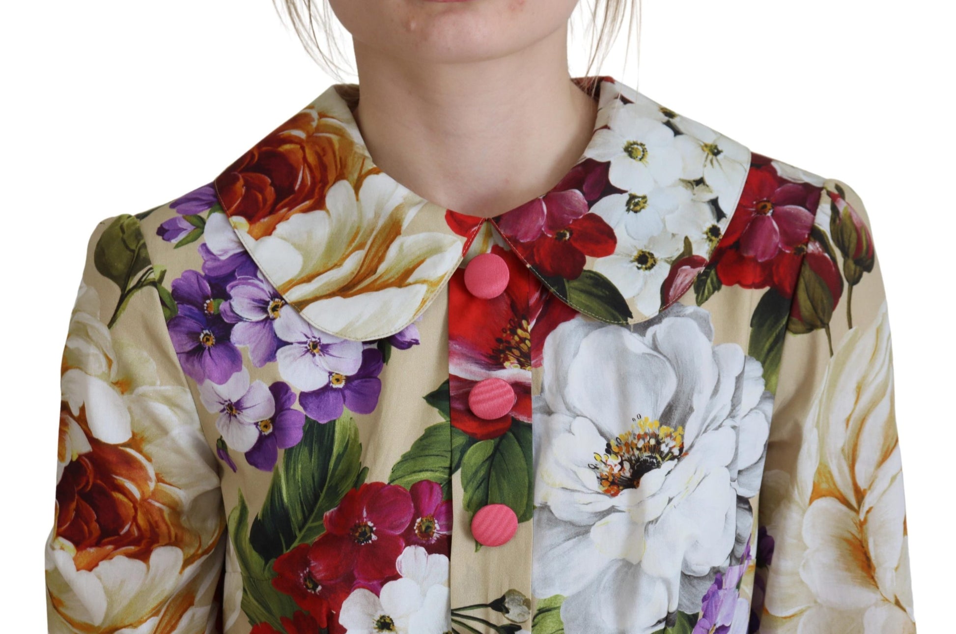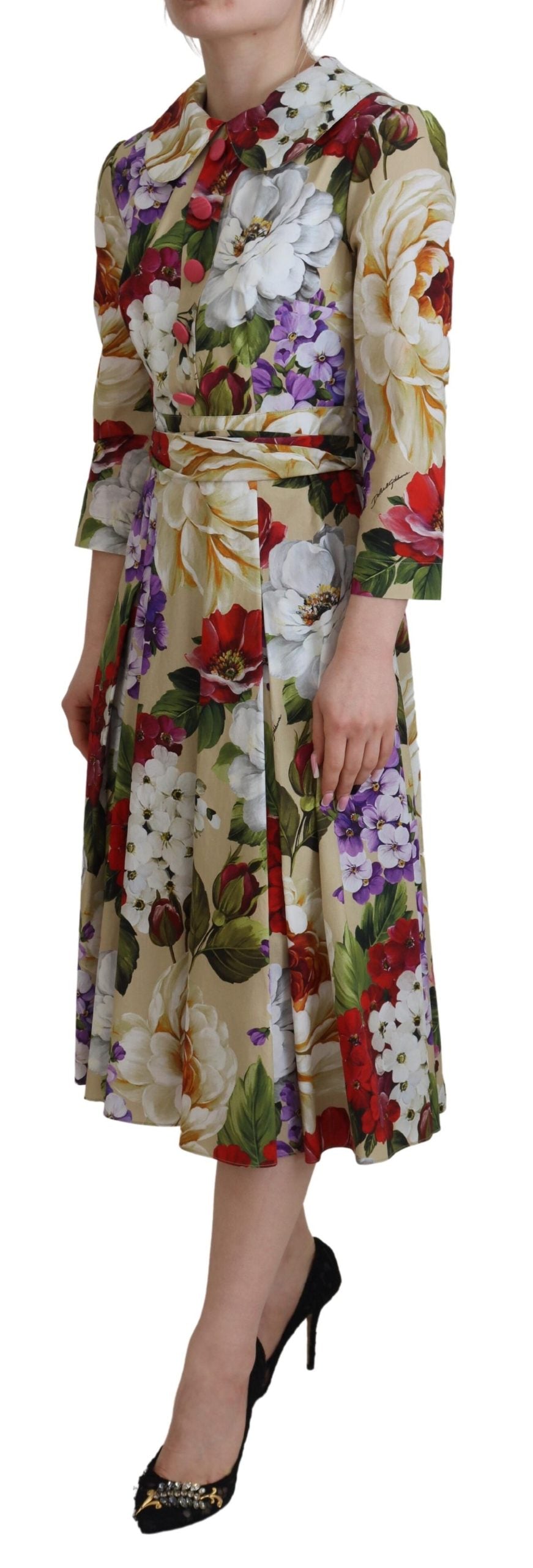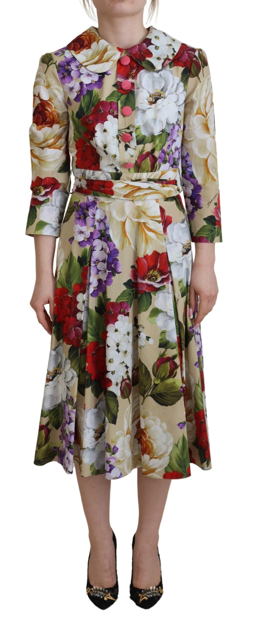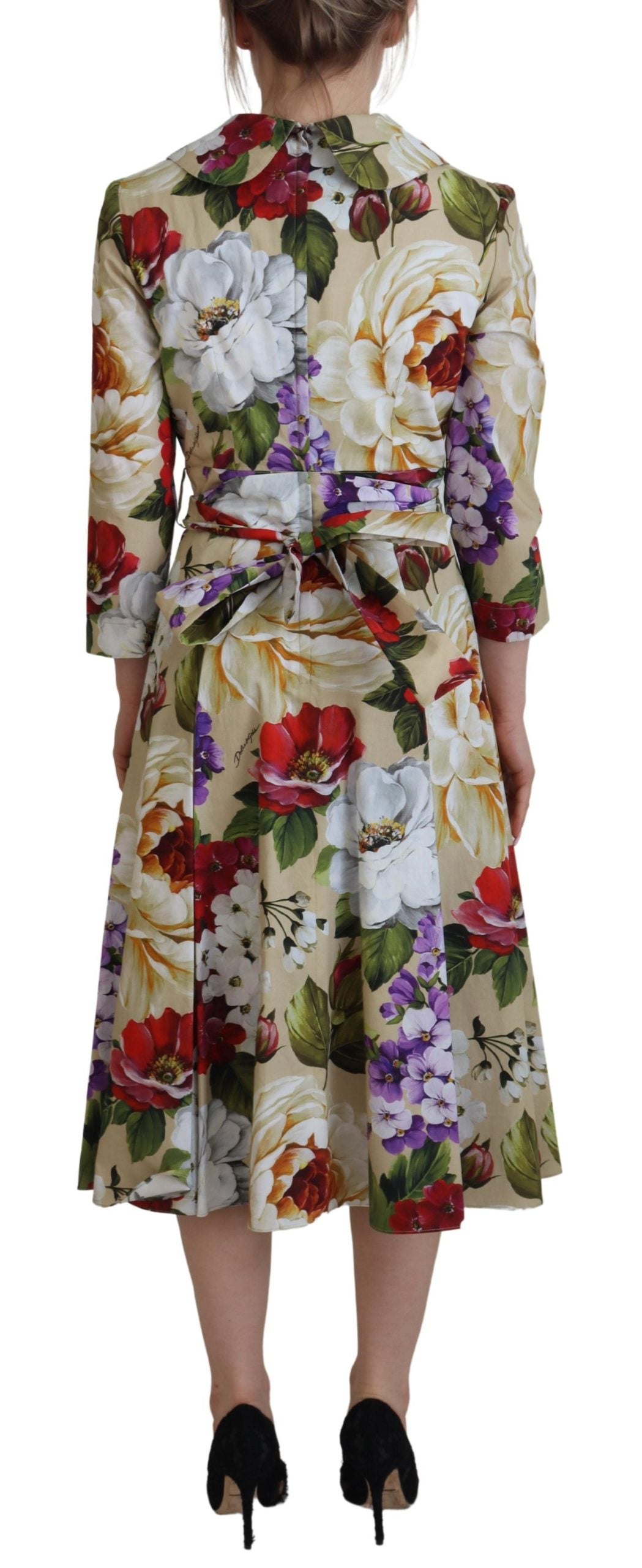 Immerse yourself in the elegance of this stunning Floral Collared Midi Dress, a testament to the luxurious design ethos of Dolce & Gabbana. Crafted from the finest 100% cotton, this piece embodies the brand’s commitment to unmatched quality and striking visuals. Accentuated with the label’s distinctive logo details, this dress boasts an opulent multicolor palette that truly sets it apart. Made in Italy, it exudes exclusivity and supreme craftsmanship. A perfect blend of style and comfort awaits with its cotton lining enhanced by a touch of elastane for a flattering fit.