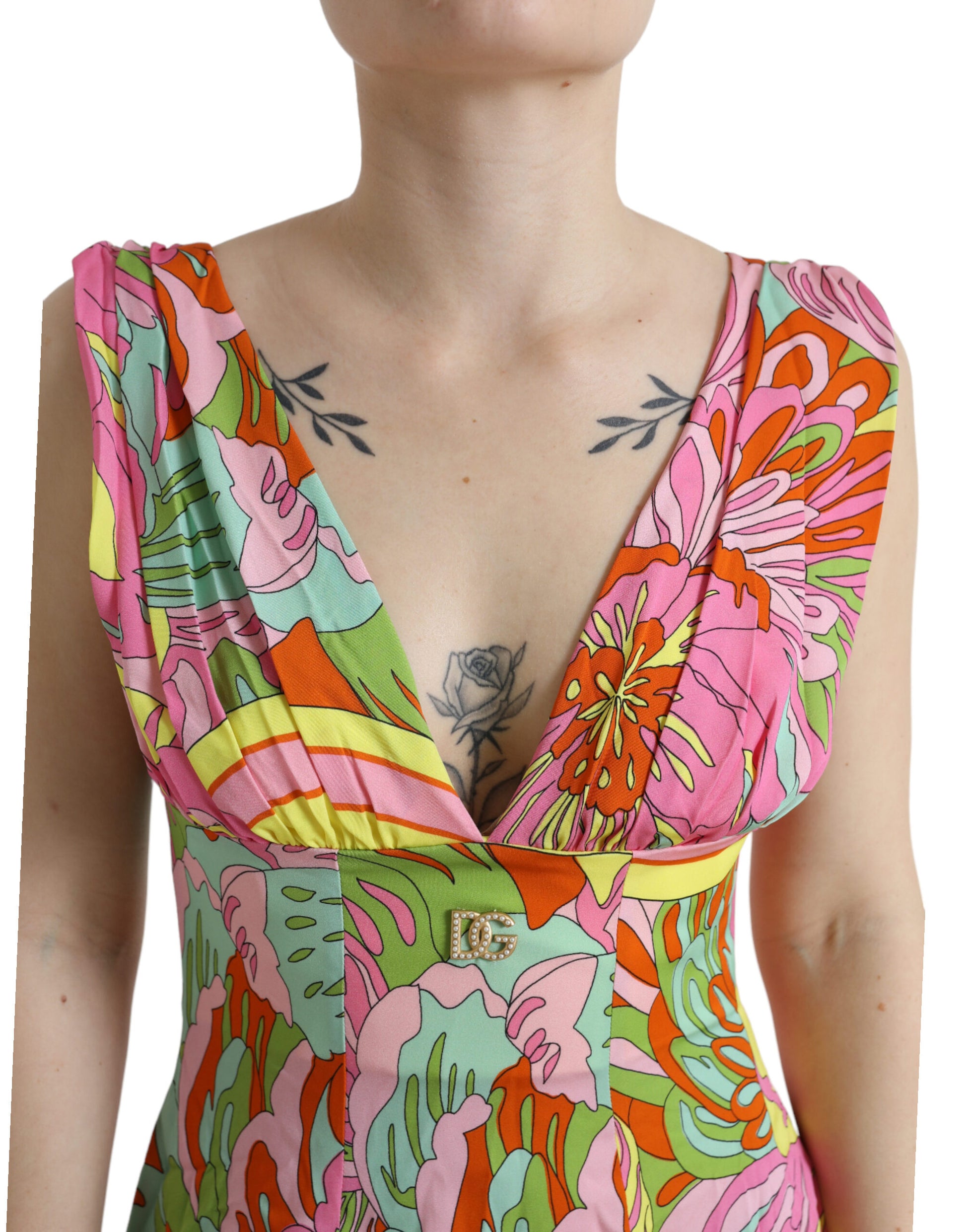 Indulge in the essence of spring with this Gorgeous, brand new, 100% Authentic Dolce & Gabbana floral-print chiffon dress. A romantic multicolor design on luxurious silk fabric, this A-line knee length dress is a timeless addition to your wardrobe. Fasten with ease thanks to the smooth zipper closure, and enjoy the subtle nod to opulence with elegant logo details. Crafted with love in Italy, it’s a piece that speaks to the art of fashion.